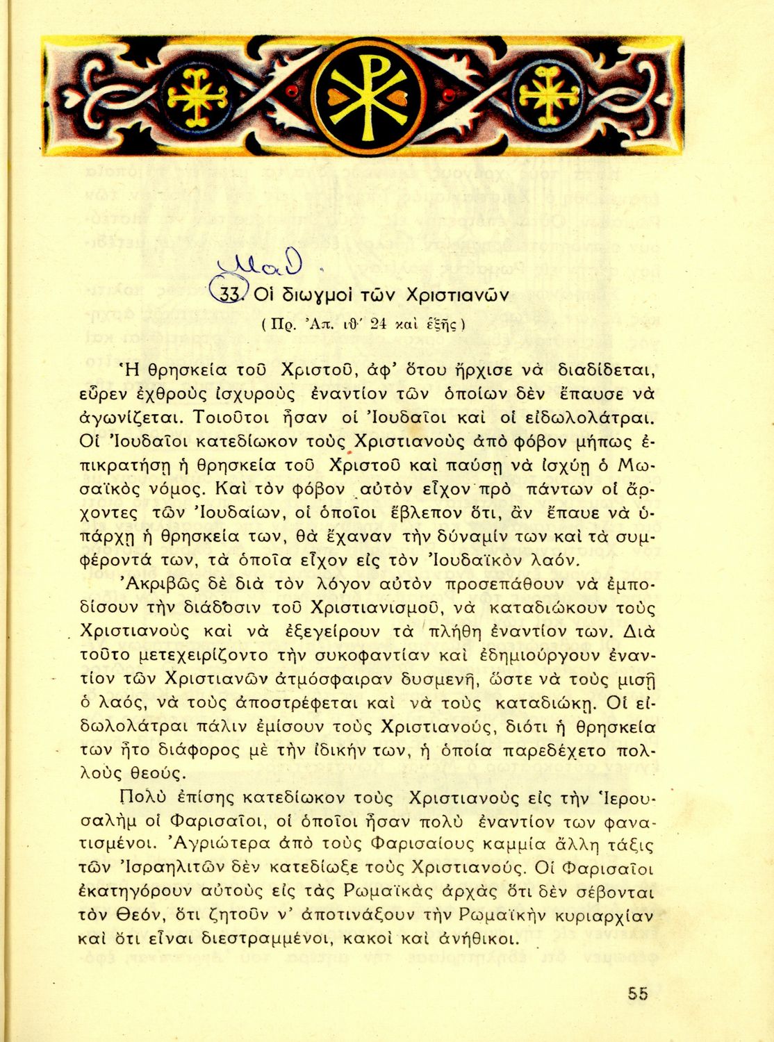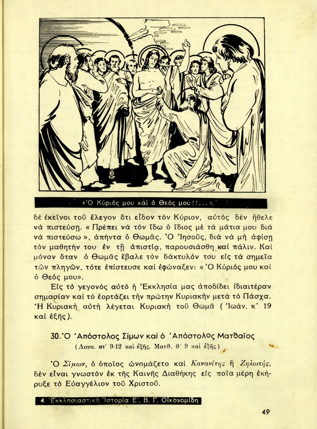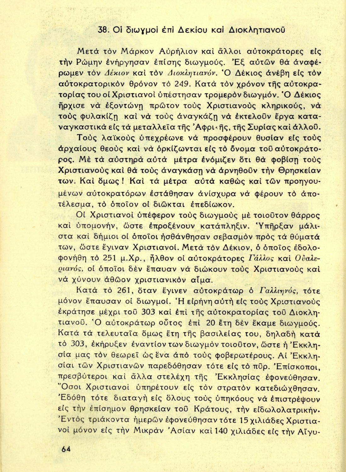 Βαθμίδα εκπαίδευσης: Πρωτοβάθμια Τάξη: Ε' Δημοτικού Μάθημα: Θρησκευτικά Γλώσσα: Απλή καθαρεύουσα Παρουσίαση περιεχομένου: Μαθητικό βοήθημα Θρησκευτικών Ε΄ Δημοτικού που αποτελεί μια ιστορική επισκόπηση της Ορθόδοξης Εκκλησίας από την ομιλία του Πέτρου και την ίδρυση της πρώτης χριστιανικής Εκκλησίας μέχρι την ίδρυση της Εκκλησίας της Ελλάδας. |