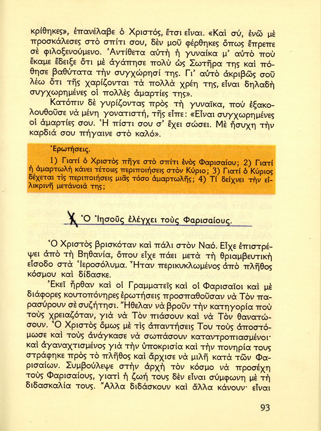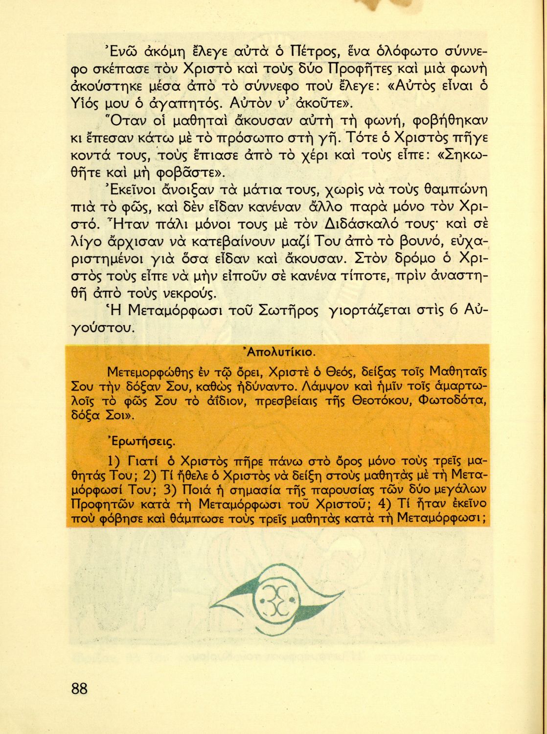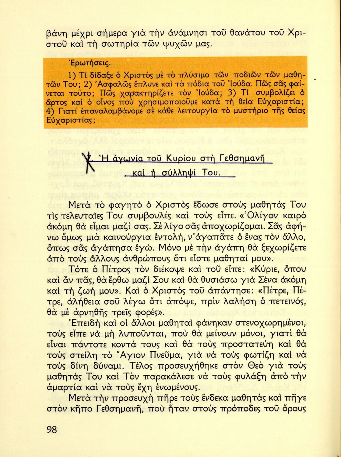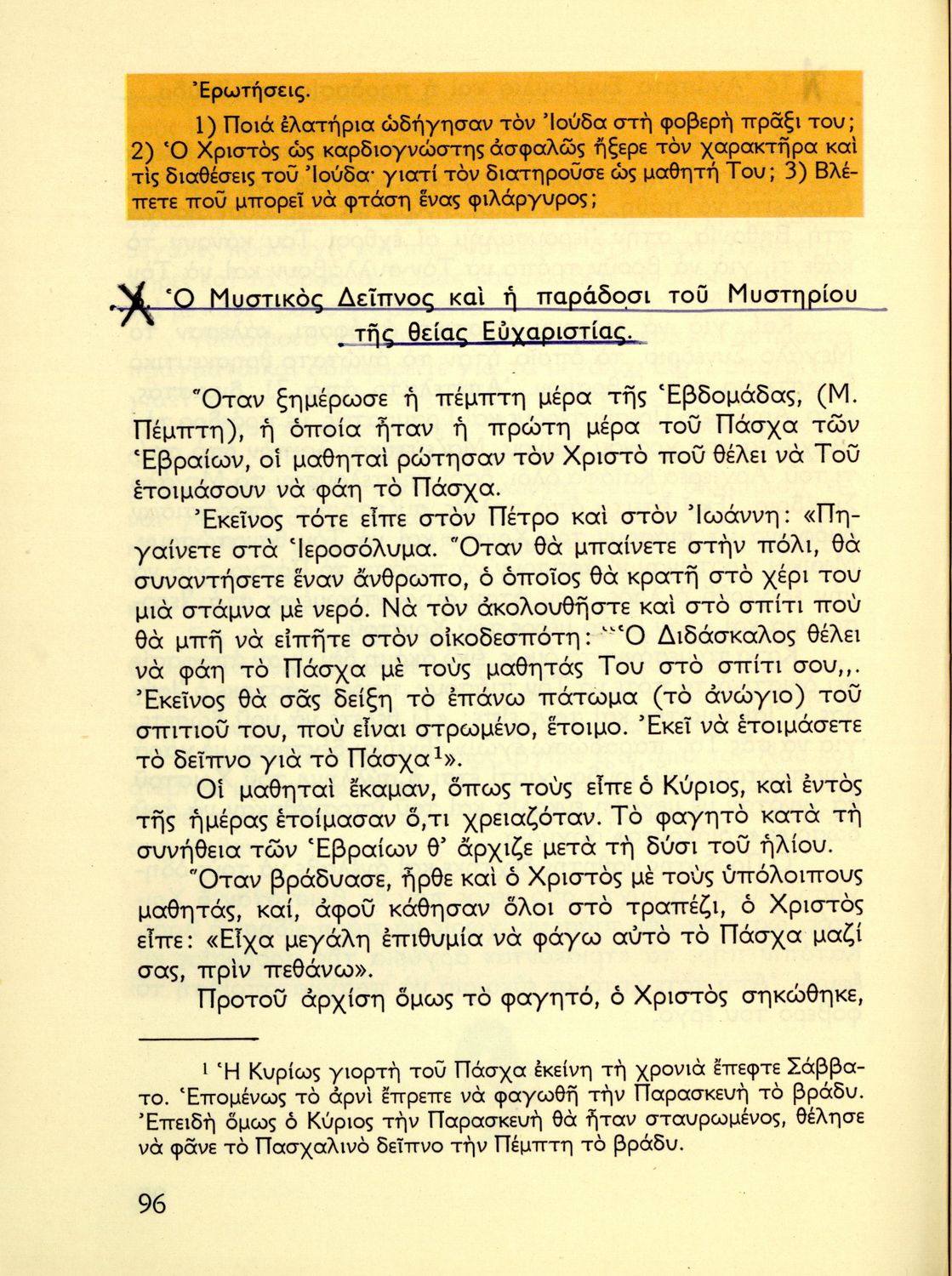 Παρουσίαση περιεχομένου: Σχολικό εγχειρίδιο Θρησκευτικών Δ΄ Δημοτικού που αποτελεί μια εξιστόρηση της Καινής Διαθήκης από τη γέννηση της Θεοτόκου μέχρι την ανάληψη του Χριστού. Περιέχει προσευχές και στοιχεία γεωγραφίας της Παλαιστίνης. Φέρει το σύμβολο της δικτατορίας.
