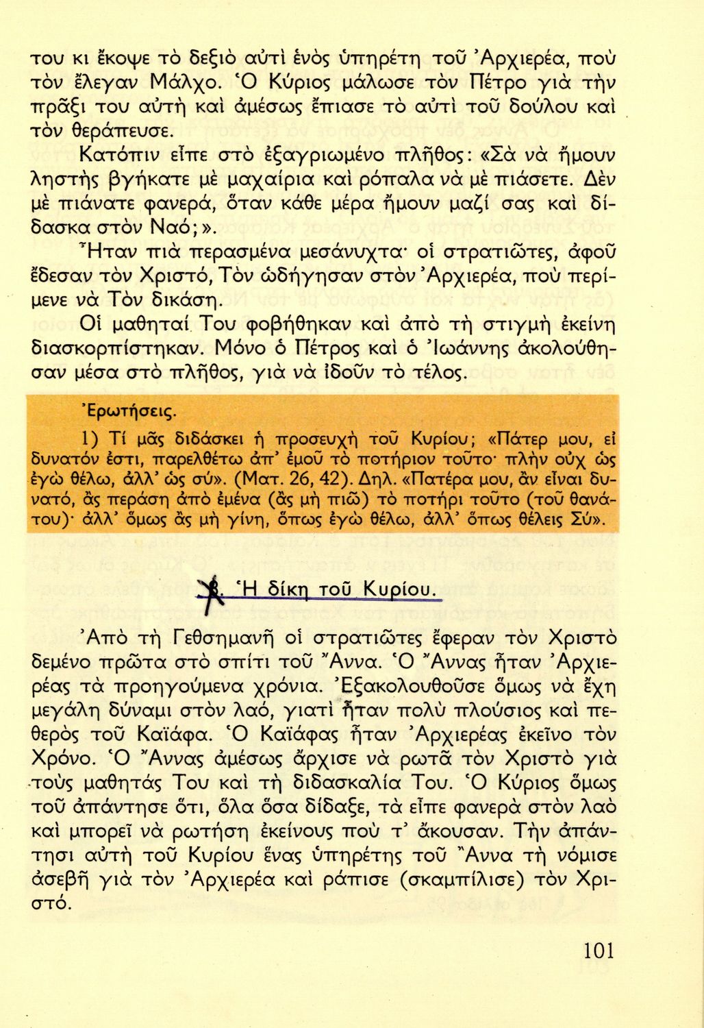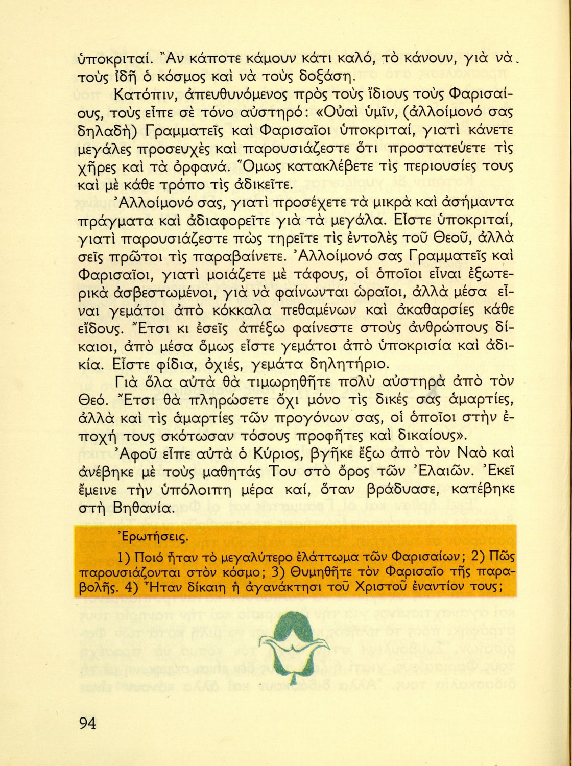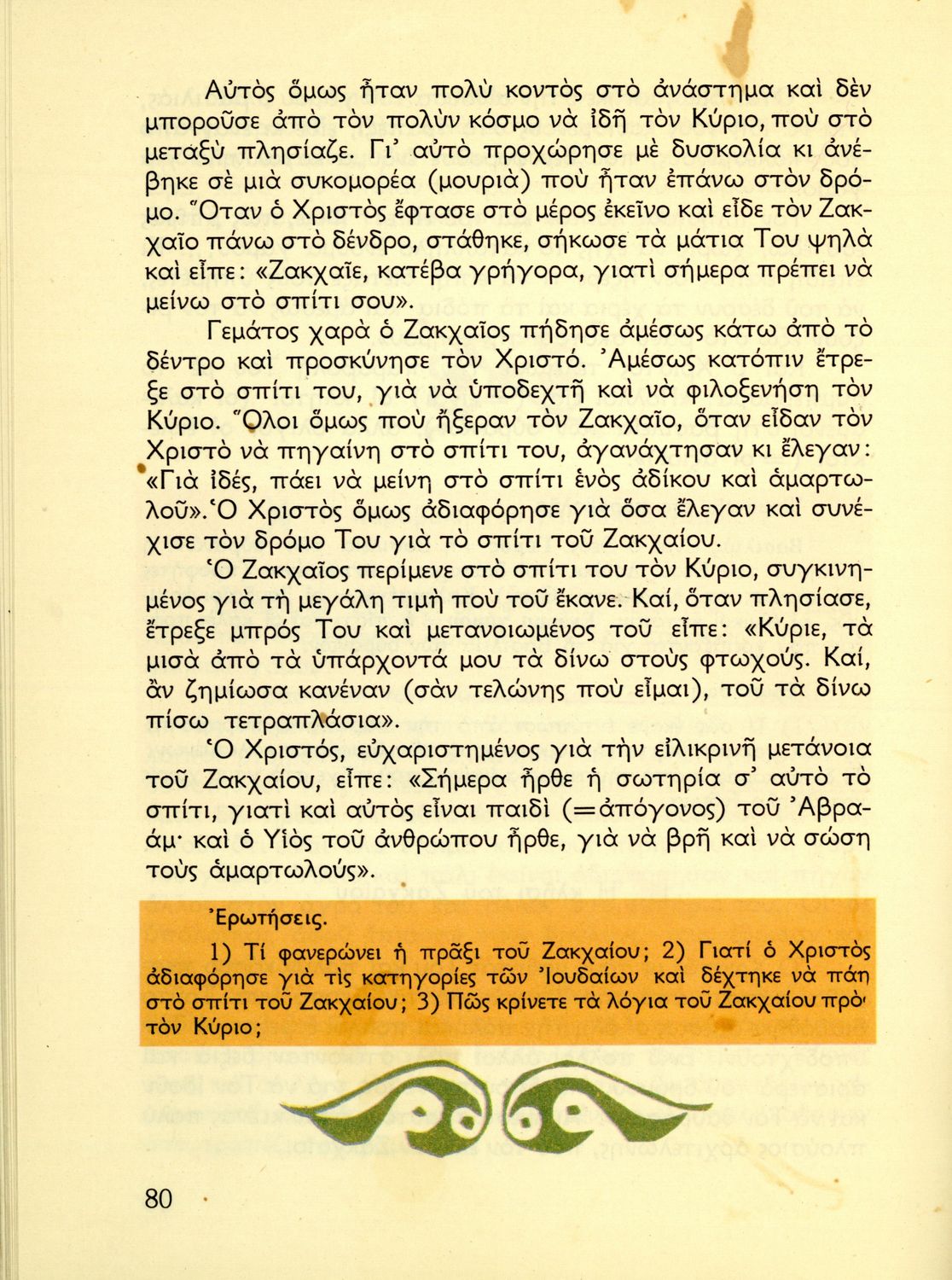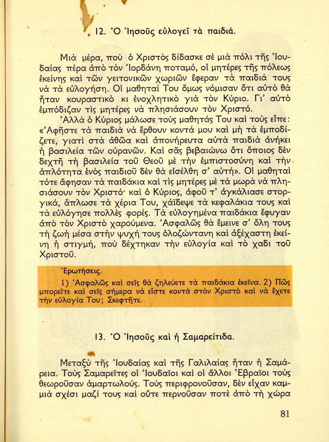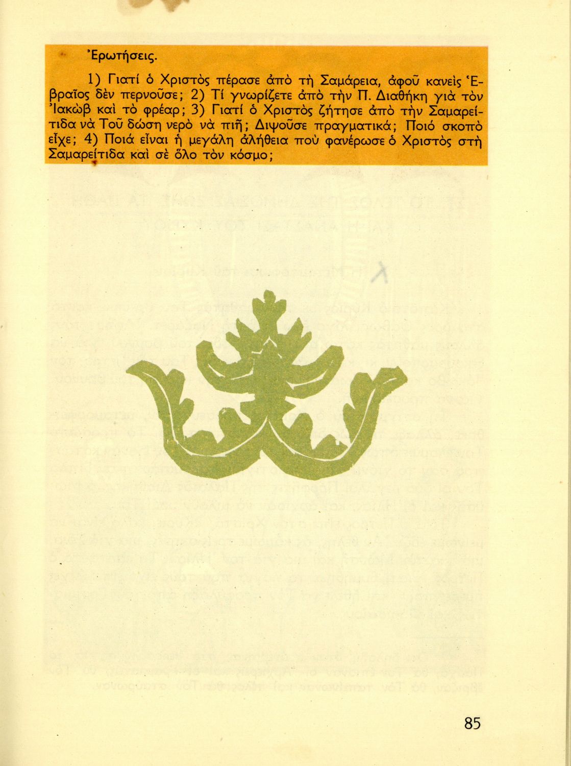Σχολικό εγχειρίδιο Θρησκευτικών Δ΄ Δημοτικού που αποτελεί μια εξιστόρηση της Καινής Διαθήκης από τη γέννηση της Θεοτόκου μέχρι την ανάληψη του Χριστού. Περιέχει προσευχές και στοιχεία γεωγραφίας της Παλαιστίνης. Φέρει το σύμβολο της δικτατορίας.