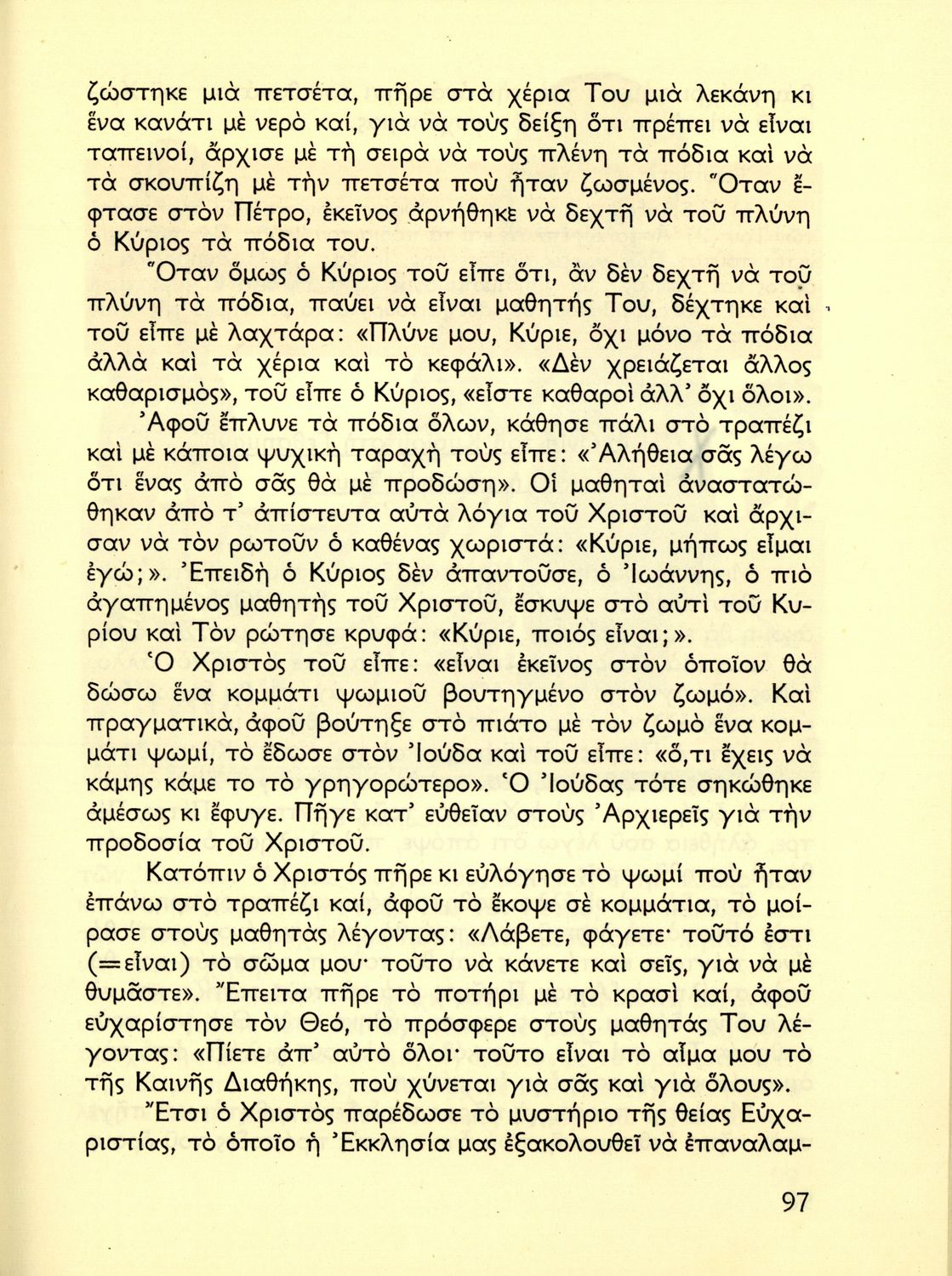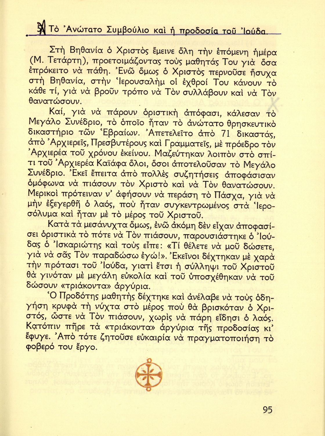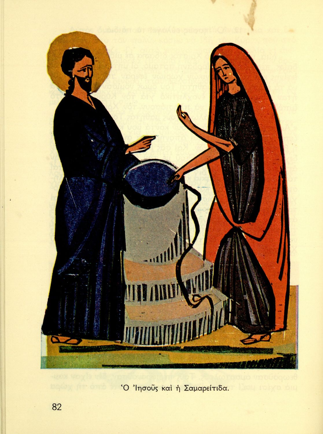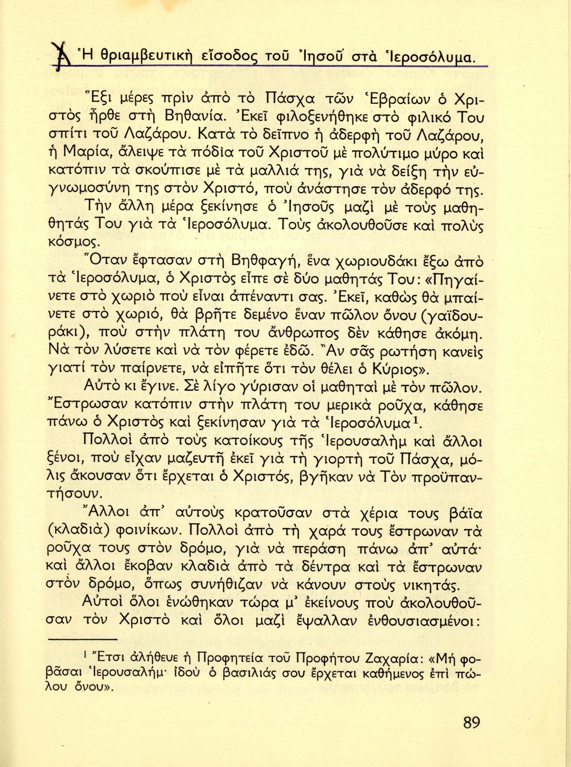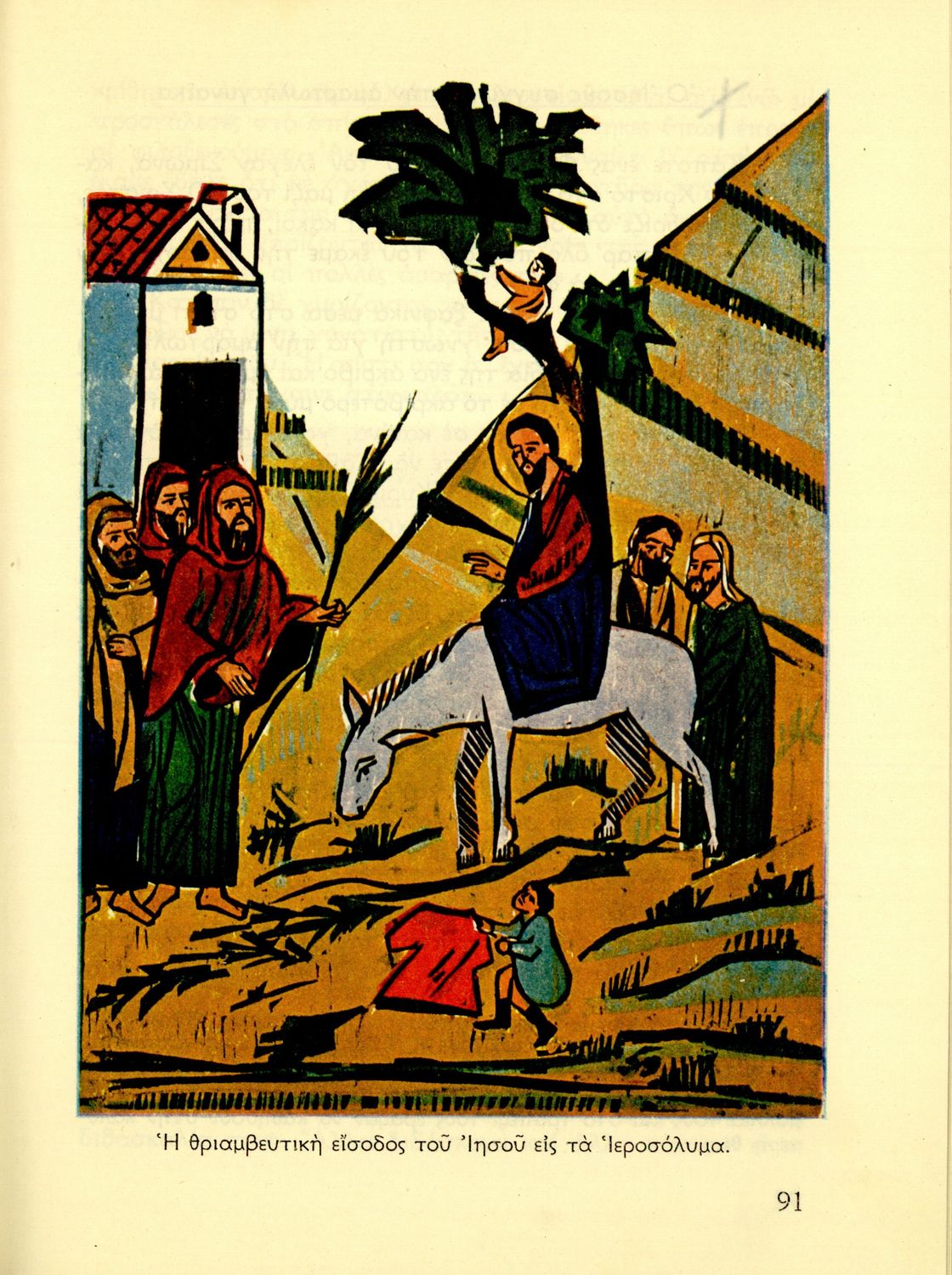 Σχολικό εγχειρίδιο Θρησκευτικών Δ΄ Δημοτικού που αποτελεί μια εξιστόρηση της Καινής Διαθήκης από τη γέννηση της Θεοτόκου μέχρι την ανάληψη του Χριστού. Περιέχει προσευχές και στοιχεία γεωγραφίας της Παλαιστίνης. Φέρει το σύμβολο της δικτατορίας.