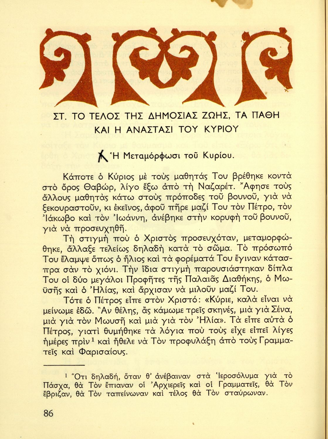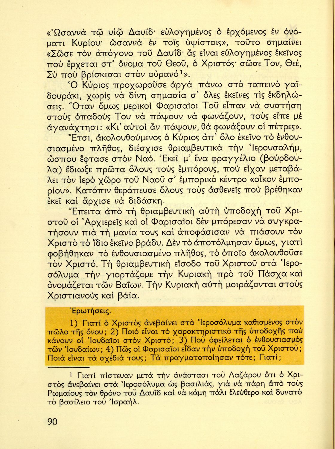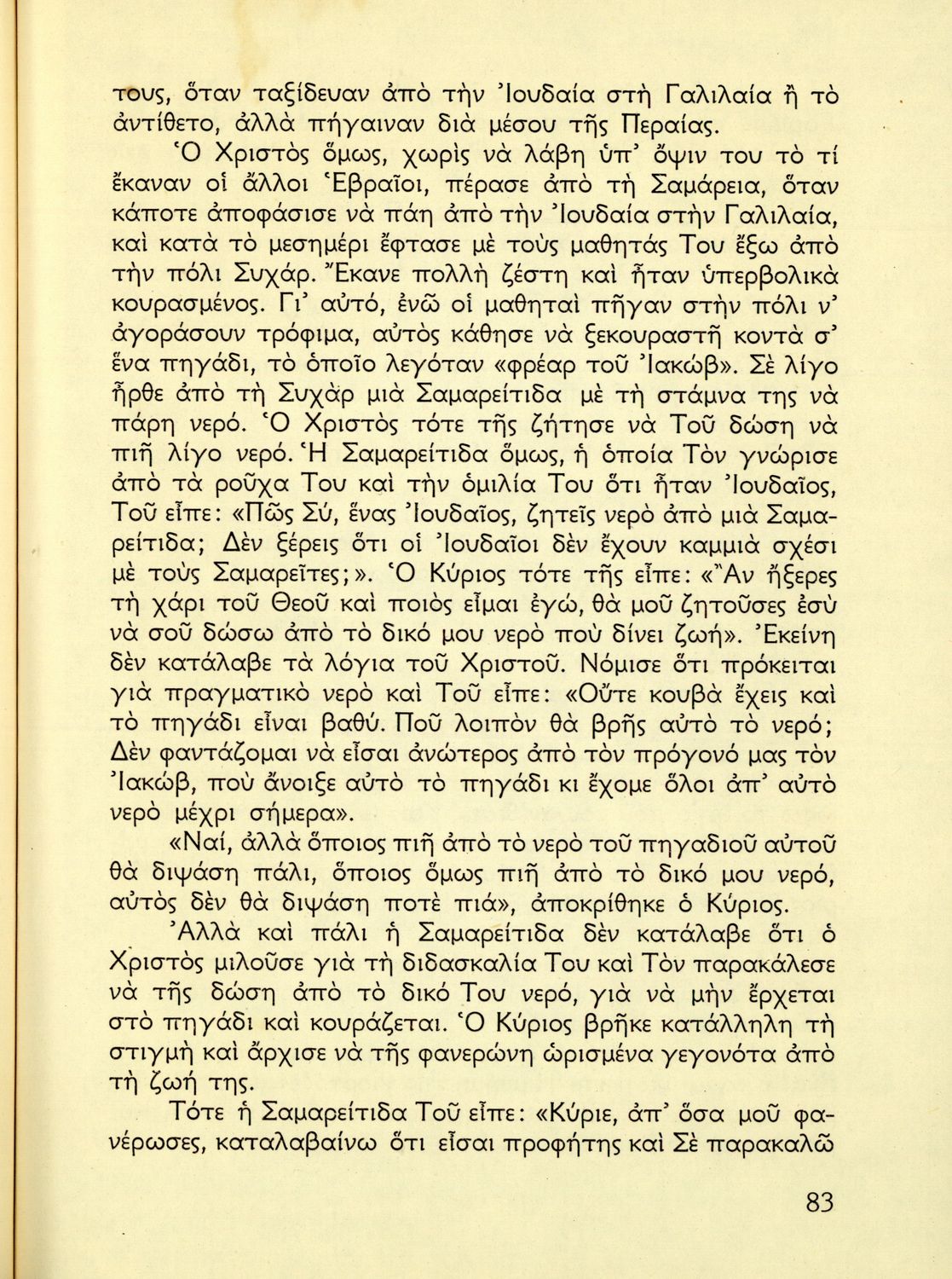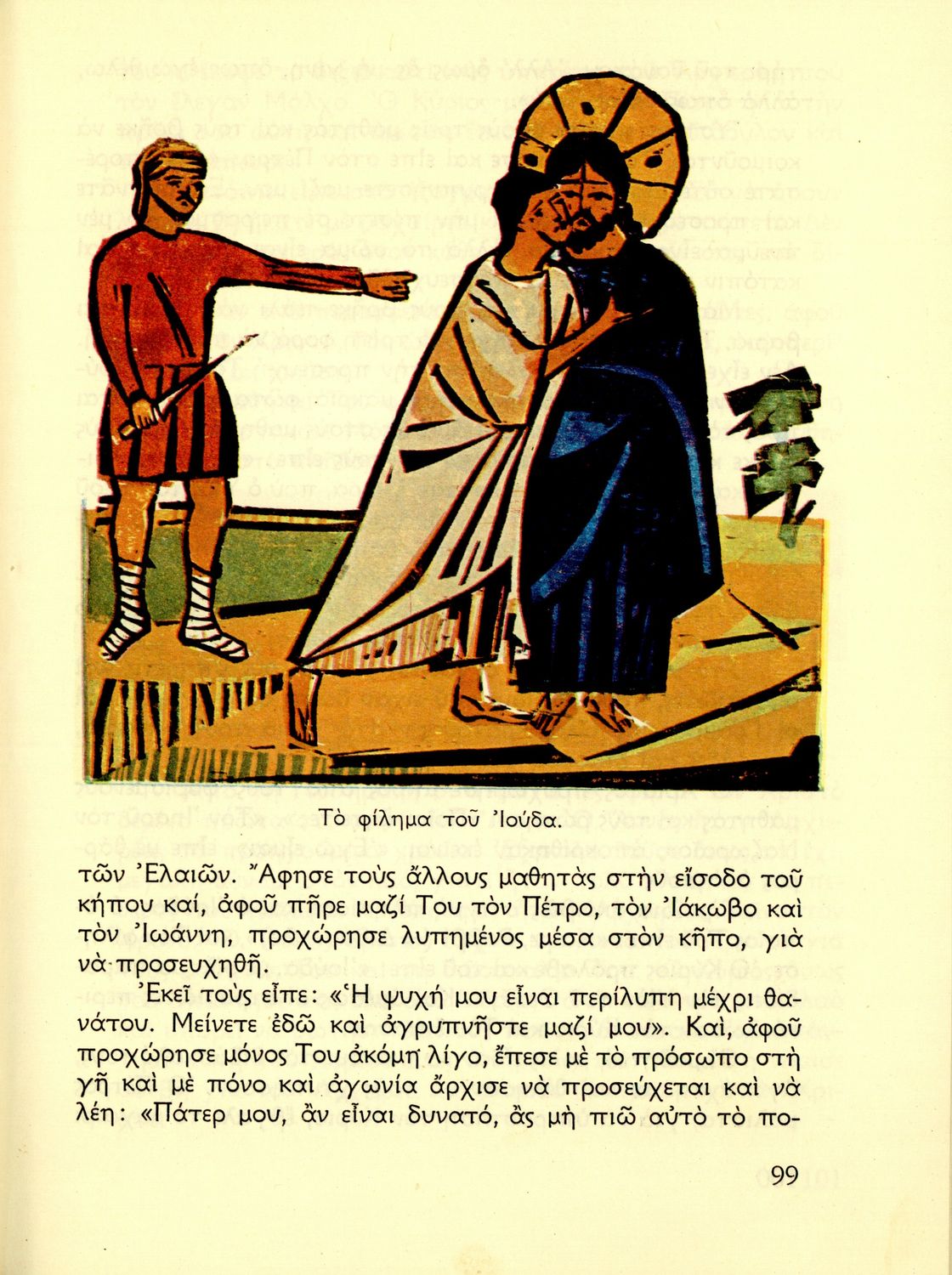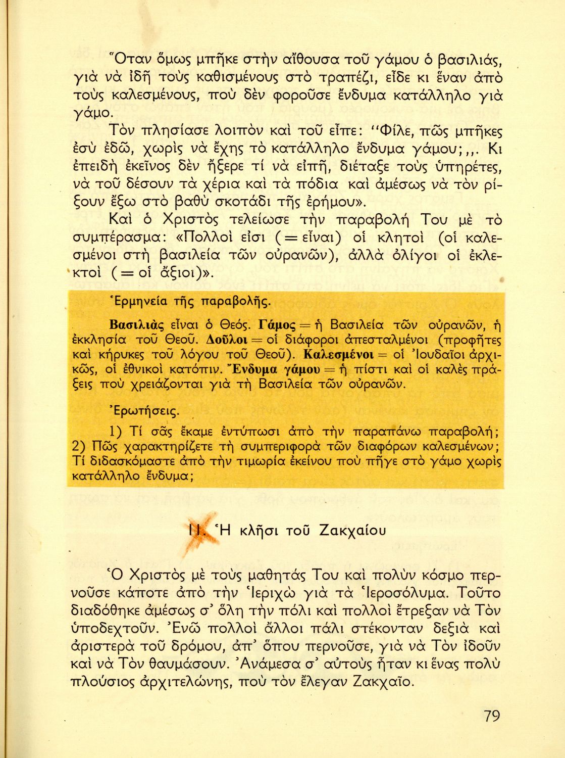 Σχολικό εγχειρίδιο Θρησκευτικών Δ΄ Δημοτικού που αποτελεί μια εξιστόρηση της Καινής Διαθήκης από τη γέννηση της Θεοτόκου μέχρι την ανάληψη του Χριστού. Περιέχει προσευχές και στοιχεία γεωγραφίας της Παλαιστίνης. Φέρει το σύμβολο της δικτατορίας.