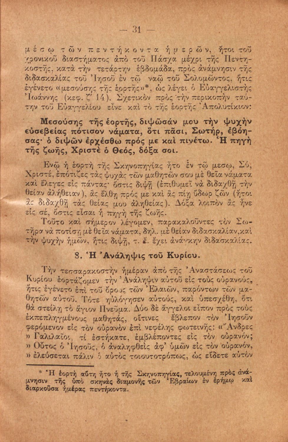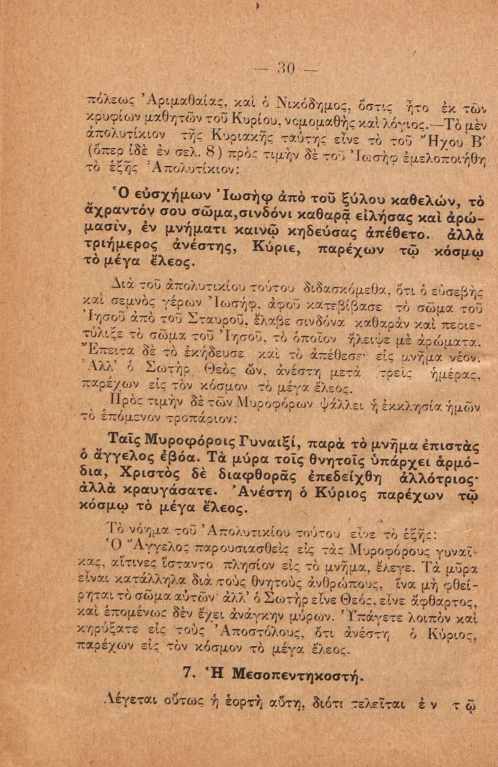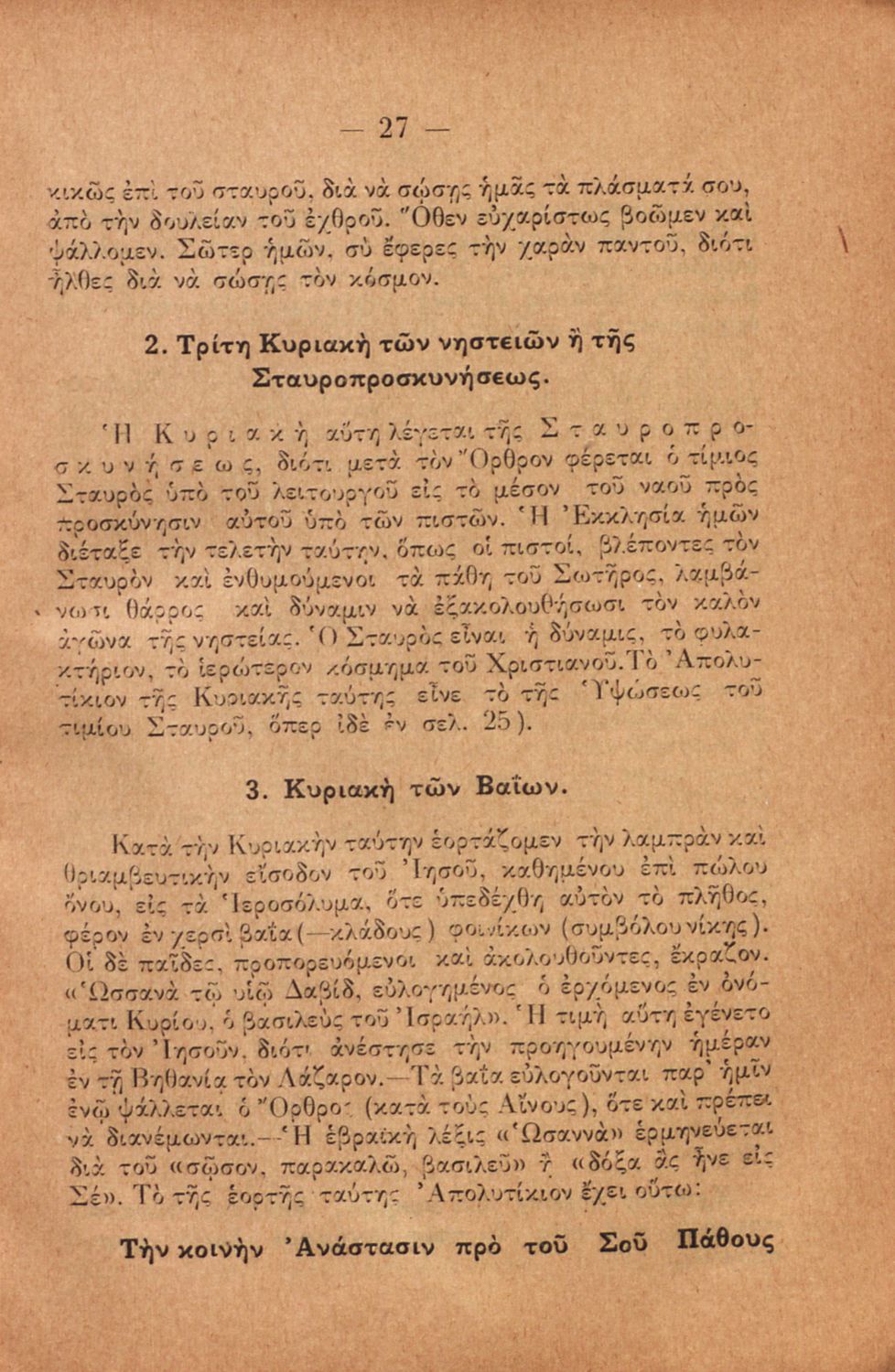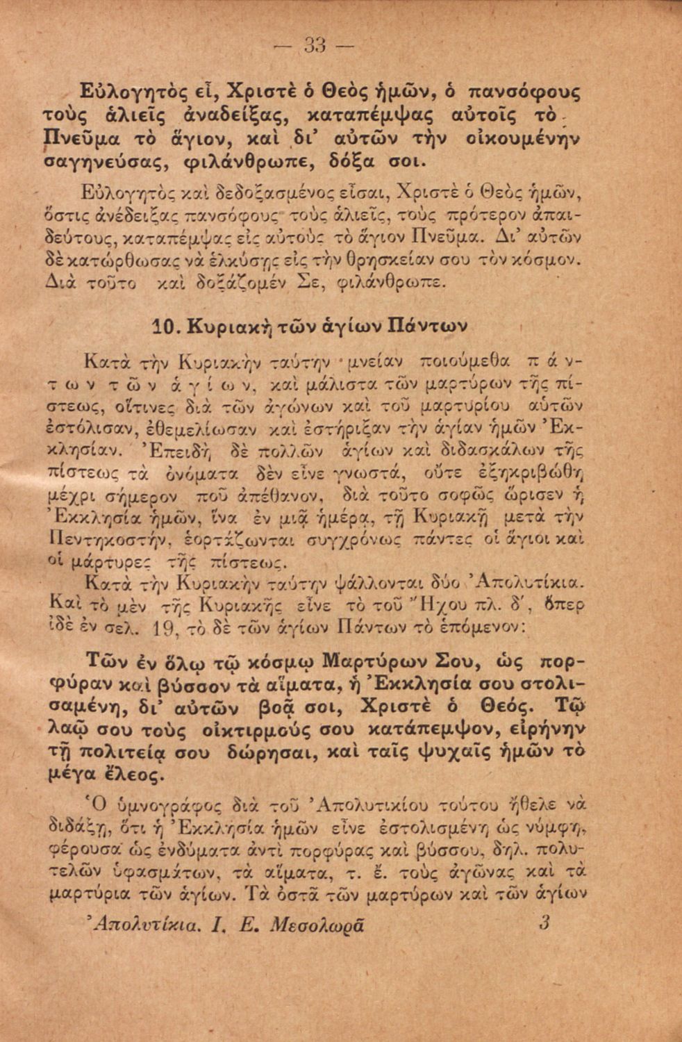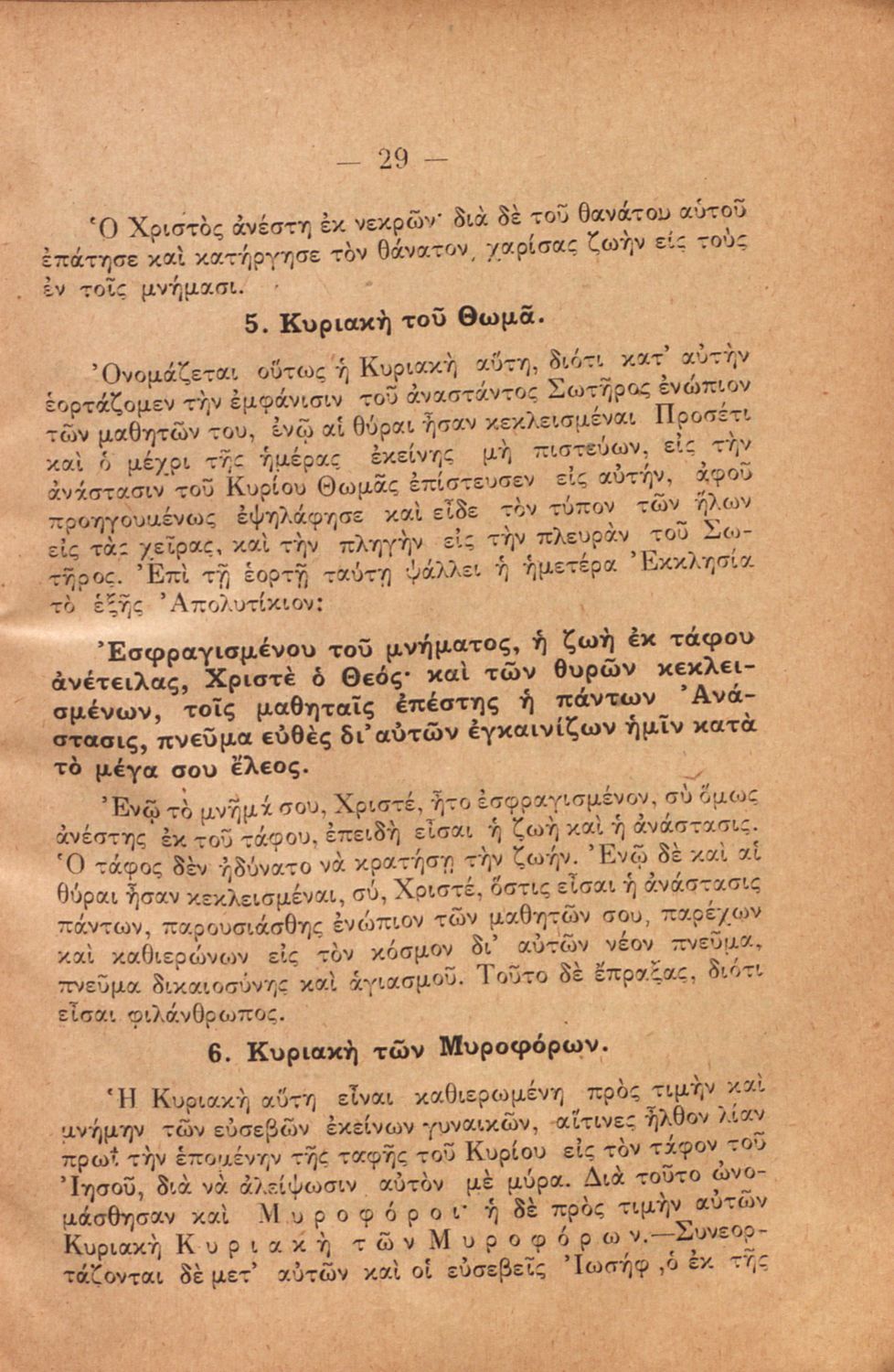 Σχολικό εγχειρίδιο Θρησκευτικών για τα Ελληνικά Σχολεία και Παρθεναγωγεία που αποτελεί μια ερμηνευτική ανάλυση των απολυτικίων των Αγίων και των τροπαρίων της Μεγάλης Εβδομάδας.