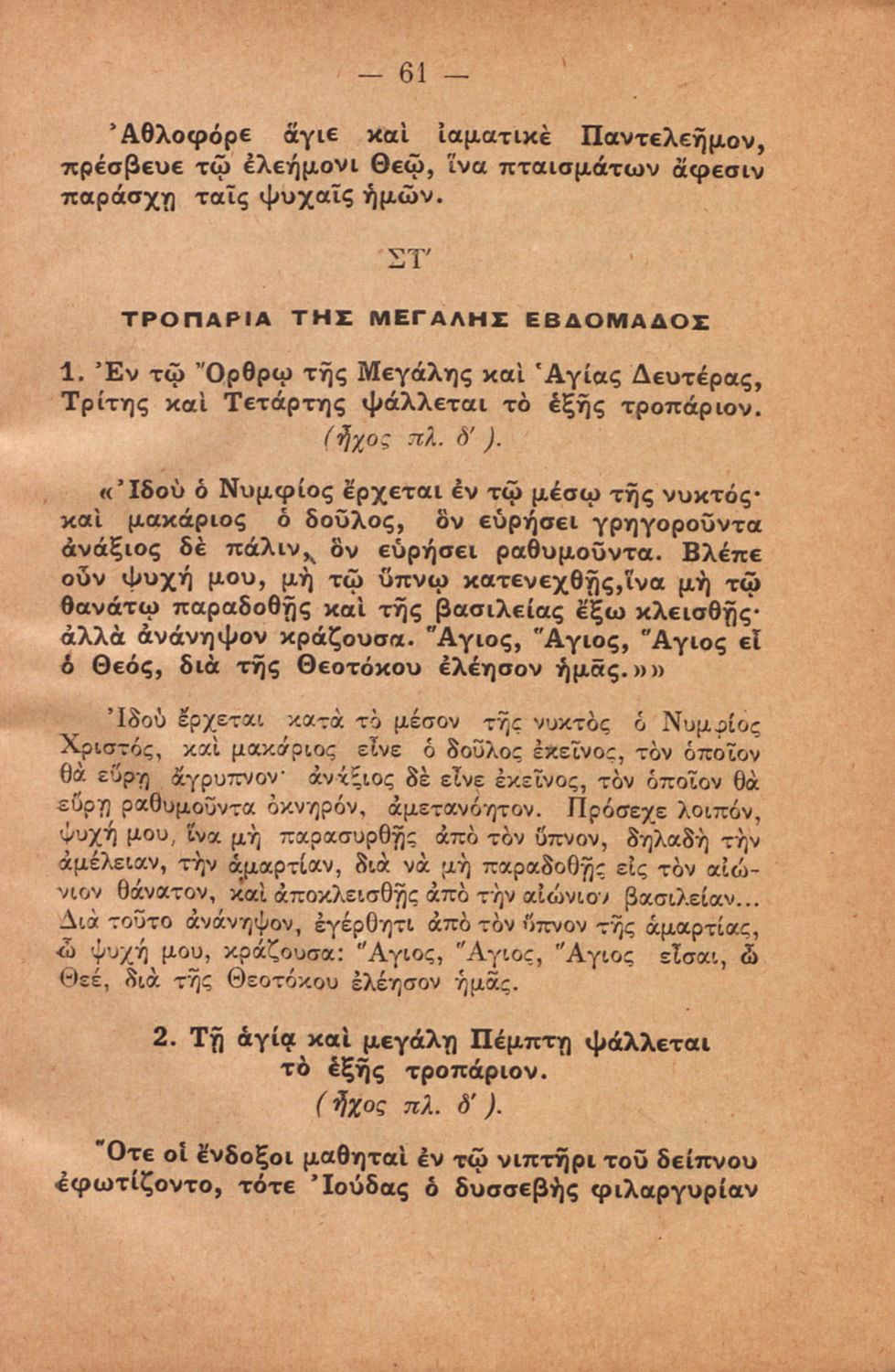 Παρουσίαση περιεχομένου: Σχολικό εγχειρίδιο Θρησκευτικών για τα Ελληνικά Σχολεία και Παρθεναγωγεία που αποτελεί μια ερμηνευτική ανάλυση των απολυτικίων των Αγίων και των τροπαρίων της Μεγάλης Εβδομάδας.