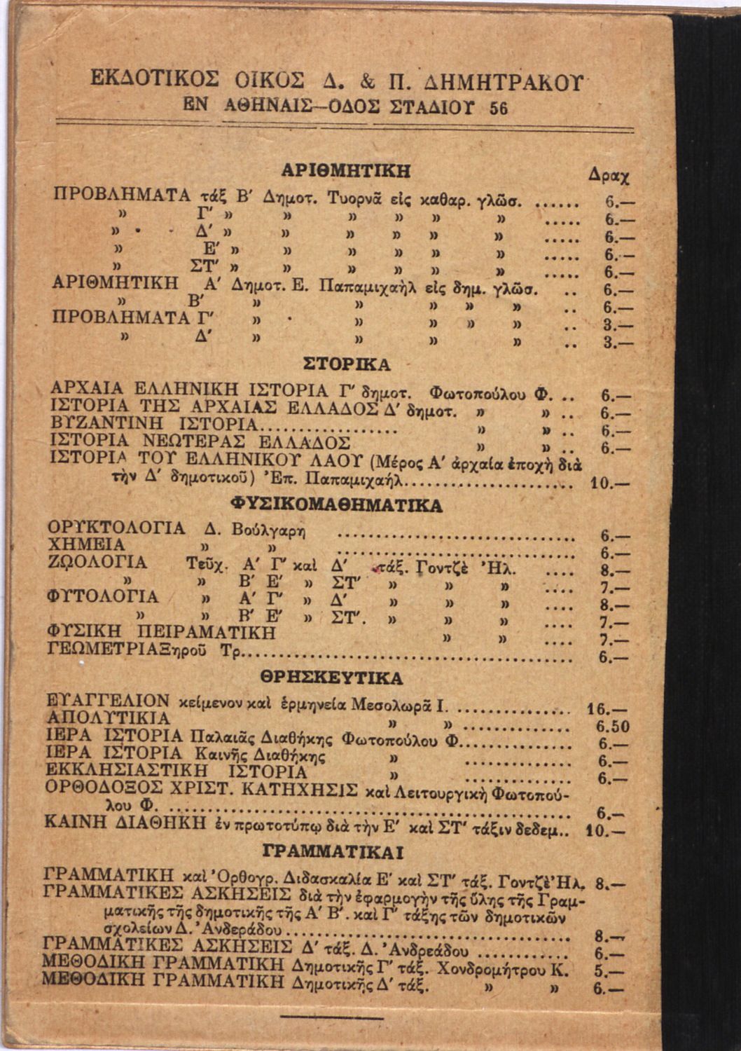 Τάξη:  Α' Ελληνικού Σχολείου / Β' Ελληνικού Σχολείου / Γ' Ελληνικού Σχολείου / Παρθεναγωγείο / Εμπορικές και Πρακτικές Σχολές