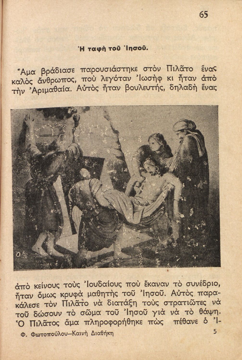 Κωδικός αναγνώρισης: 04-00057 Τίτλος: Καινή Διαθήκη για την Δ΄ τάξη των Δημοτικών Σχολείων Συγγραφέας: Φωκ. Φωτόπουλος Μέγεθος και υπόστρωμα: Μαθητικό βοήθημα, 17εκ., σκληρό εξώφυλλο, 78 σελίδες. Εξώφυλλο (έγχρωμο), σκίτσα (ασπρόμαυρα). |