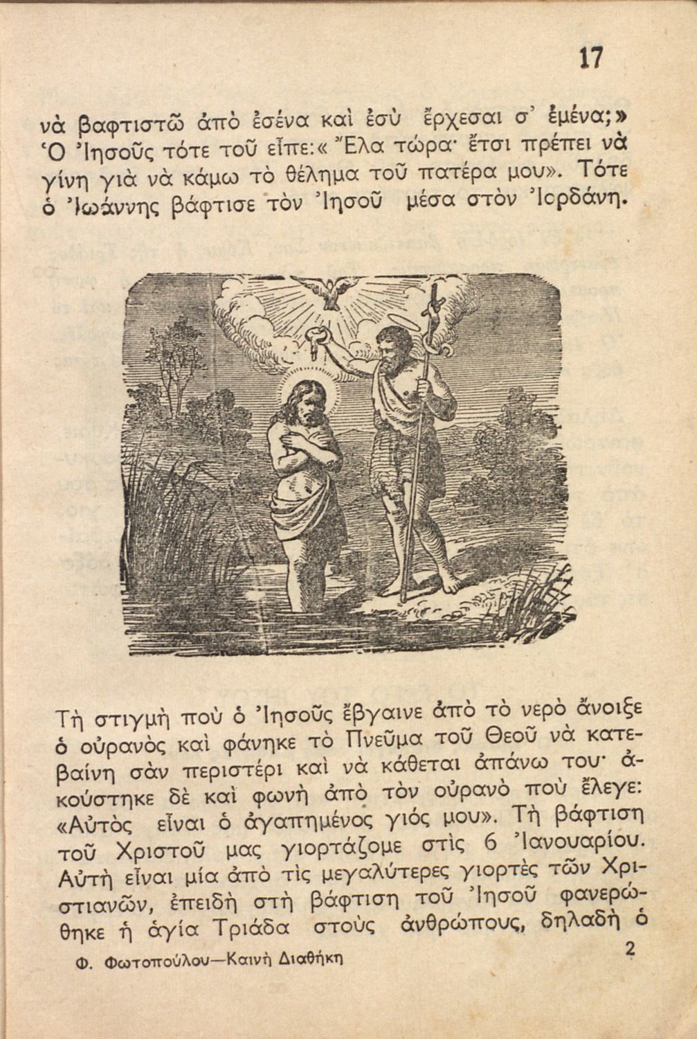 Κωδικός αναγνώρισης: 04-00057 Τίτλος: Καινή Διαθήκη για την Δ΄ τάξη των Δημοτικών Σχολείων Συγγραφέας: Φωκ. Φωτόπουλος Μέγεθος και υπόστρωμα: Μαθητικό βοήθημα, 17εκ., σκληρό εξώφυλλο, 78 σελίδες. Εξώφυλλο (έγχρωμο), σκίτσα (ασπρόμαυρα). |