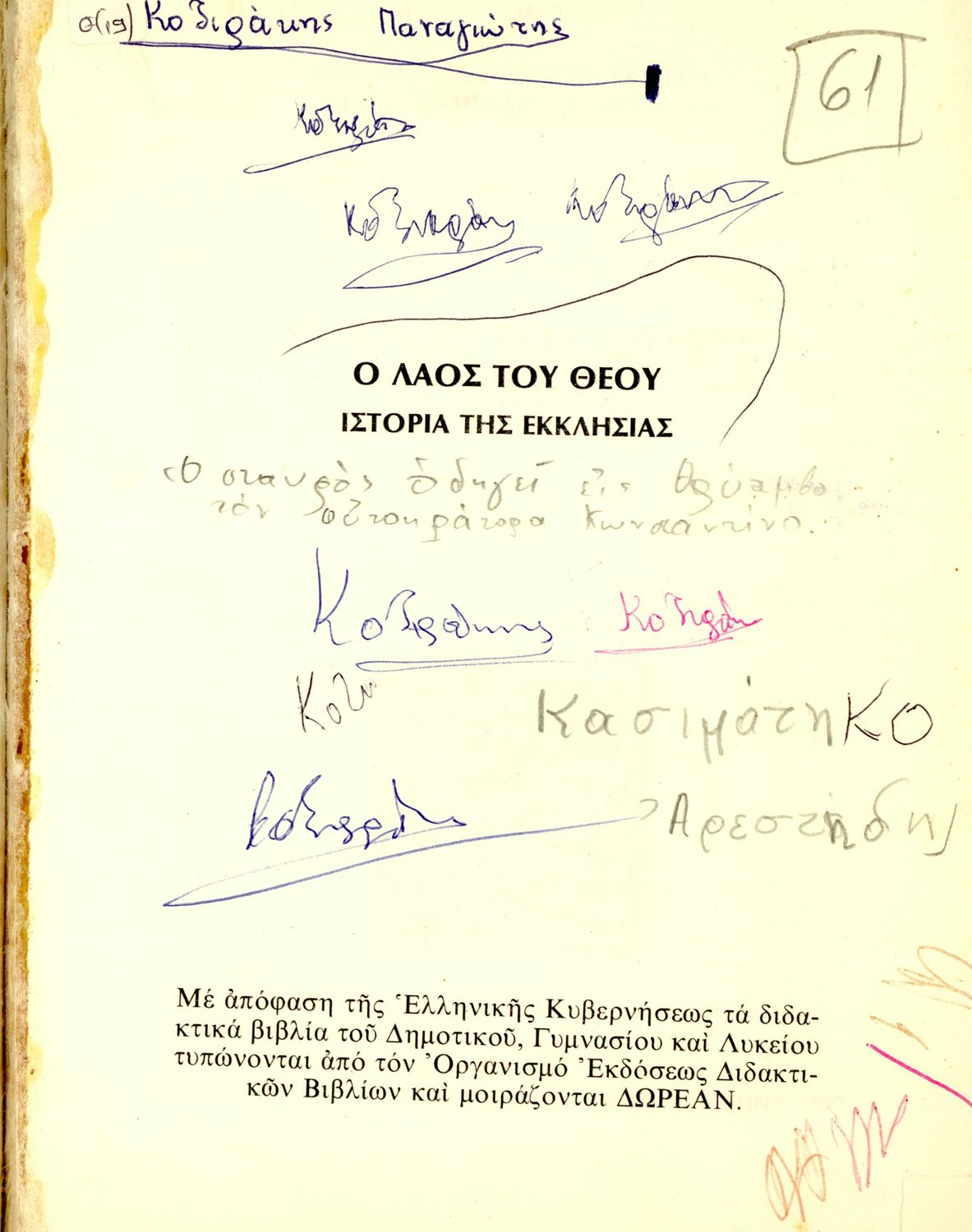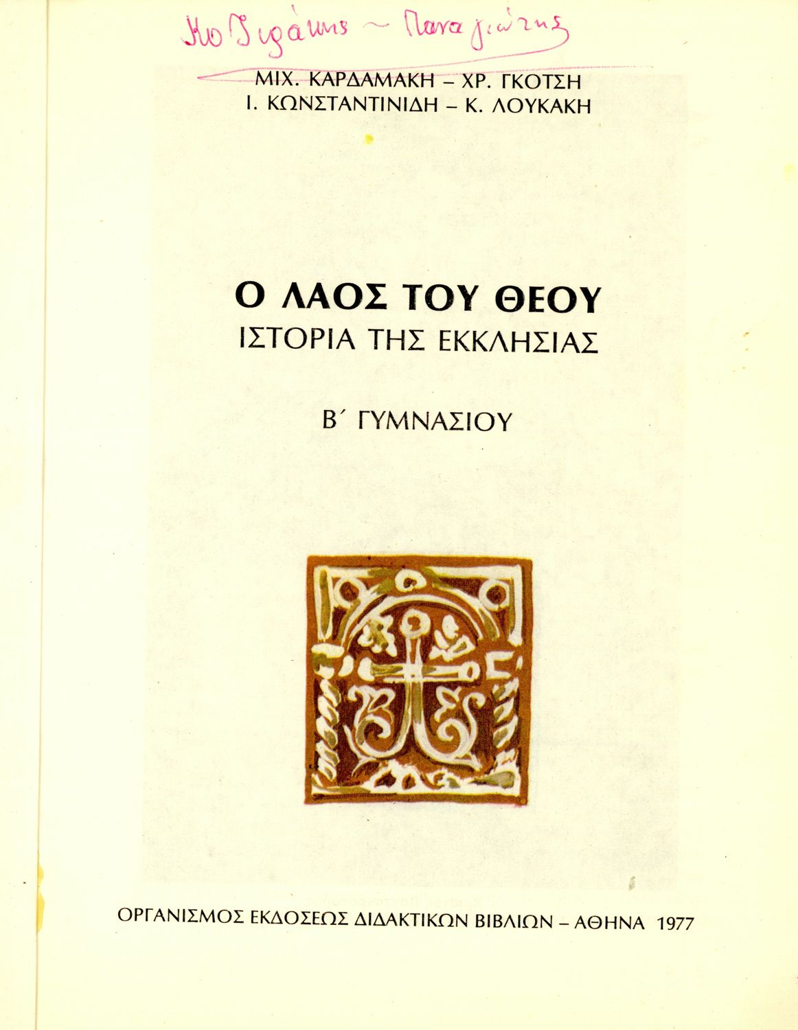 Κωδικός αναγνώρισης: 04-00061 Τίτλος: Ο Λαός του Θεού – Ιστορία της Εκκλησίας Β' Γυμνασίου Συγγραφέας: Μιχάλης Καρδαμάκης, Χρ. Γκότσης, Ι. Κωνσταντινίδης, Κ. Λυκάκης Εικονογράφος: Χρ. Γκότσης, Τάσος Μουσταφέλλος (κοσμήματα) Μέγεθος και υπόστρωμα: Σχολικό εγχειρίδιο, 20εκ., μαλακό εξώφυλλο, 270 σελίδες. Σκίτσα και εικόνες (έγχρωμα) εξώφυλλο (έγχρωμο). |