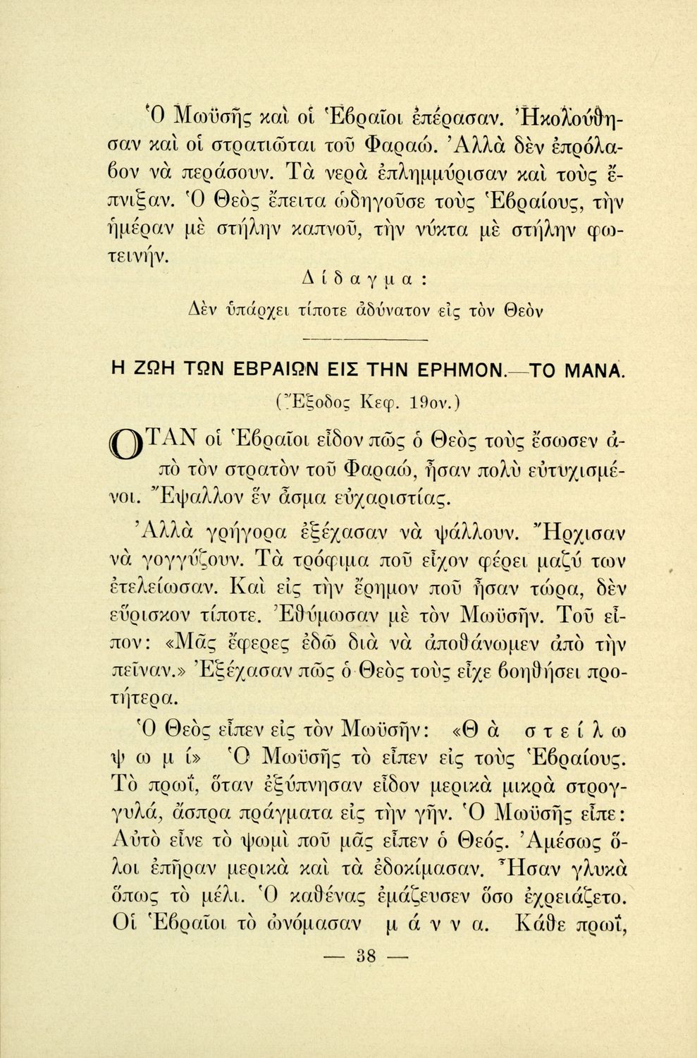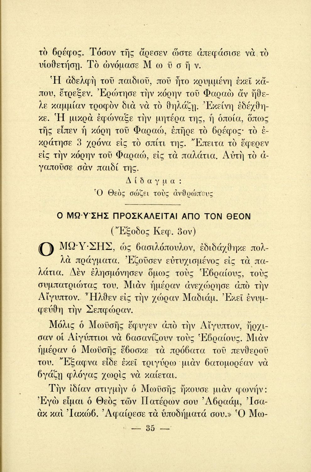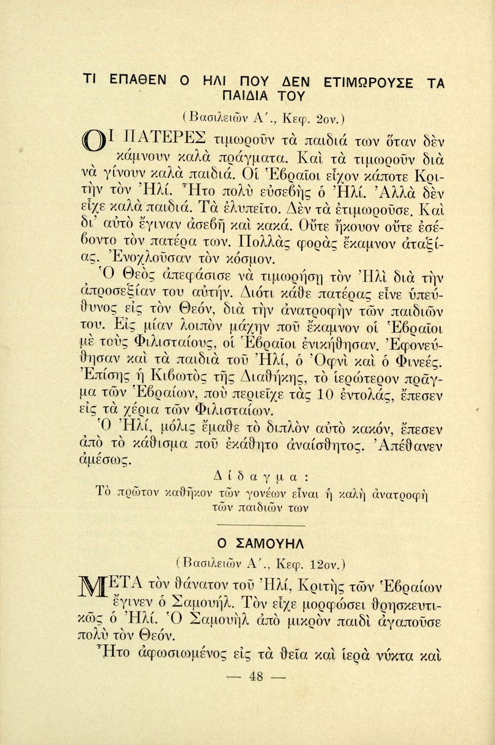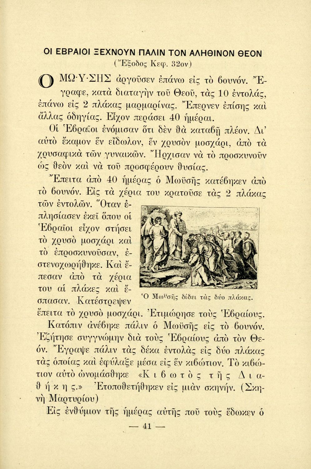 Σχολικό εγχειρίδιο Θρησκευτικών για τα Δημοτικά και Ελληνικά Σχολεία που περιλαμβάνει την ιστορία της Παλαιάς και της Καινής Διαθήκης από την δημιουργία του κόσμου μέχρι και την ανάληψη του Ιησού Χριστού.