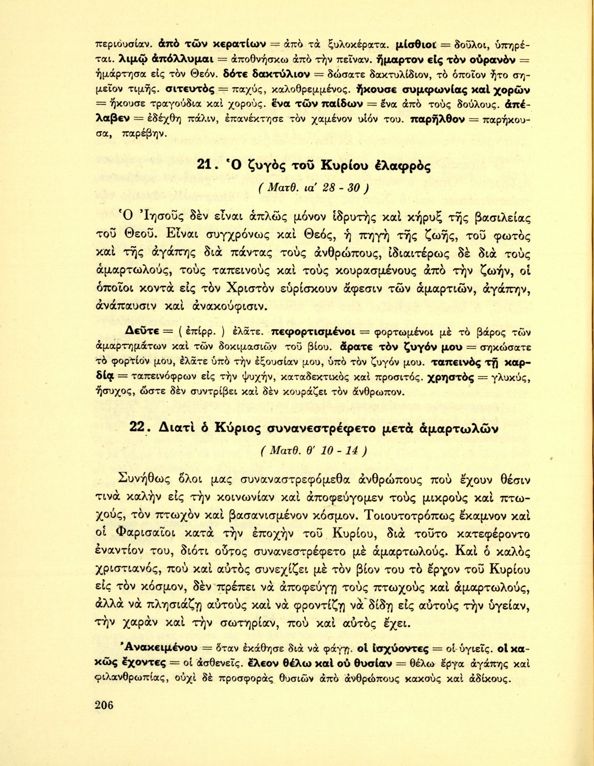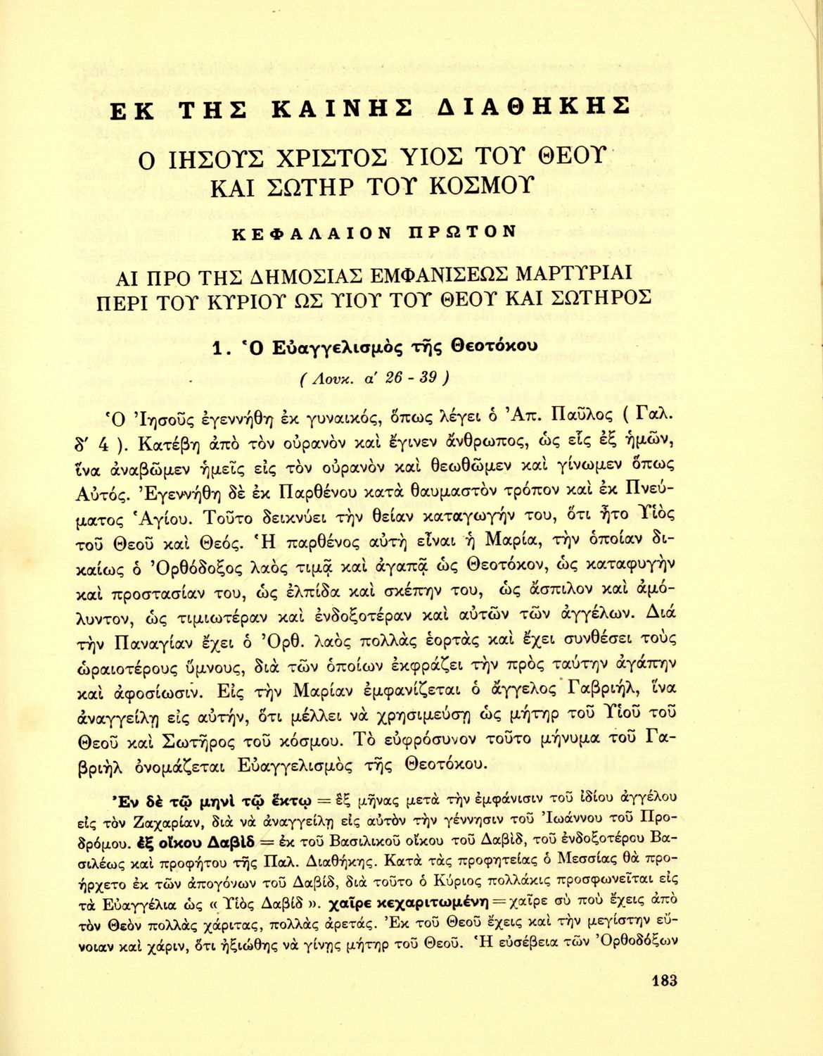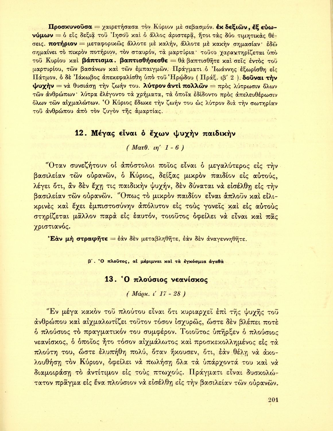 Σχολικό εγχειρίδιο Θρησκευτικών που περιλαμβάνει εισαγωγικά σχόλια στα βιβλία της Παλαιάς και Καινής Διαθήκης, περικοπές, ερμηνευτικές και πραγματολογικές σημειώσεις και πίνακα με τα κυριότερα ονόματα.