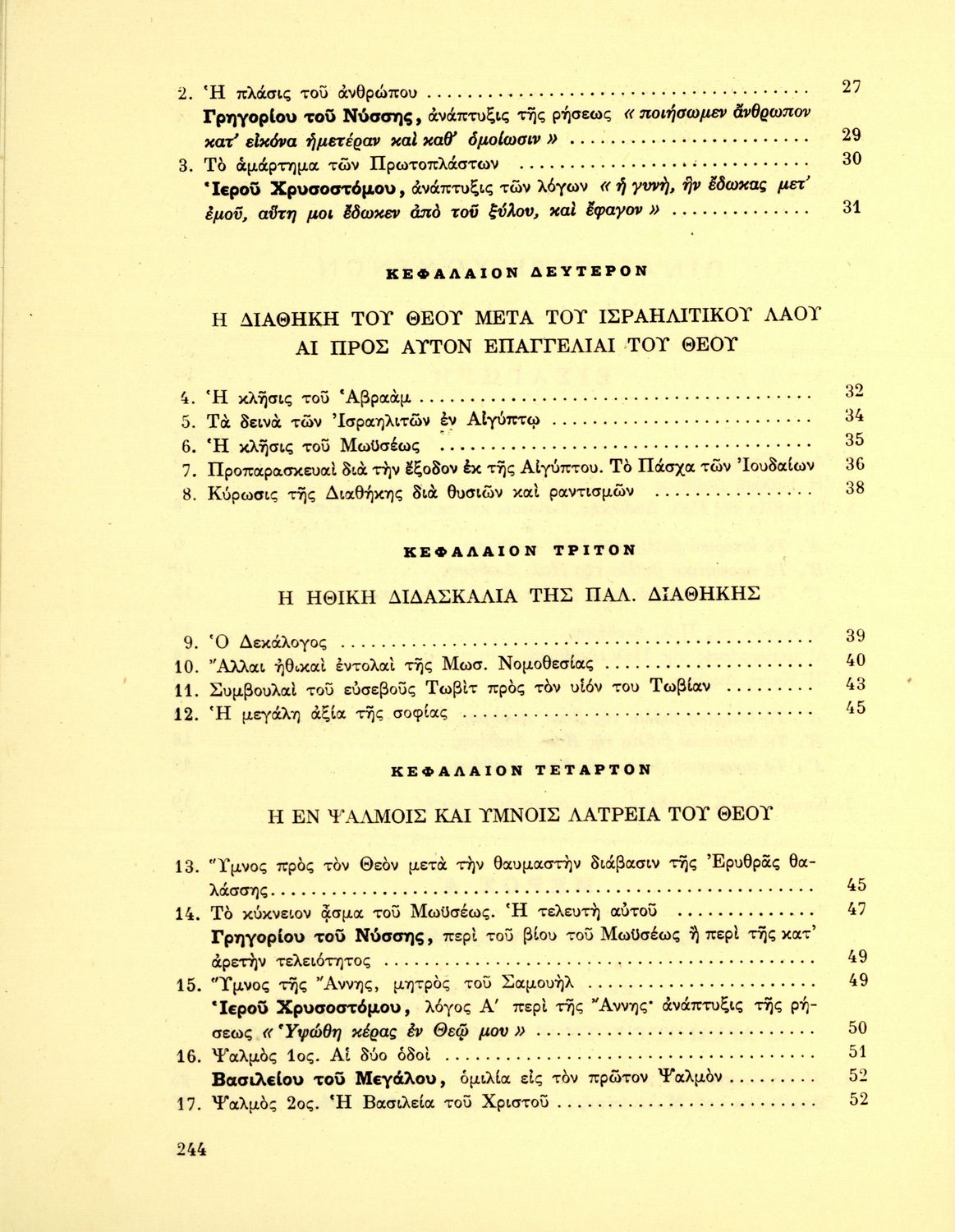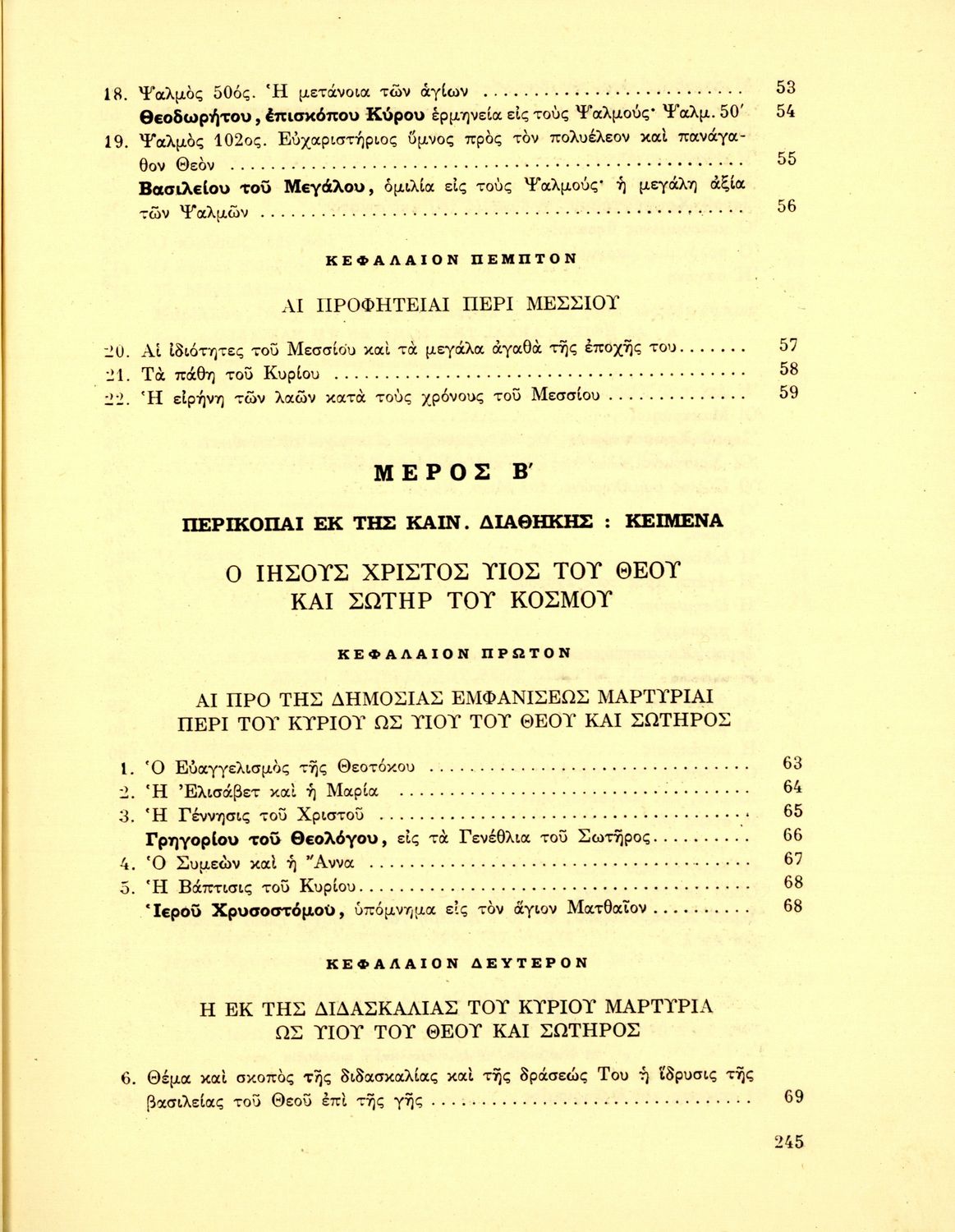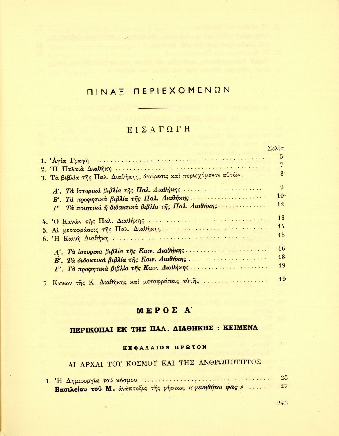 Σχολικό εγχειρίδιο Θρησκευτικών που περιλαμβάνει εισαγωγικά σχόλια στα βιβλία της Παλαιάς και Καινής Διαθήκης, περικοπές, ερμηνευτικές και πραγματολογικές σημειώσεις και πίνακα με τα κυριότερα ονόματα.