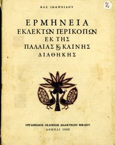 Κωδικός αναγνώρισης: 04-00064 Τίτλος: Ερμηνεία εκλεκτών περικοπών εκ της Παλαιάς κ’ Καινής Διαθήκης Συγγραφέας: Βασ. Ιωαννίδης Μέγεθος και υπόστρωμα: Σχολικό εγχειρίδιο, 20εκ., μαλακό εξώφυλλο, 249 σελίδες. Εξώφυλλο (έγχρωμο). |