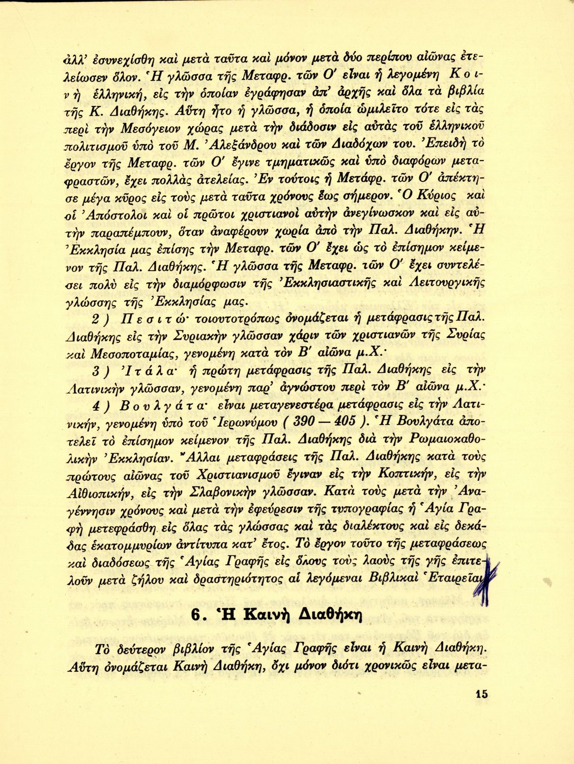 Σχολικό εγχειρίδιο Θρησκευτικών που περιλαμβάνει εισαγωγικά σχόλια στα βιβλία της Παλαιάς και Καινής Διαθήκης, περικοπές, ερμηνευτικές και πραγματολογικές σημειώσεις και πίνακα με τα κυριότερα ονόματα.