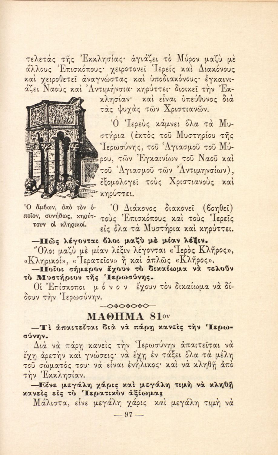 Κωδικός αναγνώρισης: 04-00068 Τίτλος: Η Κατήχησις του Ελληνόπαιδος δια τους μαθητάς των σχολείων της διασποράς Συγγραφέας: Γερμανός Πολυζωίδης Μέγεθος και υπόστρωμα: Σχολικό εγχειρίδιο, 21εκ., σκληρό εξώφυλλο, 104 σελίδες. Σκίτσα (ασπρόμαυρα). |