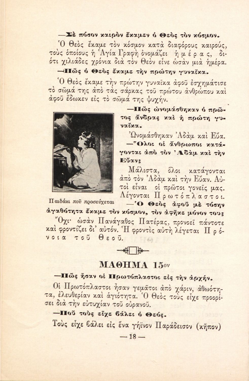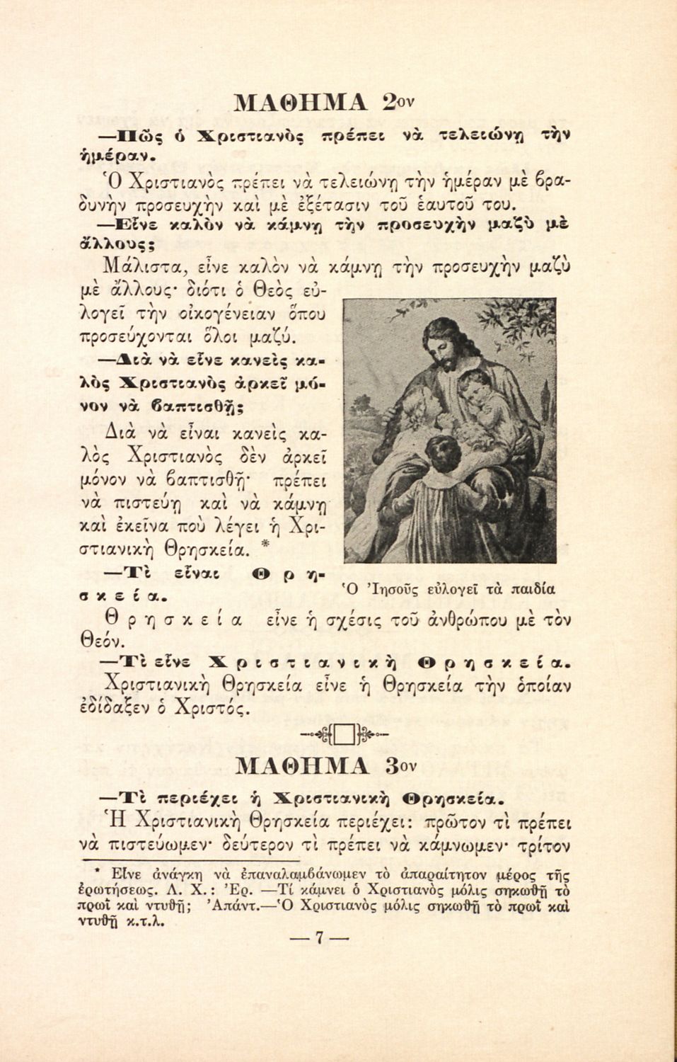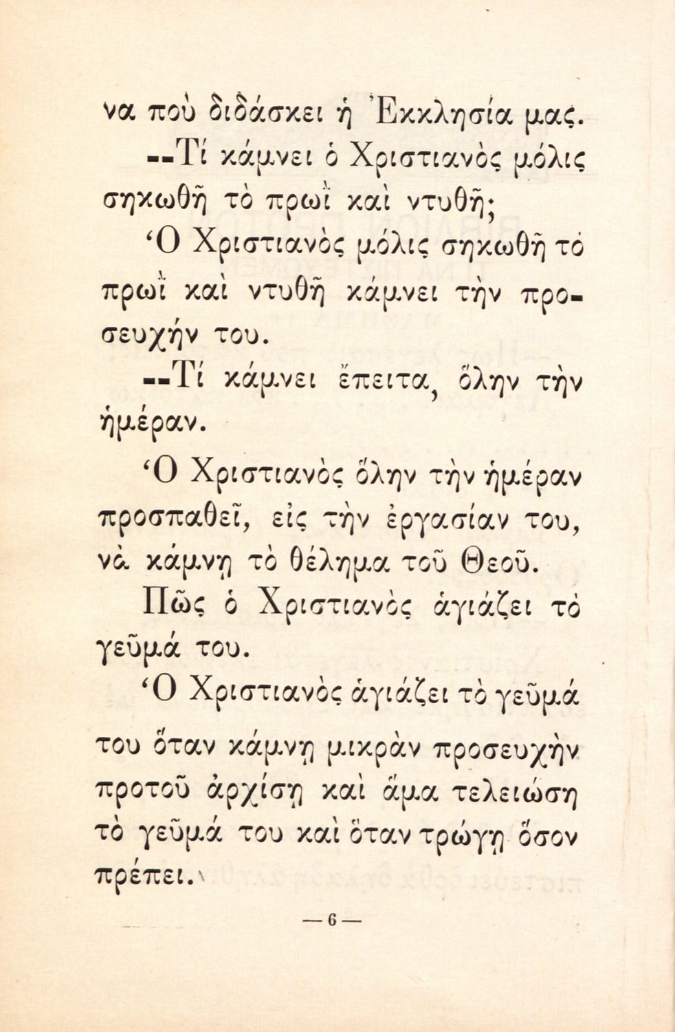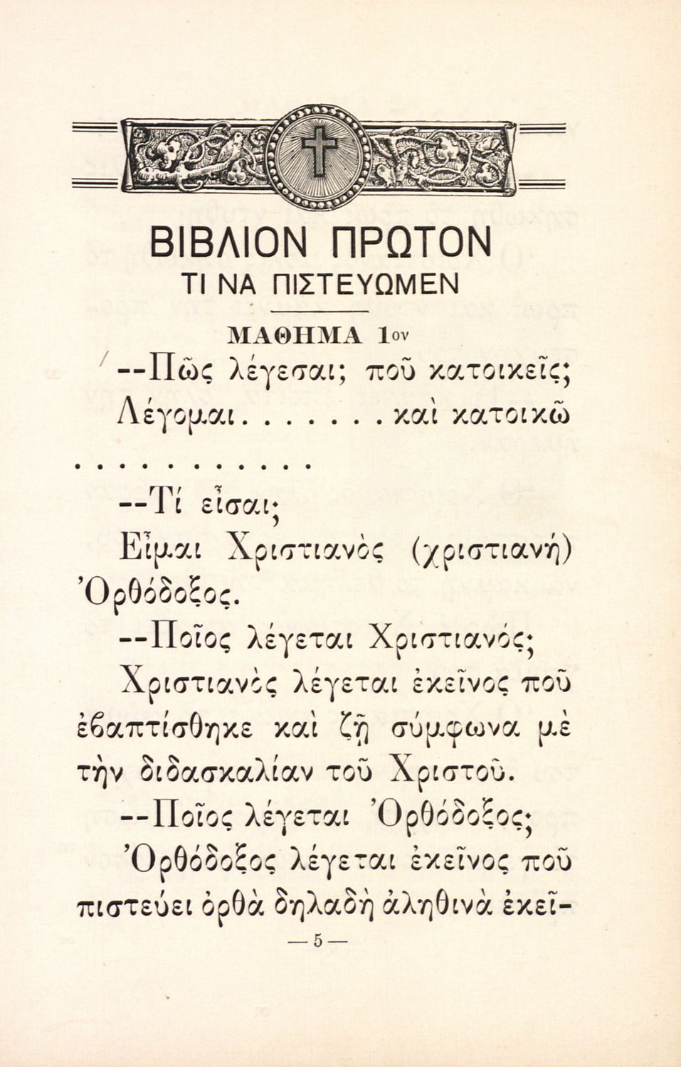 Σχολικό εγχειρίδιο Θρησκευτικών για τους μαθητές του Δημοτικού που, στη βάση ερωταποκρίσεων, αποσκοπεί στη διδασκαλία της χριστιανικής κατήχησης. Περιέχει και προσευχές.