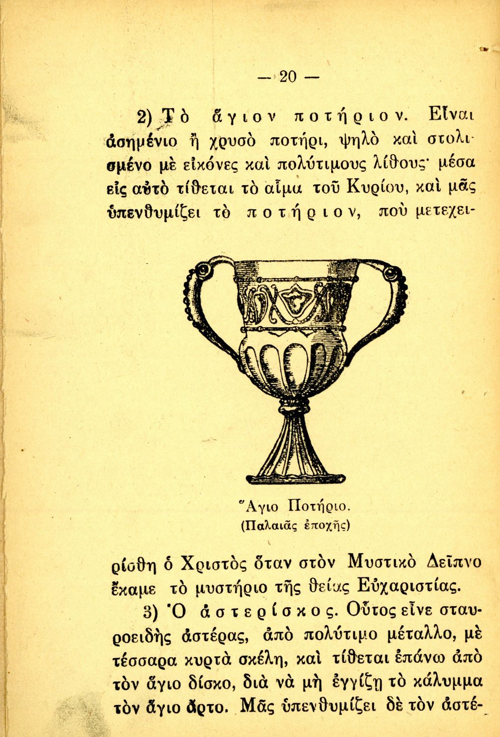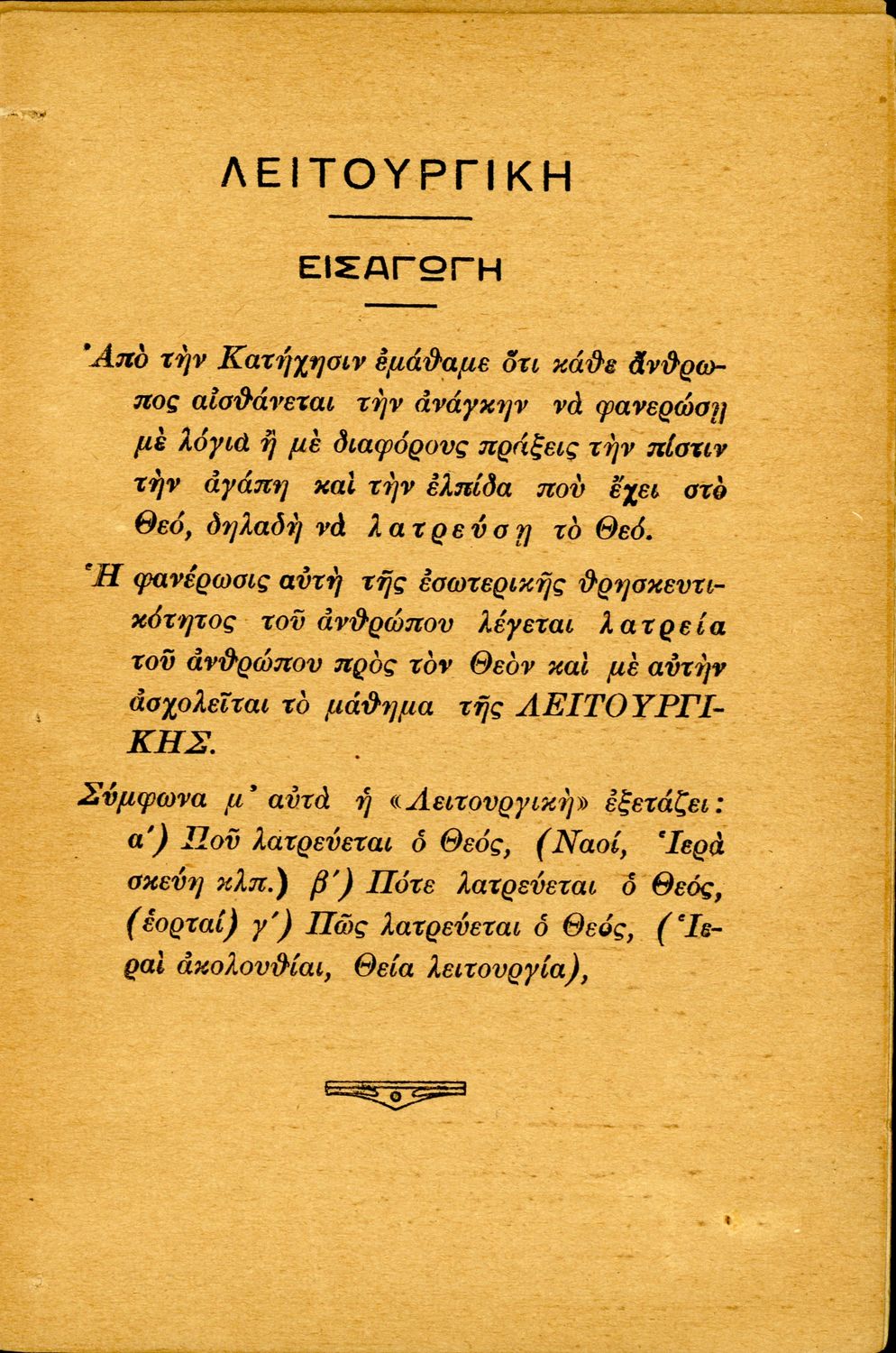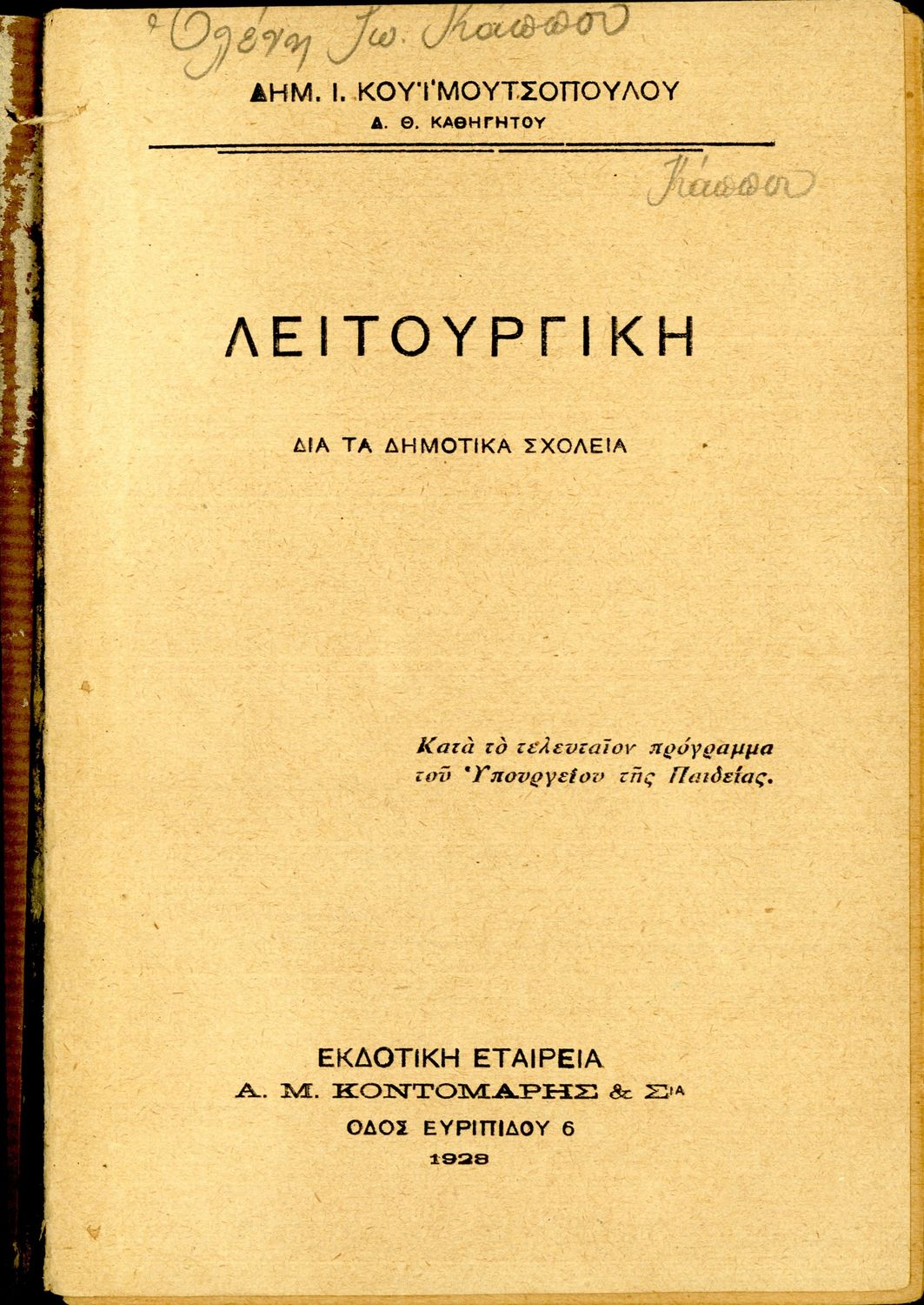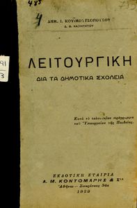 Κωδικός αναγνώρισης: 04-00071 Τίτλος: Λειτουργική διά τα Δημοτικά Σχολεία Συγγραφέας: Δημ. Ι. Κουϊμουτσόπουλος Μέγεθος και υπόστρωμα: Μαθητικό βοήθημα, 17εκ., σκληρό εξώφυλλο, 80 σελίδες. Σκίτσα (ασπρόμαυρα). |