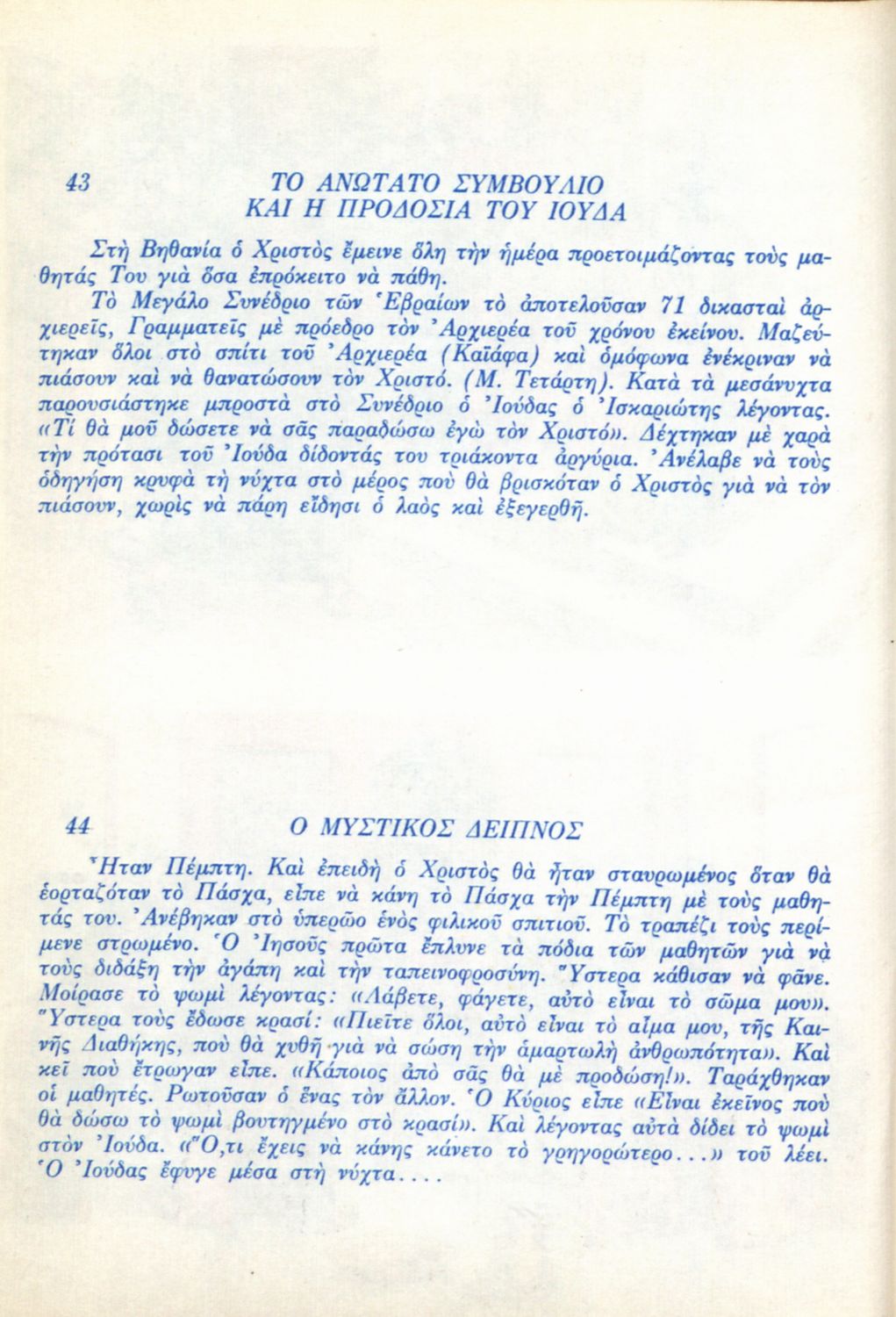 Βαθμίδα εκπαίδευσης: Πρωτοβάθμια Μάθημα: Θρησκευτικά Γλώσσα: Δημοτική με στοιχεία καθαρεύουσας Παρουσίαση περιεχομένου: Μαθητικό βοήθημα Θρησκευτικών που παρουσιάζει την ιστορία της Καινής Διαθήκης μέσα από εικόνες και σύντομα κείμενα. |