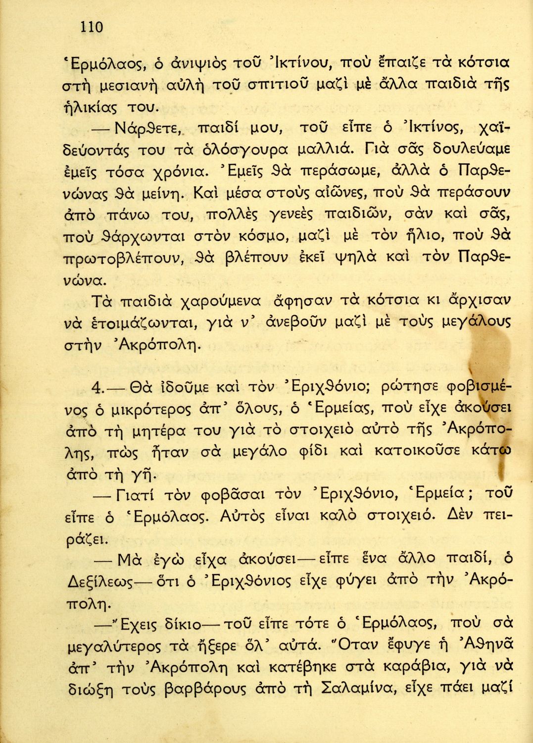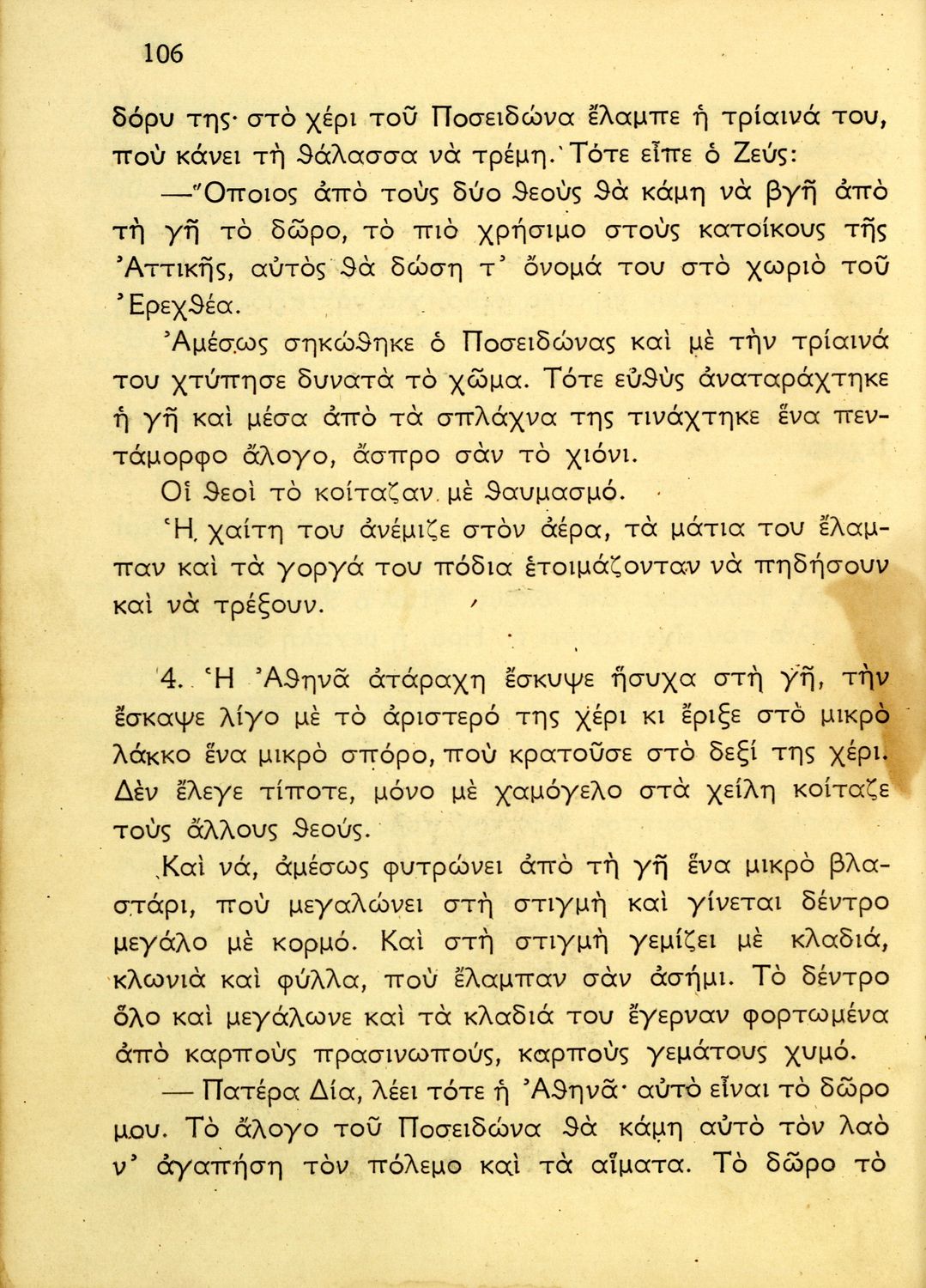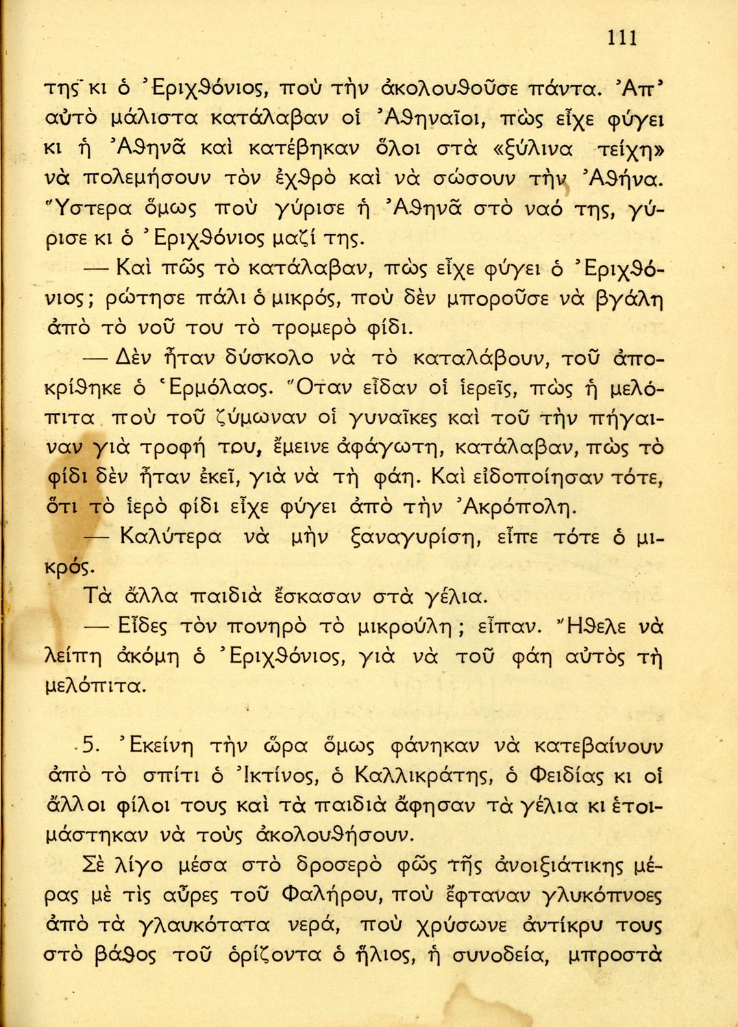 Αναγνωστικό Δ΄ Δημοτικού που περιλαμβάνει θέματα από την θρησκευτική, οικογενειακή και σχολική ζωή του παιδιού, την ελληνική μυθολογία και ιστορία και τη ζωή των ζώων.