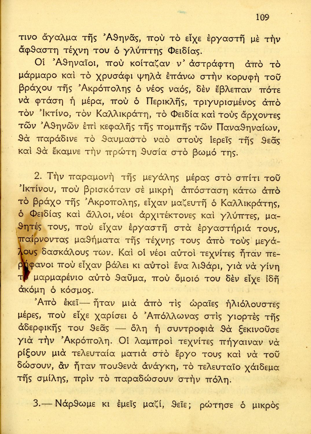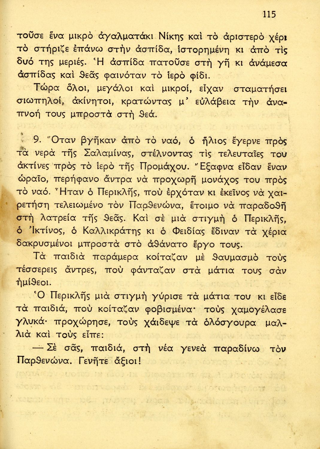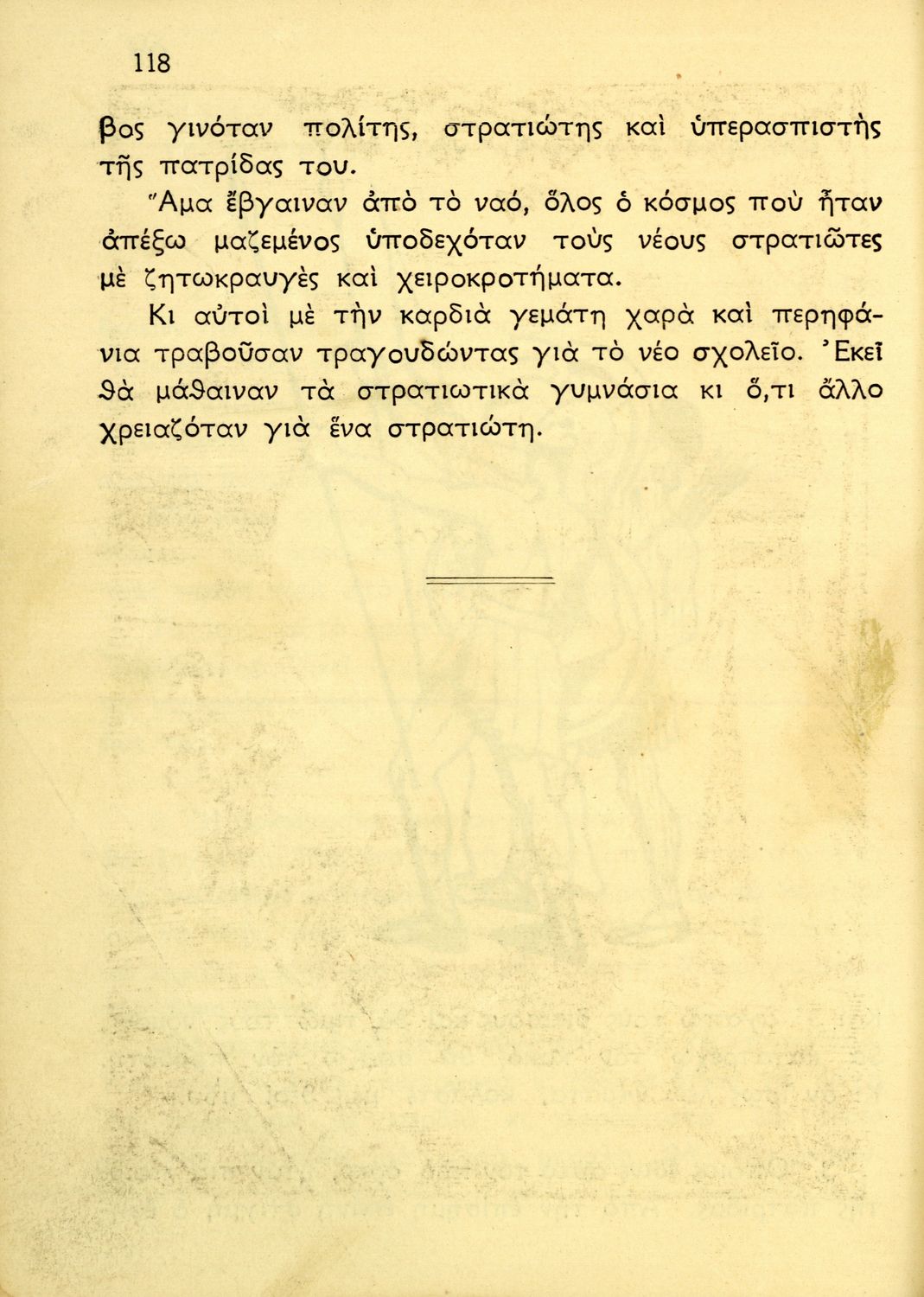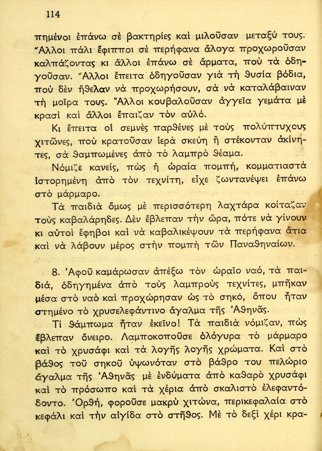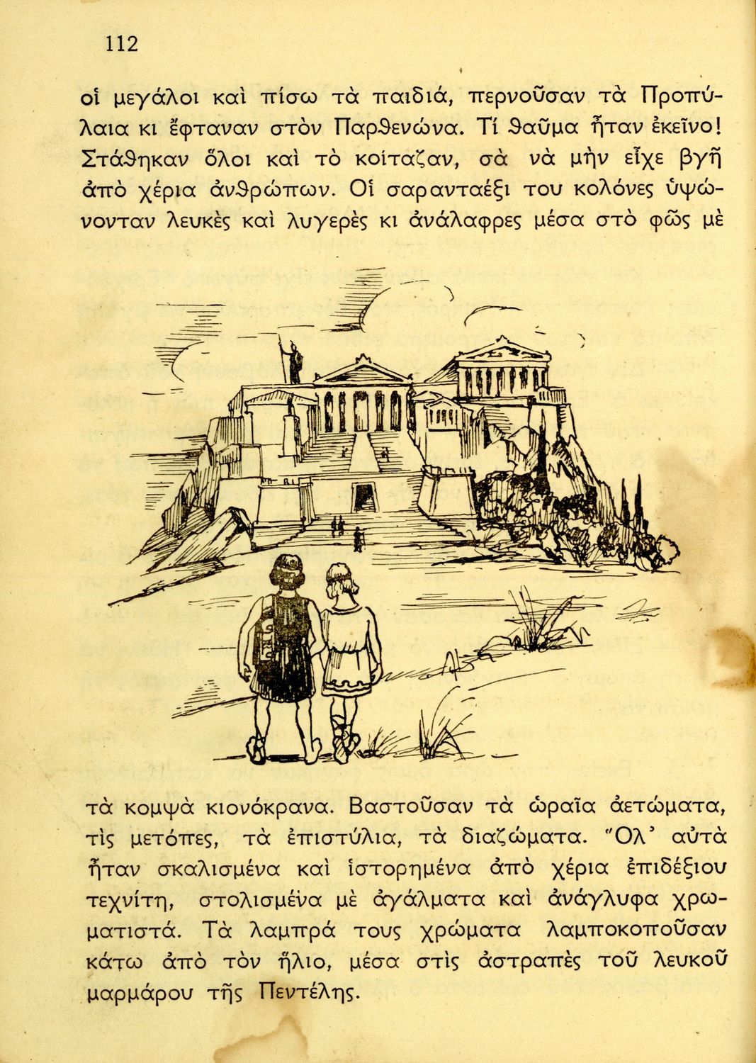 Αναγνωστικό Δ΄ Δημοτικού που περιέχει κείμενα εμπνευσμένα από την ζωή στην ύπαιθρο, την οικογενειακή ζωή, την αγάπη για τα ζώα, τη θρησκευτική παράδοση, την κοινωνική ζωή, την εθνική ζωή και προσήλωση στα εθνικά σύμβολα. 'Όντας σχολικό βιβλίο του μεταξικού καθεστώτος περιέχει χαρακτηριστικά δείγματα της μεταξικής προπαγάνδας και λογικής που παρουσιάζουν τον Ι. Μεταξά, ως μάγο, αρχηγό και κυβερνήτη της Ελλάδας. Όπως όλα τα βιβλία του καθεστώτος φέρει τη ρήση του Μεταξά "Είστε Ελληνόπουλα και είναι μεγάλο πράγμα να είναι κανείς Έλλην".