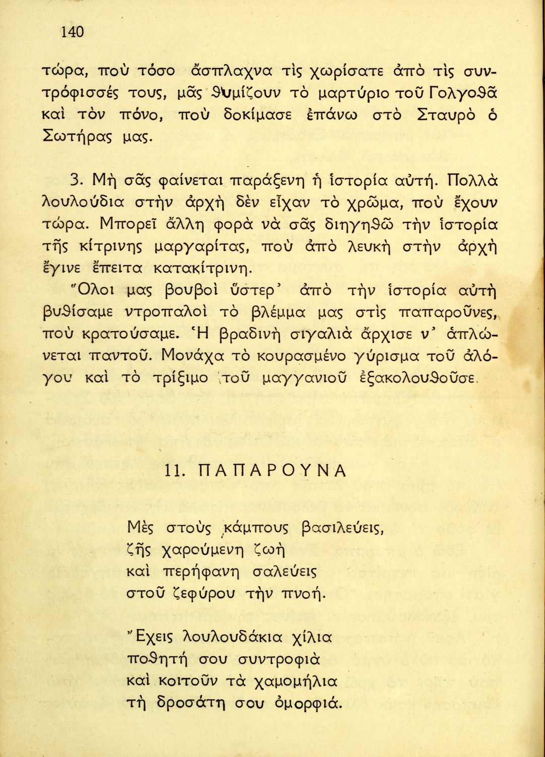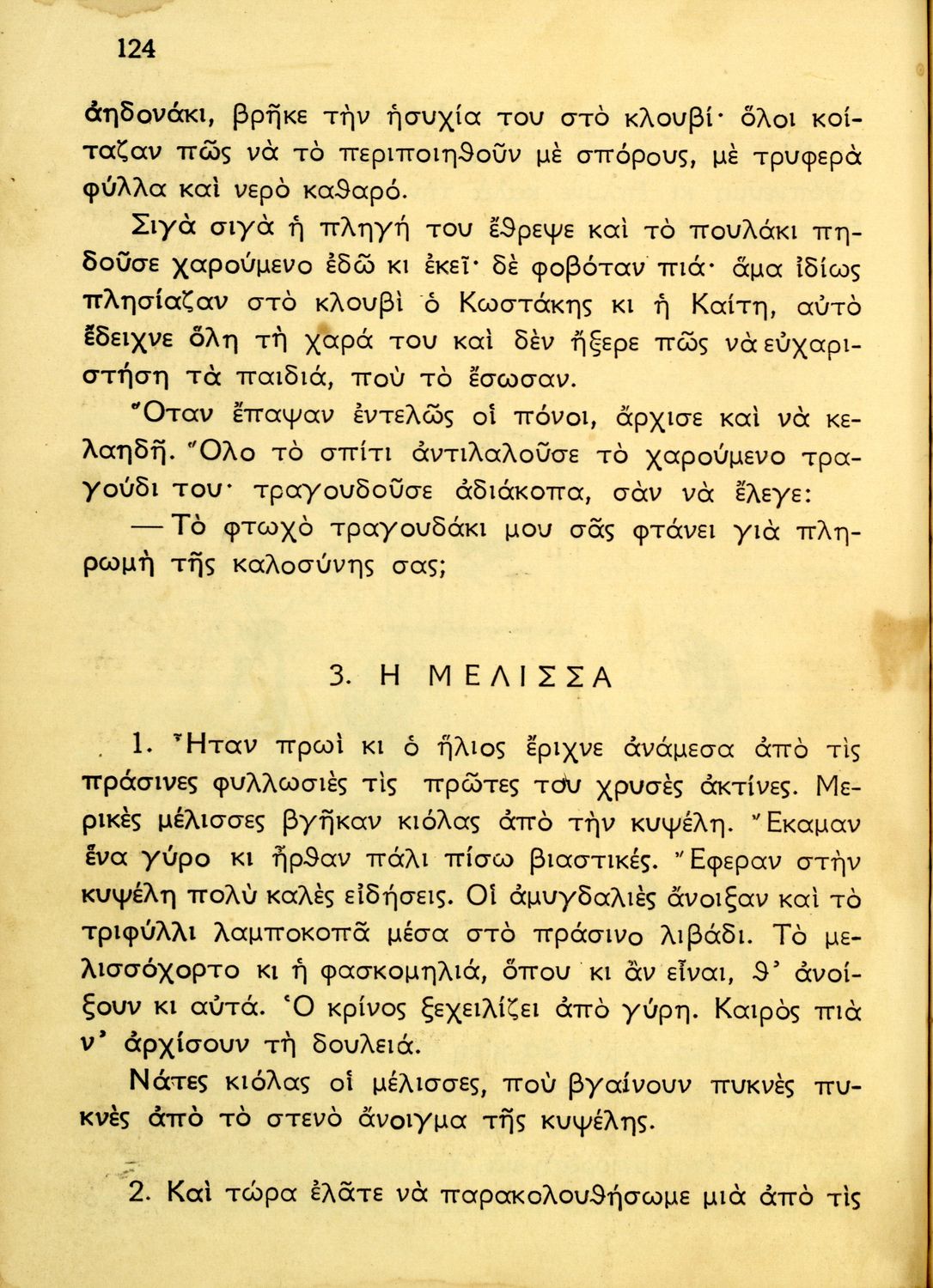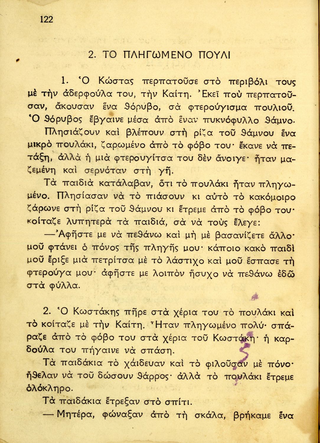 Αναγνωστικό Δ΄ Δημοτικού που περιέχει κείμενα εμπνευσμένα από την ζωή στην ύπαιθρο, την οικογενειακή ζωή, την αγάπη για τα ζώα, τη θρησκευτική παράδοση, την κοινωνική ζωή, την εθνική ζωή και προσήλωση στα εθνικά σύμβολα. 'Όντας σχολικό βιβλίο του μεταξικού καθεστώτος περιέχει χαρακτηριστικά δείγματα της μεταξικής προπαγάνδας και λογικής που παρουσιάζουν τον Ι. Μεταξά, ως μάγο, αρχηγό και κυβερνήτη της Ελλάδας. Όπως όλα τα βιβλία του καθεστώτος φέρει τη ρήση του Μεταξά "Είστε Ελληνόπουλα και είναι μεγάλο πράγμα να είναι κανείς Έλλην".