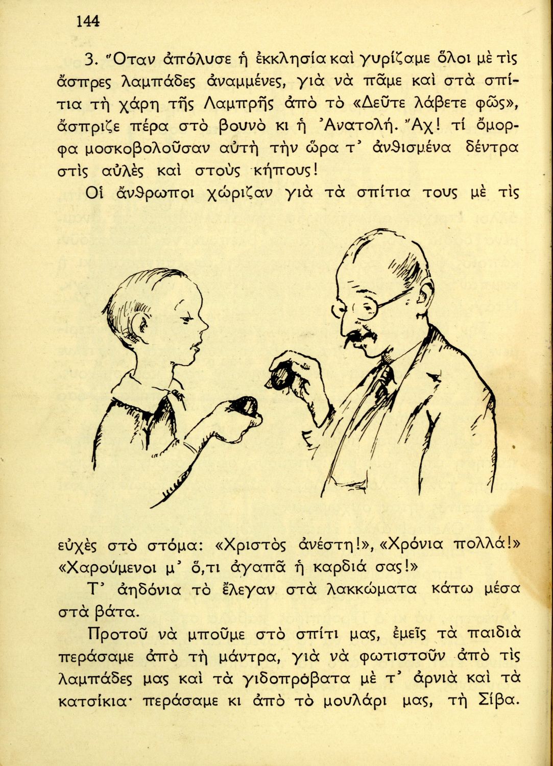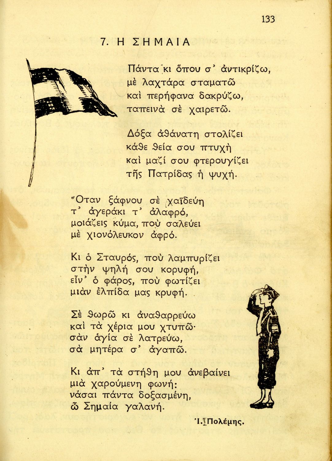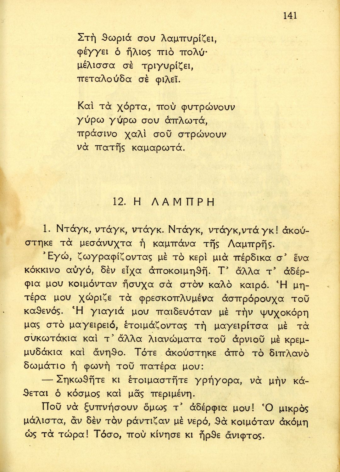 Αναγνωστικό Δ΄ Δημοτικού που περιέχει κείμενα εμπνευσμένα από την ζωή στην ύπαιθρο, την οικογενειακή ζωή, την αγάπη για τα ζώα, τη θρησκευτική παράδοση, την κοινωνική ζωή, την εθνική ζωή και προσήλωση στα εθνικά σύμβολα. 'Όντας σχολικό βιβλίο του μεταξικού καθεστώτος περιέχει χαρακτηριστικά δείγματα της μεταξικής προπαγάνδας και λογικής που παρουσιάζουν τον Ι. Μεταξά, ως μάγο, αρχηγό και κυβερνήτη της Ελλάδας. Όπως όλα τα βιβλία του καθεστώτος φέρει τη ρήση του Μεταξά "Είστε Ελληνόπουλα και είναι μεγάλο πράγμα να είναι κανείς Έλλην".