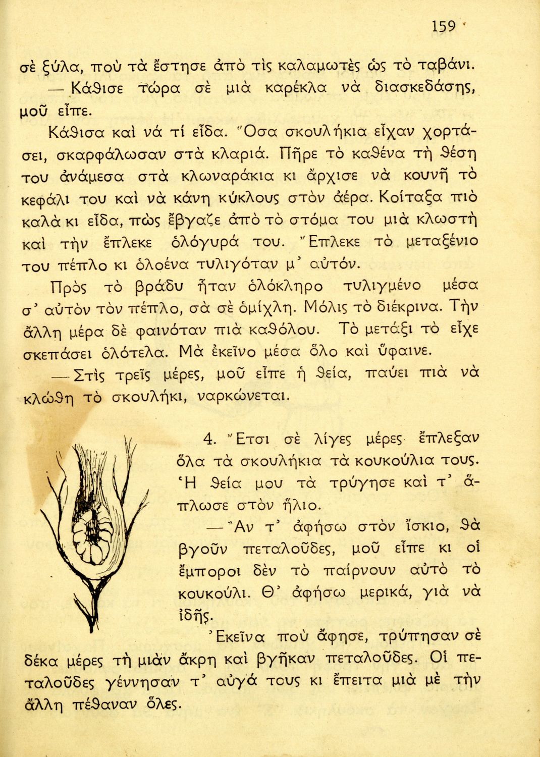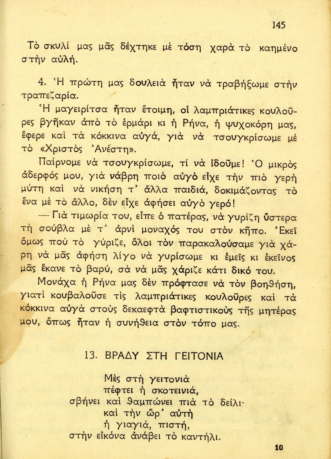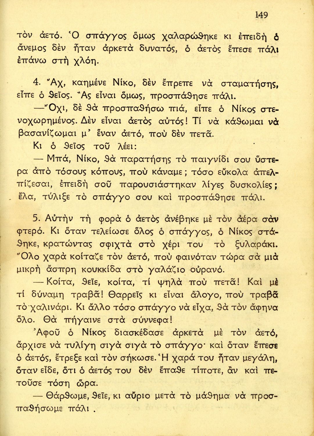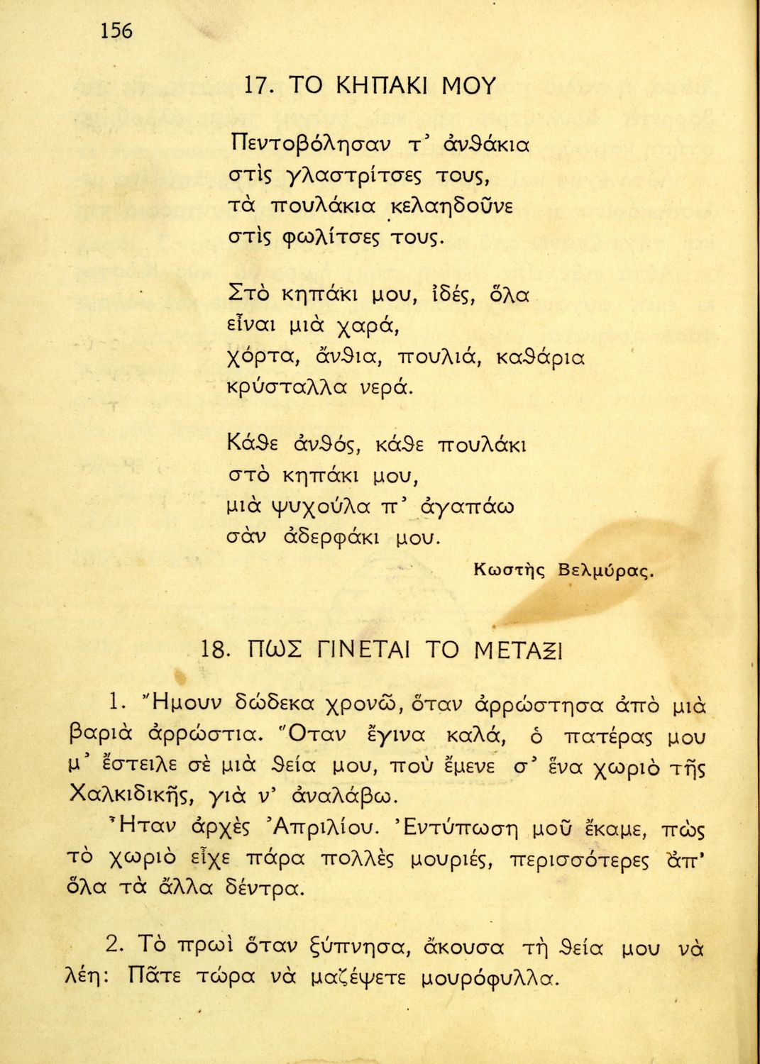 Αναγνωστικό Δ΄ Δημοτικού που περιέχει κείμενα εμπνευσμένα από την ζωή στην ύπαιθρο, την οικογενειακή ζωή, την αγάπη για τα ζώα, τη θρησκευτική παράδοση, την κοινωνική ζωή, την εθνική ζωή και προσήλωση στα εθνικά σύμβολα. 'Όντας σχολικό βιβλίο του μεταξικού καθεστώτος περιέχει χαρακτηριστικά δείγματα της μεταξικής προπαγάνδας και λογικής που παρουσιάζουν τον Ι. Μεταξά, ως μάγο, αρχηγό και κυβερνήτη της Ελλάδας. Όπως όλα τα βιβλία του καθεστώτος φέρει τη ρήση του Μεταξά "Είστε Ελληνόπουλα και είναι μεγάλο πράγμα να είναι κανείς Έλλην".