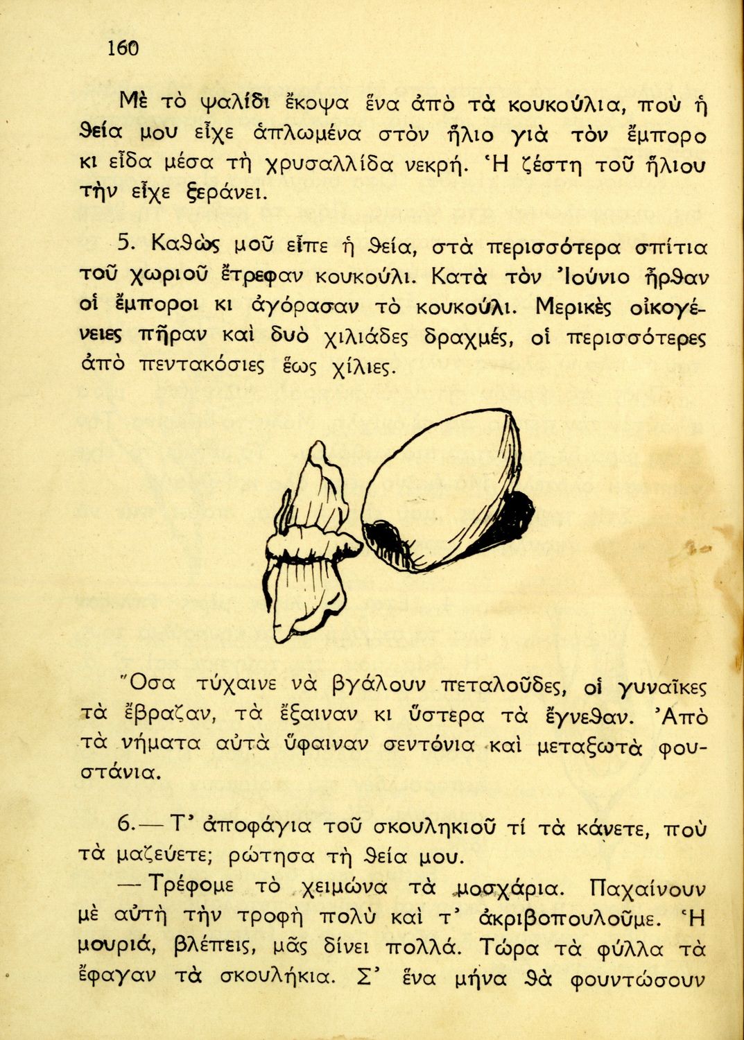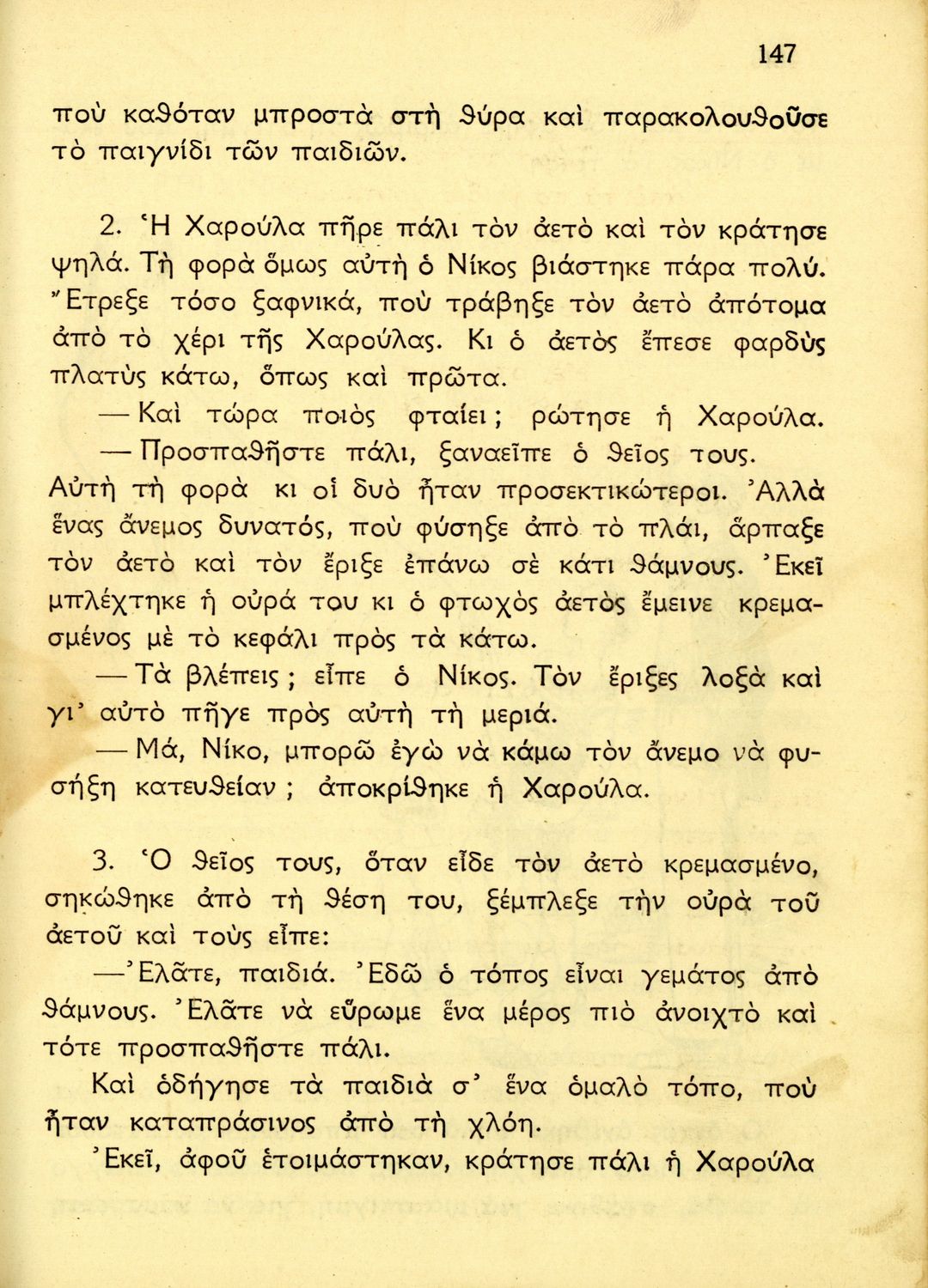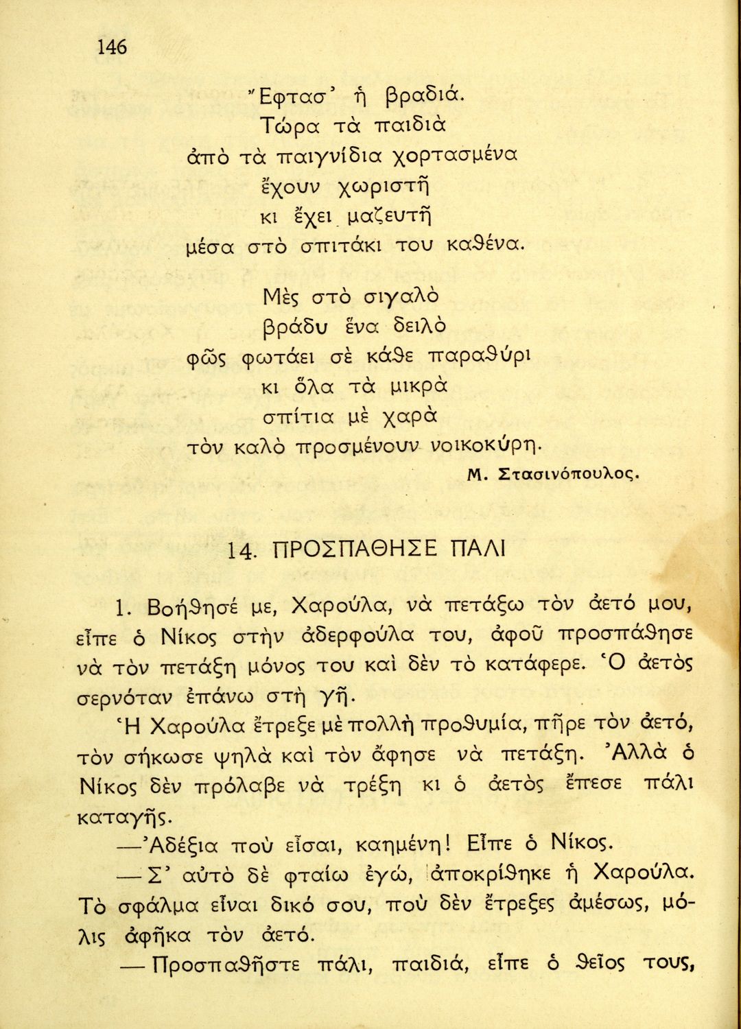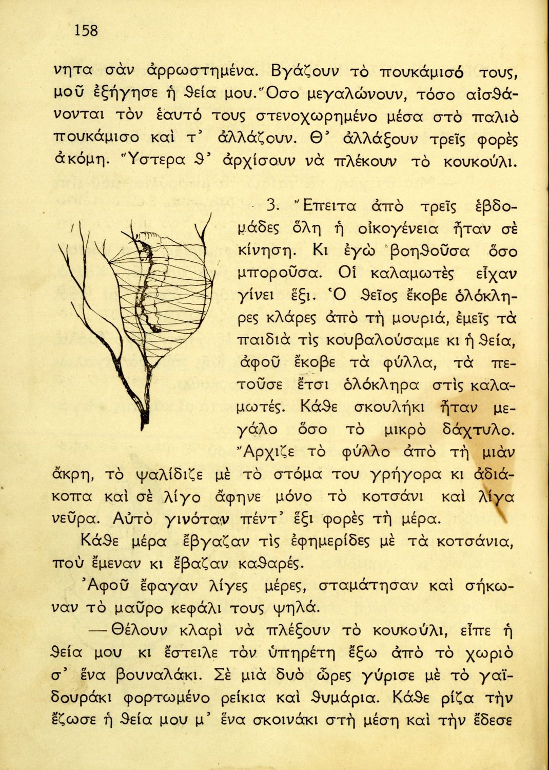 Αναγνωστικό Δ΄ Δημοτικού που περιέχει κείμενα εμπνευσμένα από την ζωή στην ύπαιθρο, την οικογενειακή ζωή, την αγάπη για τα ζώα, τη θρησκευτική παράδοση, την κοινωνική ζωή, την εθνική ζωή και προσήλωση στα εθνικά σύμβολα. 'Όντας σχολικό βιβλίο του μεταξικού καθεστώτος περιέχει χαρακτηριστικά δείγματα της μεταξικής προπαγάνδας και λογικής που παρουσιάζουν τον Ι. Μεταξά, ως μάγο, αρχηγό και κυβερνήτη της Ελλάδας. Όπως όλα τα βιβλία του καθεστώτος φέρει τη ρήση του Μεταξά "Είστε Ελληνόπουλα και είναι μεγάλο πράγμα να είναι κανείς Έλλην".