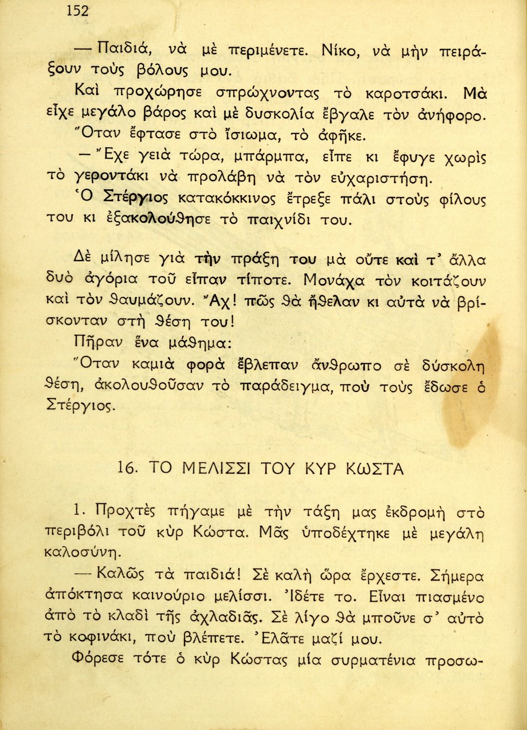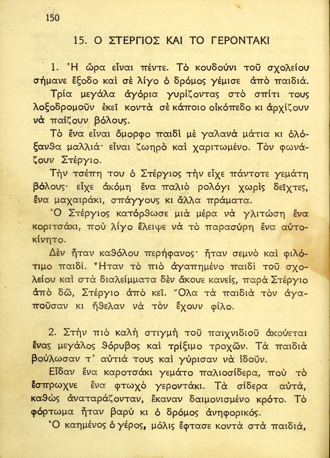 Αναγνωστικό Δ΄ Δημοτικού που περιλαμβάνει θέματα από την θρησκευτική, οικογενειακή και σχολική ζωή του παιδιού, την ελληνική μυθολογία και ιστορία και τη ζωή των ζώων.