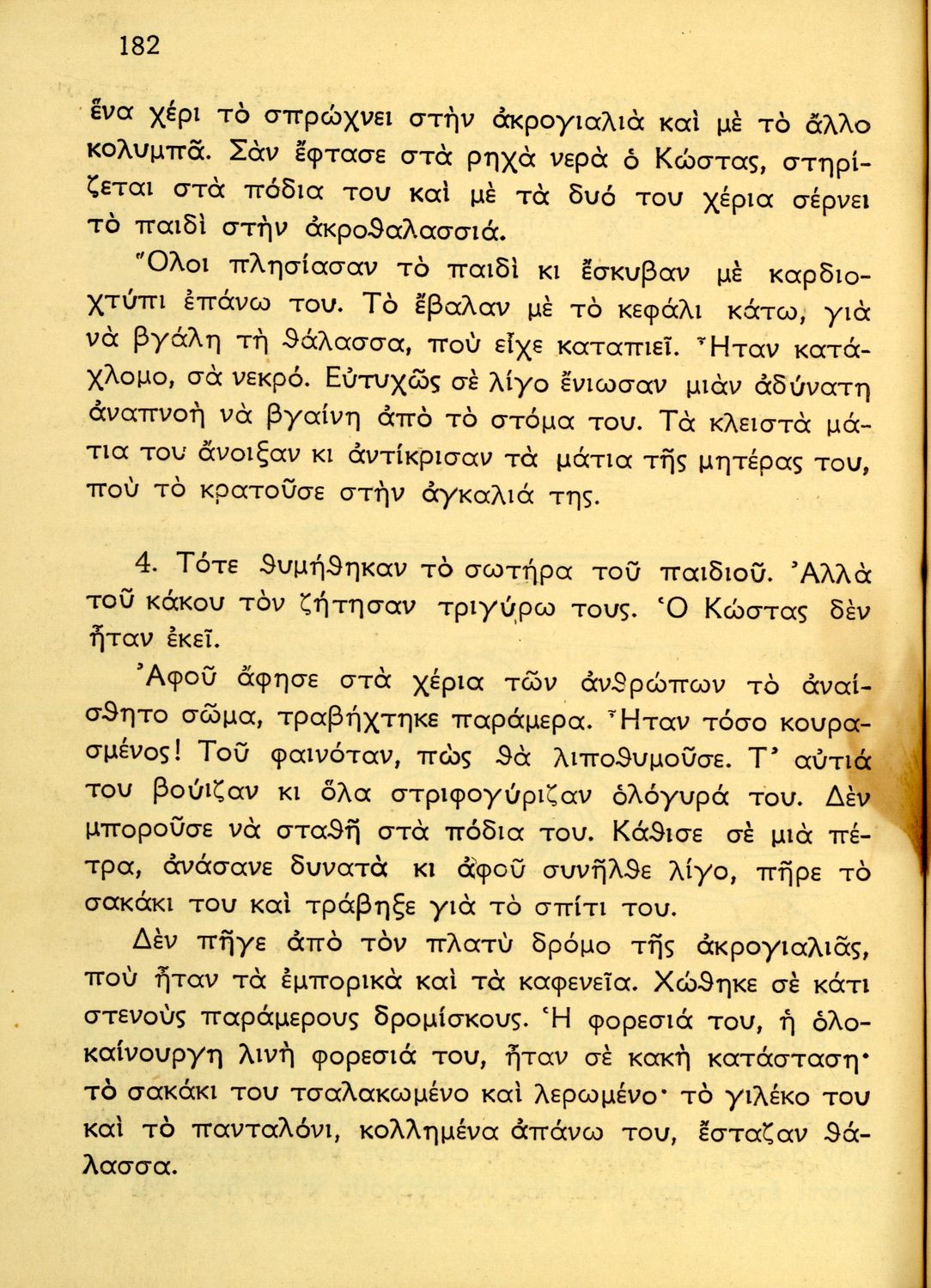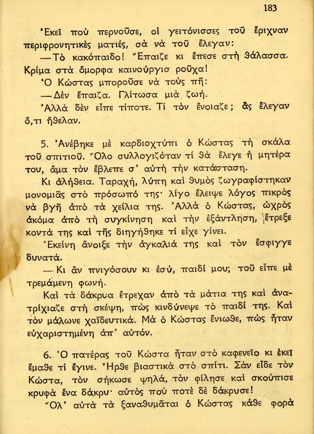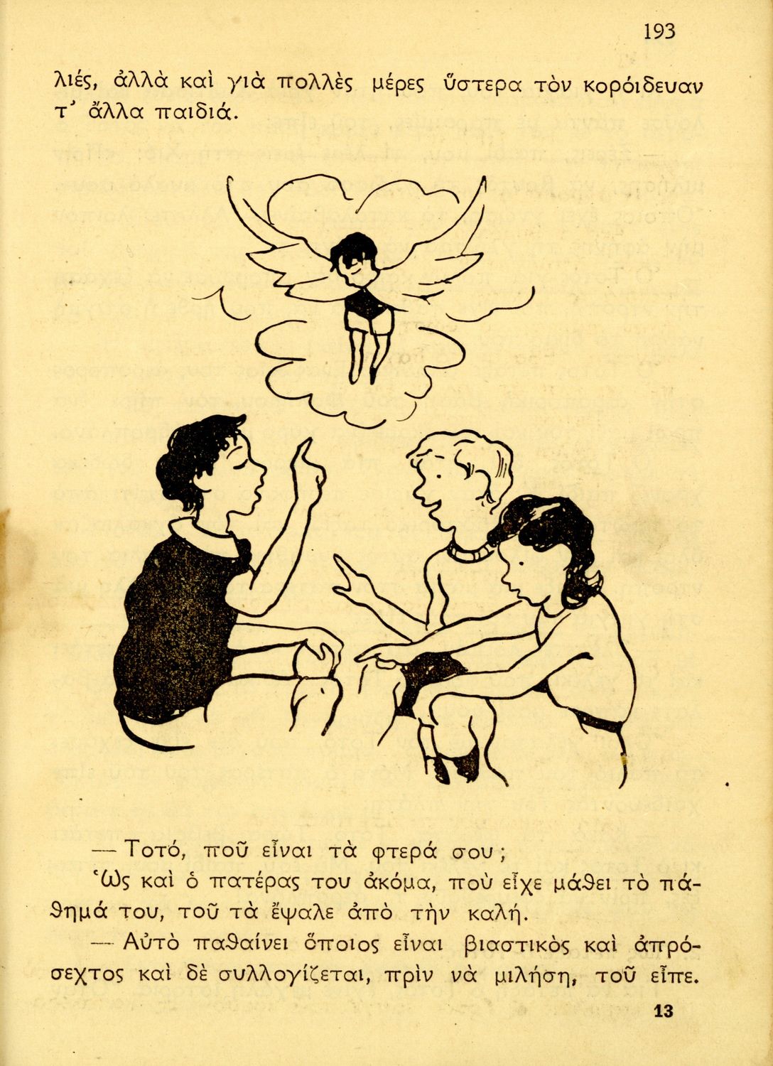 Αναγνωστικό Δ΄ Δημοτικού που περιλαμβάνει θέματα από την θρησκευτική, οικογενειακή και σχολική ζωή του παιδιού, την ελληνική μυθολογία και ιστορία και τη ζωή των ζώων.