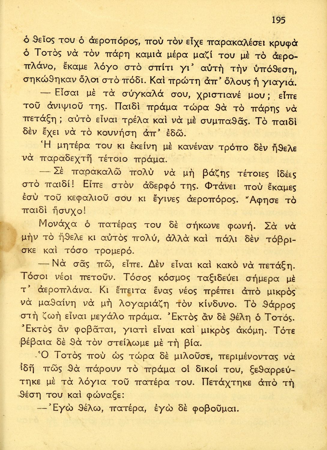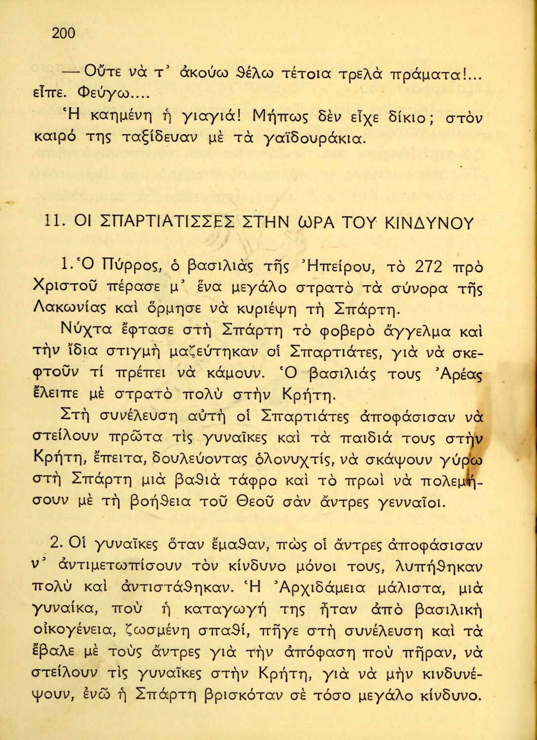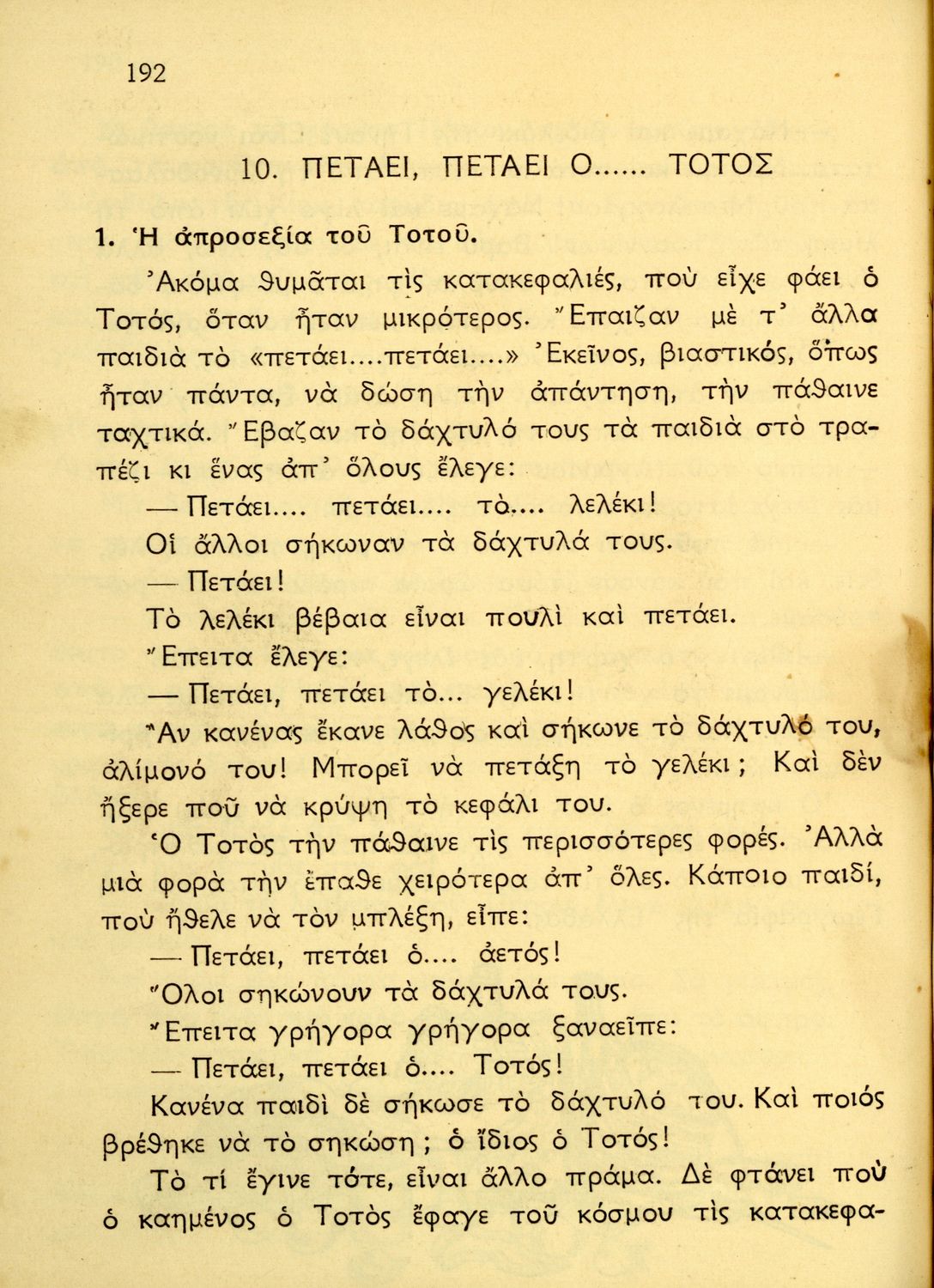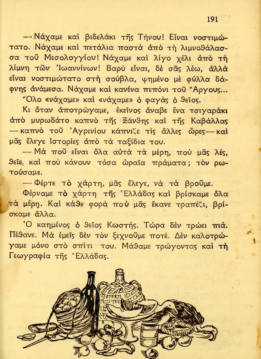 Αναγνωστικό Δ΄ Δημοτικού που περιέχει κείμενα εμπνευσμένα από την ζωή στην ύπαιθρο, την οικογενειακή ζωή, την αγάπη για τα ζώα, τη θρησκευτική παράδοση, την κοινωνική ζωή, την εθνική ζωή και προσήλωση στα εθνικά σύμβολα. 'Όντας σχολικό βιβλίο του μεταξικού καθεστώτος περιέχει χαρακτηριστικά δείγματα της μεταξικής προπαγάνδας και λογικής που παρουσιάζουν τον Ι. Μεταξά, ως μάγο, αρχηγό και κυβερνήτη της Ελλάδας. Όπως όλα τα βιβλία του καθεστώτος φέρει τη ρήση του Μεταξά "Είστε Ελληνόπουλα και είναι μεγάλο πράγμα να είναι κανείς Έλλην".