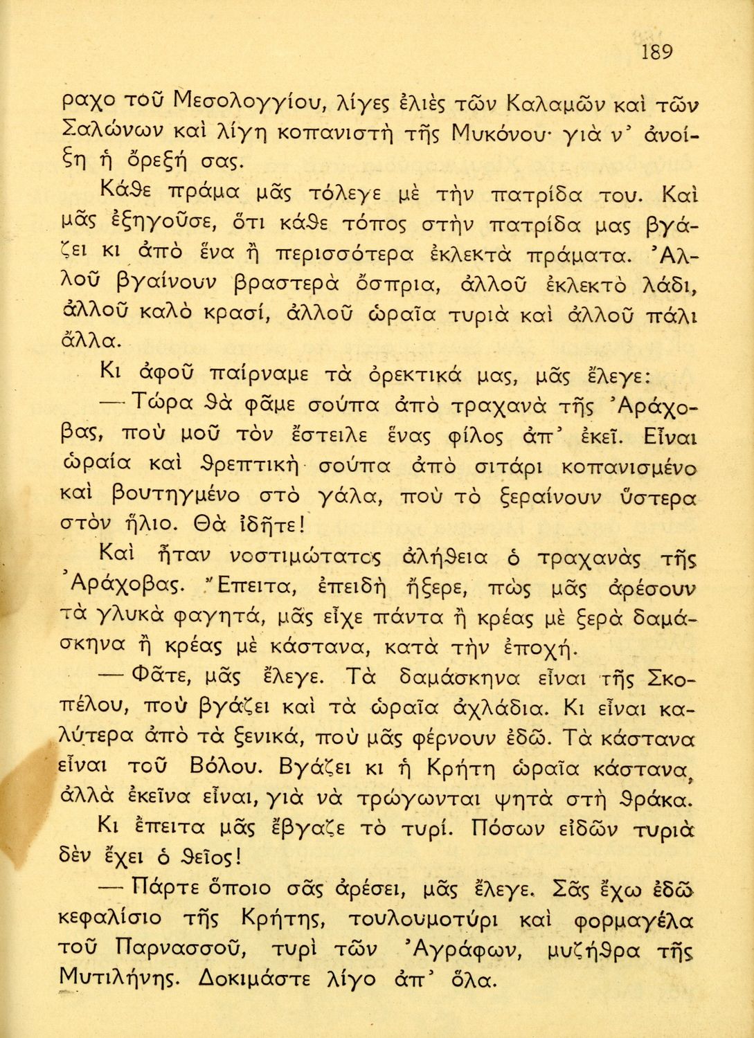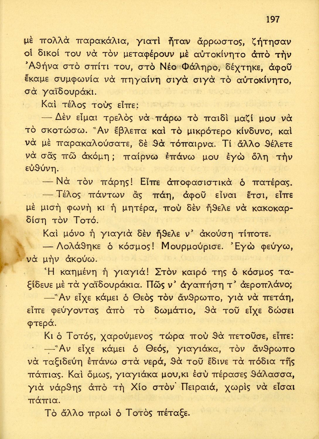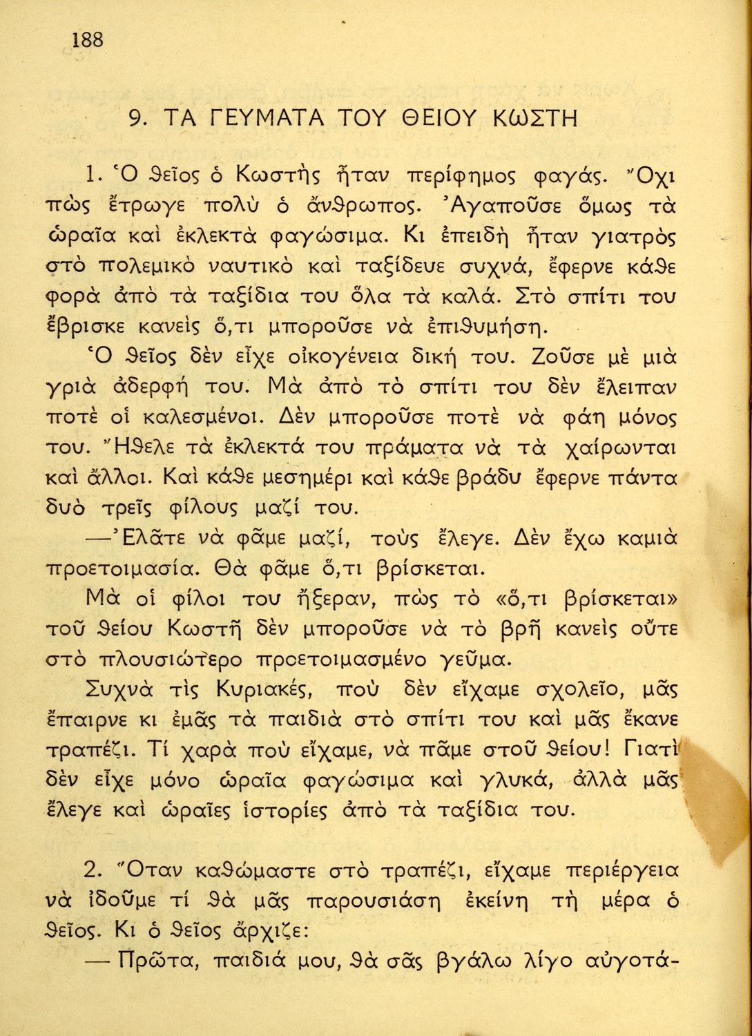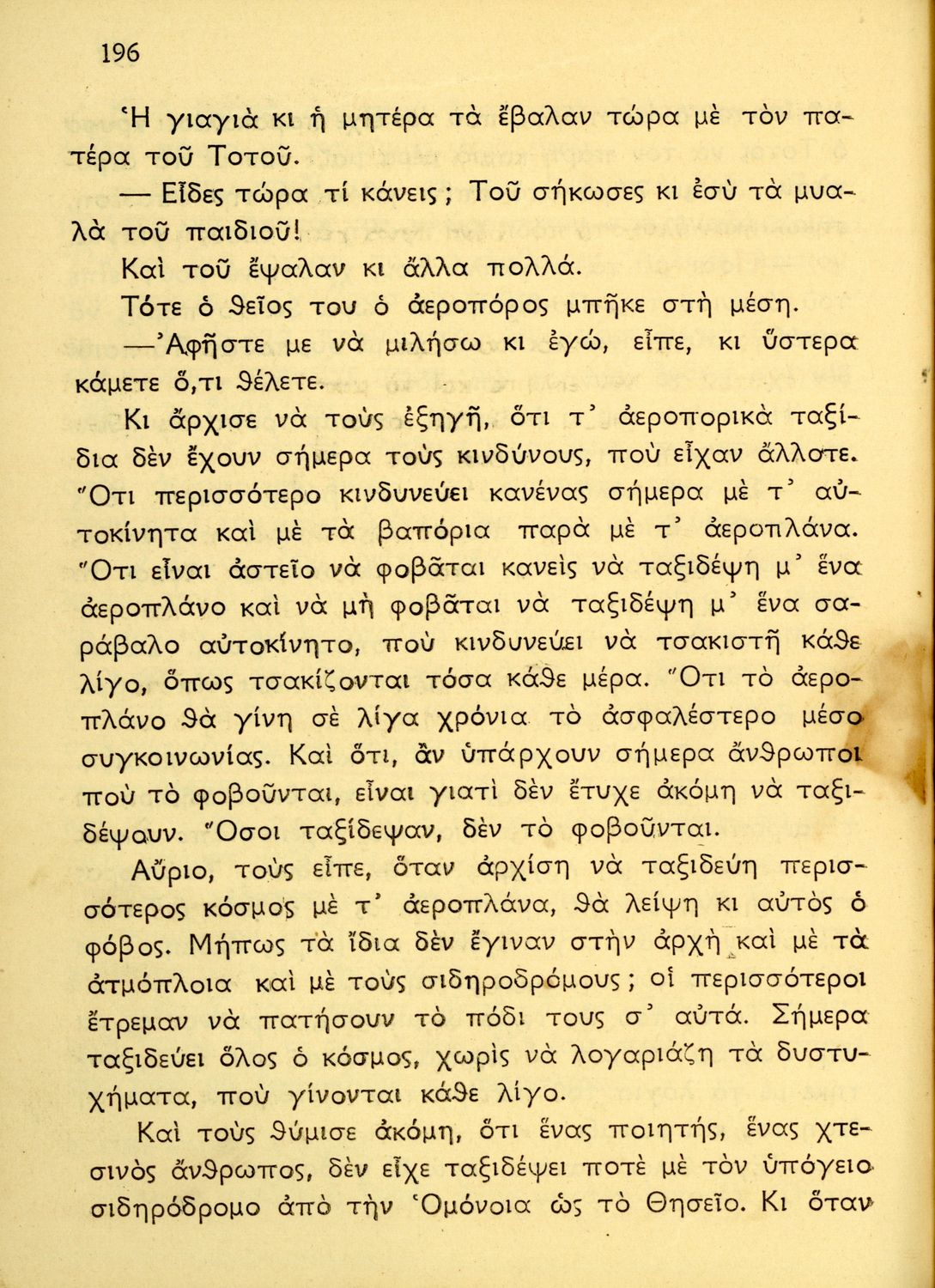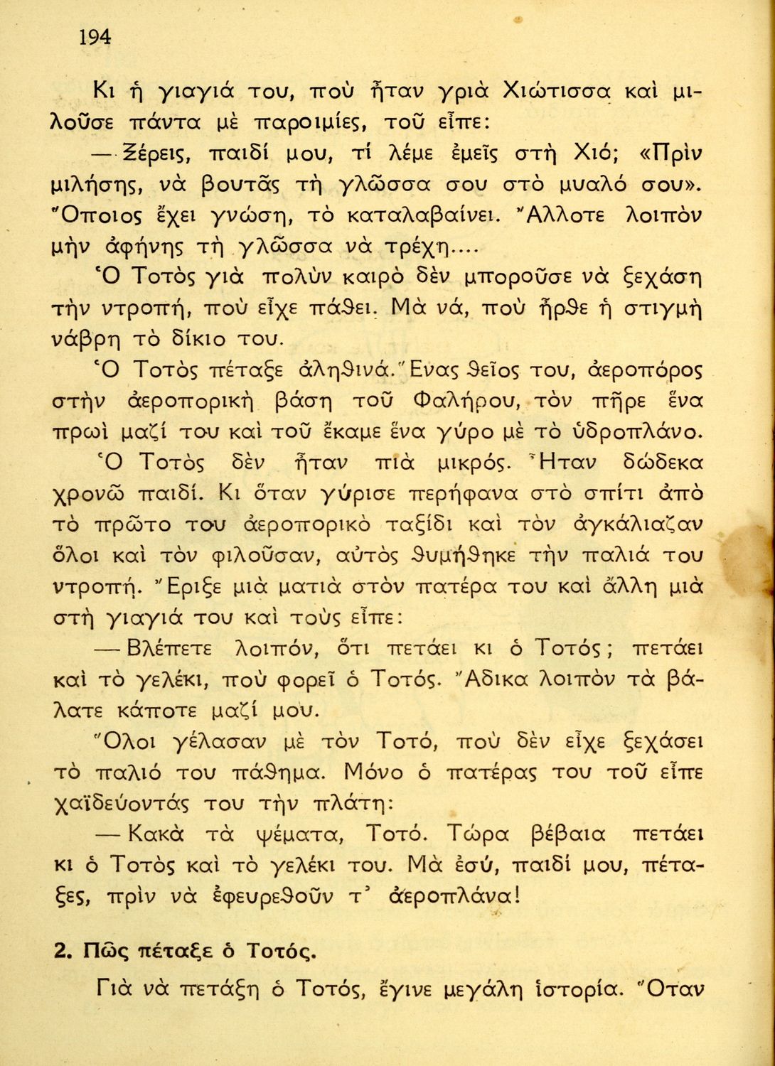 Αναγνωστικό Δ΄ Δημοτικού που περιέχει κείμενα εμπνευσμένα από την ζωή στην ύπαιθρο, την οικογενειακή ζωή, την αγάπη για τα ζώα, τη θρησκευτική παράδοση, την κοινωνική ζωή, την εθνική ζωή και προσήλωση στα εθνικά σύμβολα. 'Όντας σχολικό βιβλίο του μεταξικού καθεστώτος περιέχει χαρακτηριστικά δείγματα της μεταξικής προπαγάνδας και λογικής που παρουσιάζουν τον Ι. Μεταξά, ως μάγο, αρχηγό και κυβερνήτη της Ελλάδας. Όπως όλα τα βιβλία του καθεστώτος φέρει τη ρήση του Μεταξά "Είστε Ελληνόπουλα και είναι μεγάλο πράγμα να είναι κανείς Έλλην".