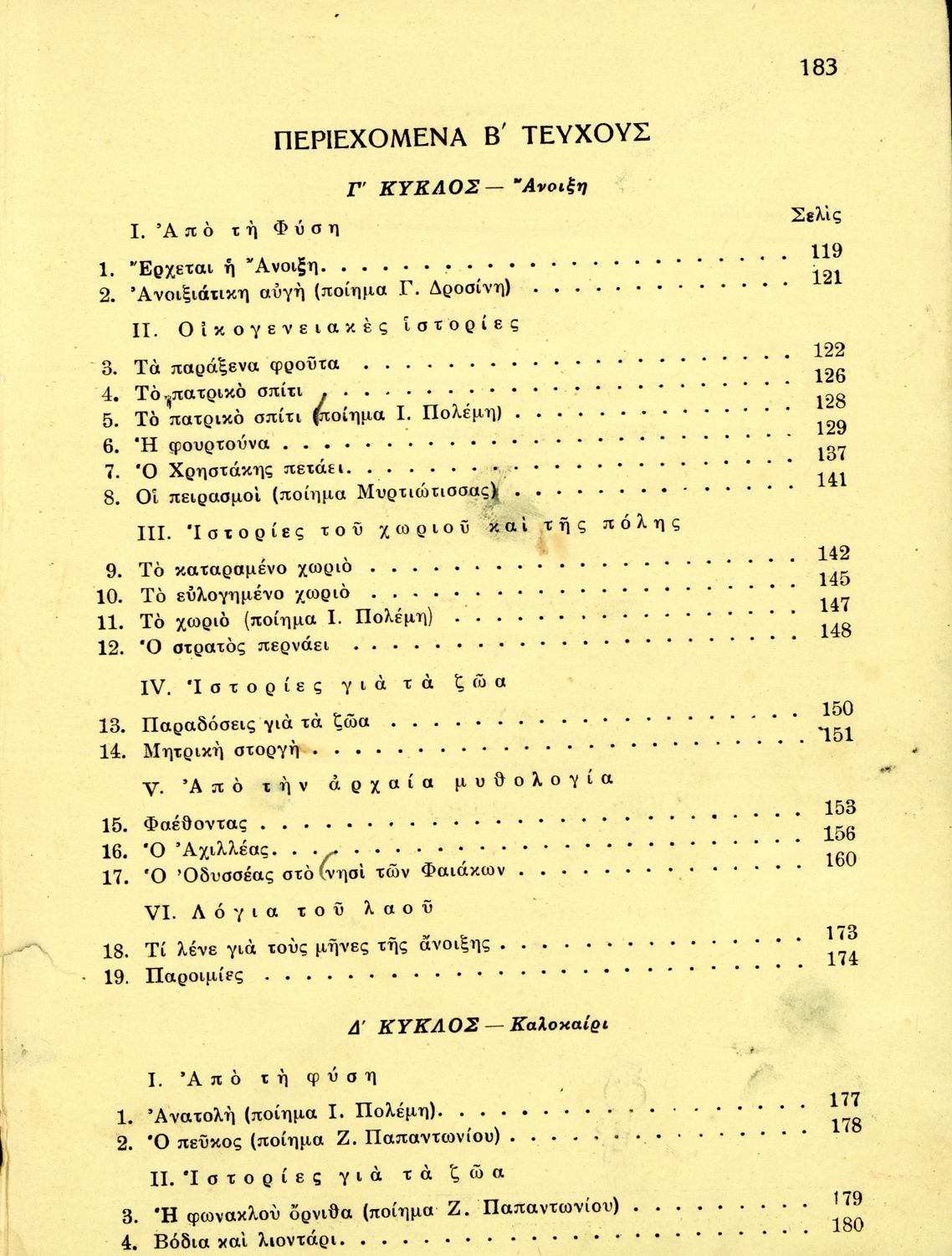 Αναγνωστικό Β΄ Δημοτικού που περιέχει ποιήματα και πεζά που αντλούν τα θέματά τους από τη φύση και την παράδοση της Ελλάδας και την κοινωνική και επαγγελματική ζωή των κατοίκων της.