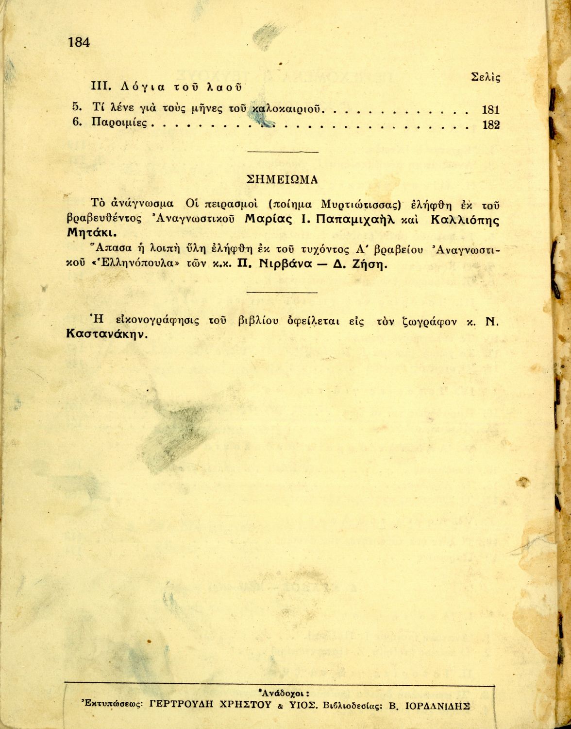 Αναγνωστικό Γ' Δημοτικού που περιέχει πεζά και ποιήματα εμπνευσμένα από τη θρησκευτική, εθνική, κοινωνική και ατομική ζωή, και την ελληνική φύση, ιστορία και μυθολογία.