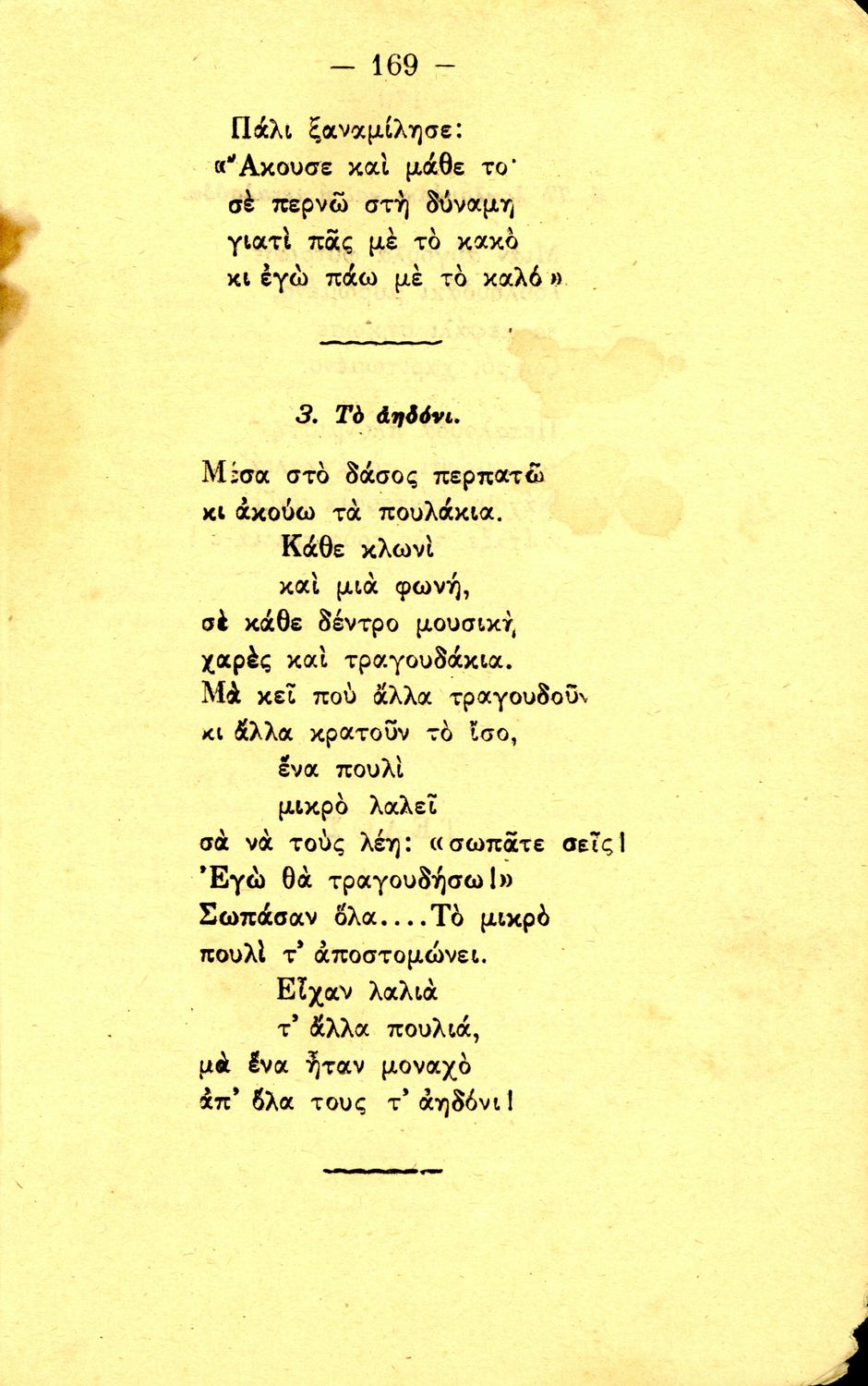 Αναγνωστικό Γ΄ Δημοτικού που περιλαμβάνει ποιήματα και πεζά με θέματα όπως η καλή και κακή συναναστροφή, η φρόνηση, η οκνηρία, η φιλανθρωπία και η πίστη στο Θεό