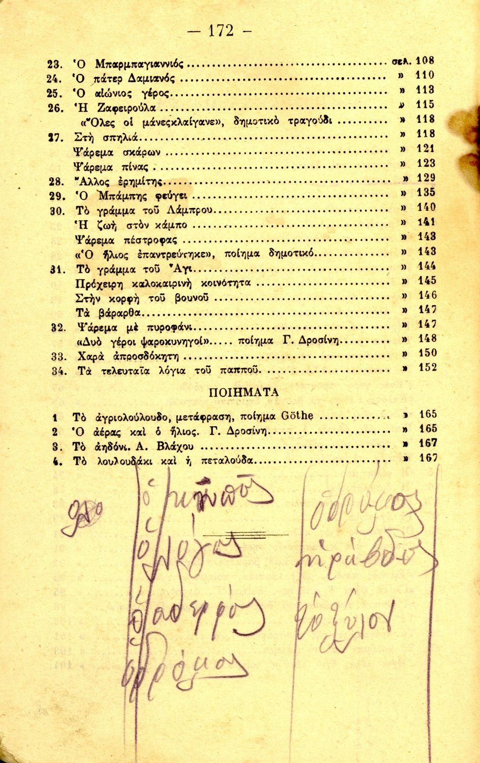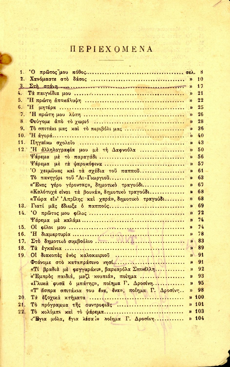 Αναγνωστικό Γ΄ Δημοτικού που περιλαμβάνει διηγήματα εμπνευσμένα από την οικογενειακή ζωή, την ελληνική ύπαιθρο, τις διαπροσωπικές σχέσεις και τα επαγγέλματα και τις ασχολίες των ανθρώπων. Περιέχει και 6 τραγούδια με τις παρτιτούρες τους.