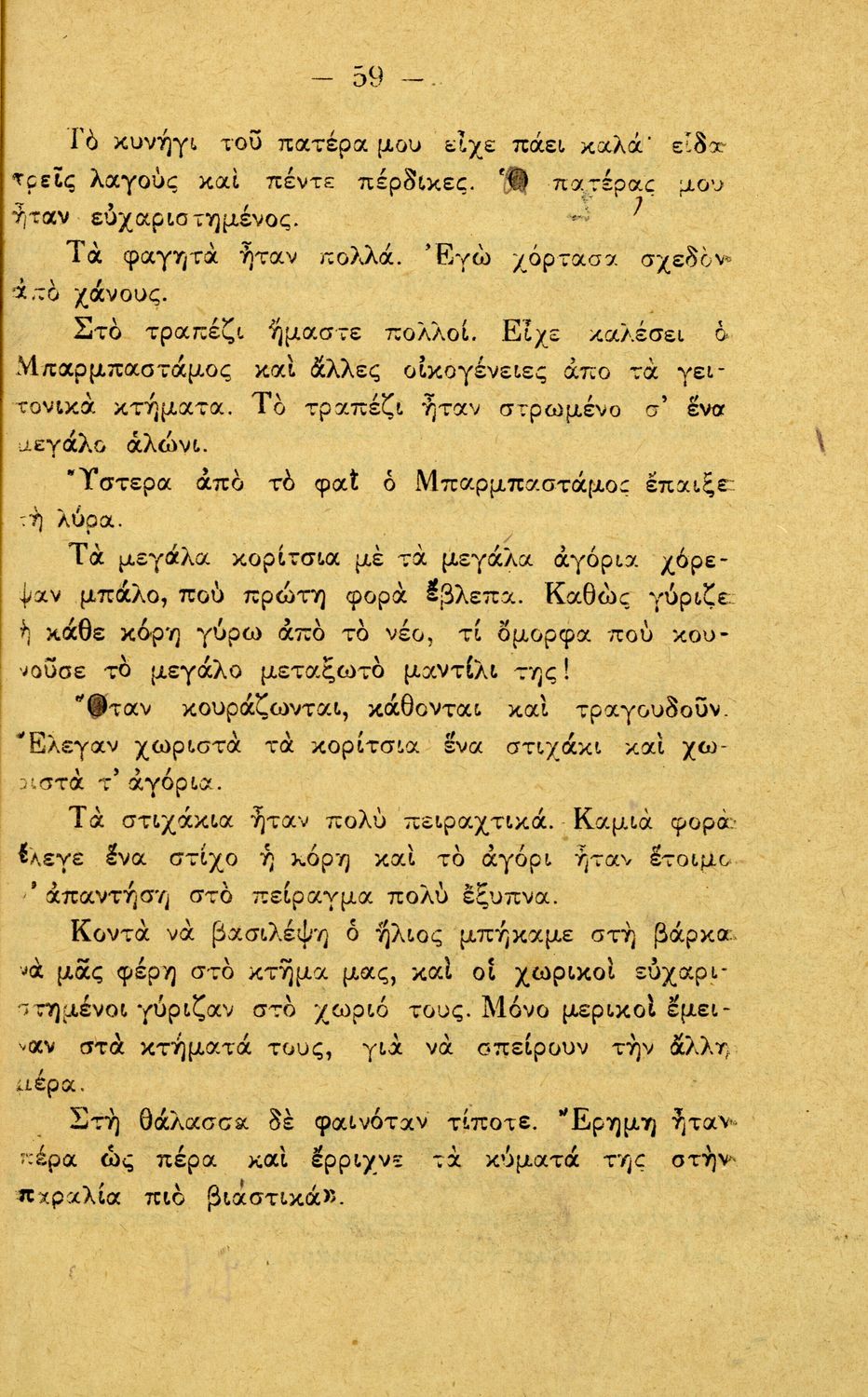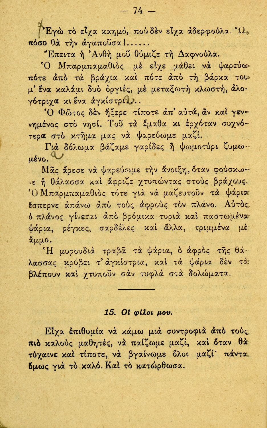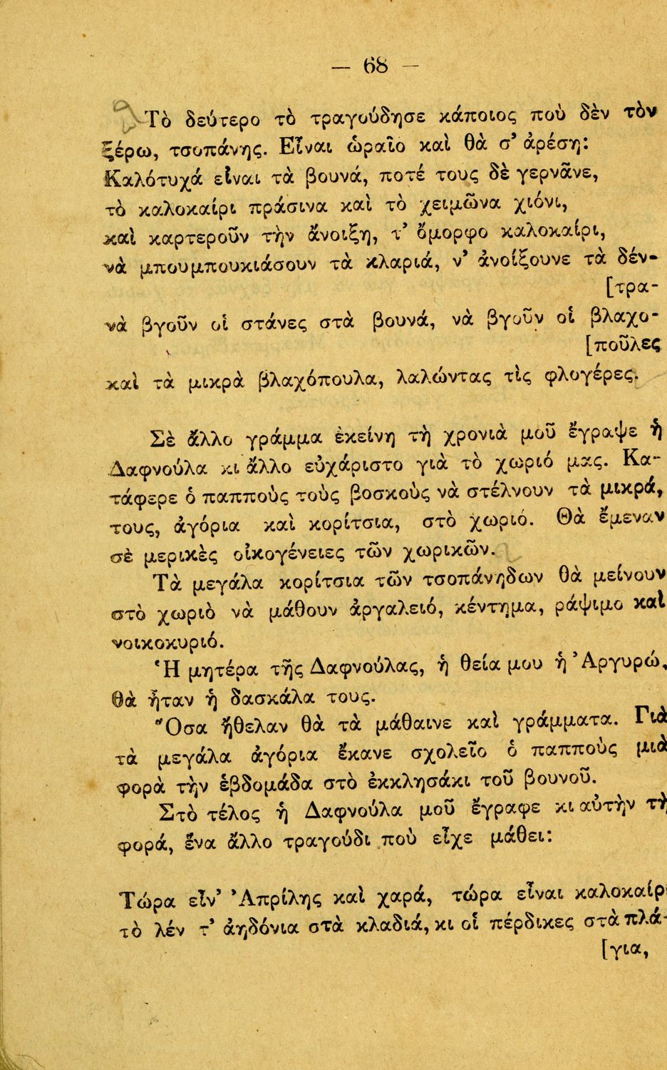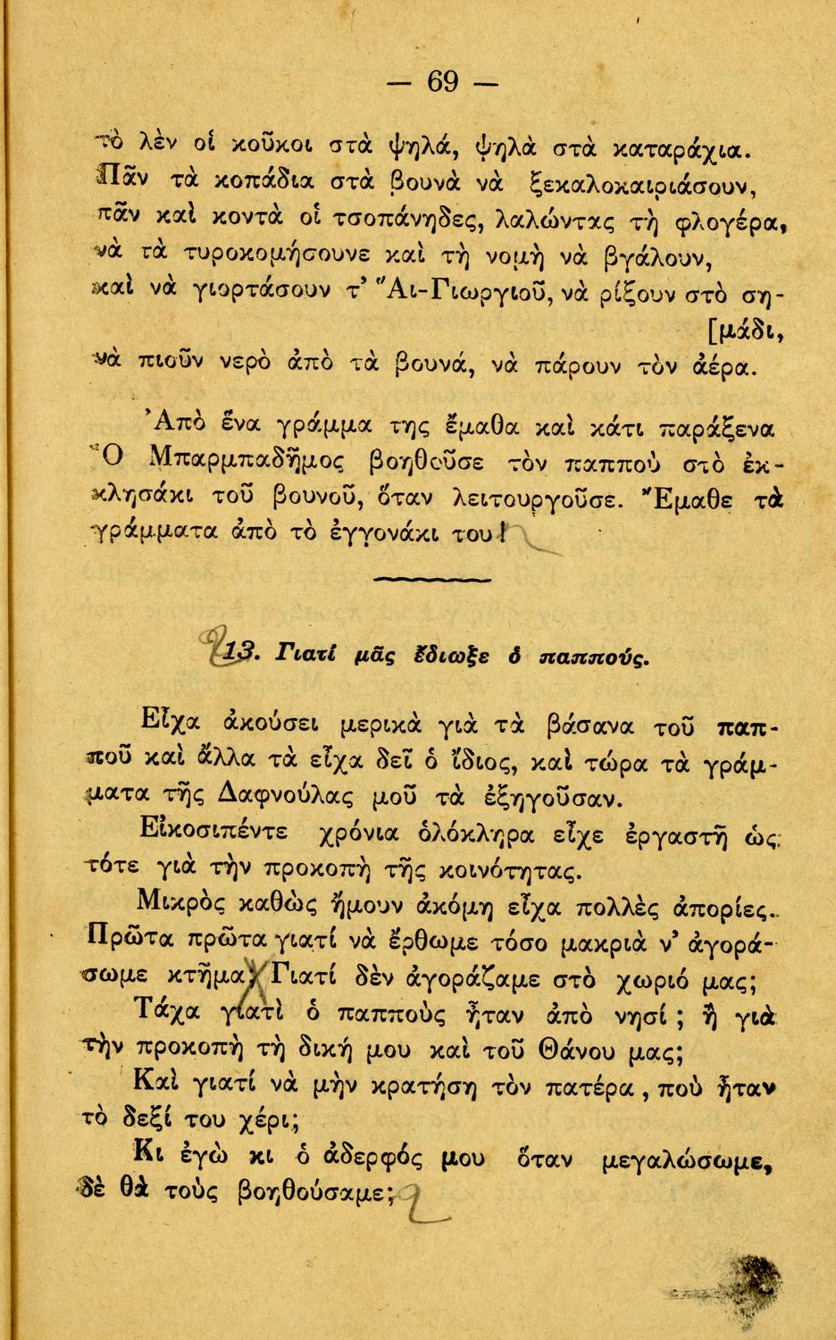 Αναγνωστικό Γ΄ Δημοτικού που περιλαμβάνει διηγήματα εμπνευσμένα από την οικογενειακή ζωή, την ελληνική ύπαιθρο, τις διαπροσωπικές σχέσεις και τα επαγγέλματα και τις ασχολίες των ανθρώπων. Περιέχει και 6 τραγούδια με τις παρτιτούρες τους.