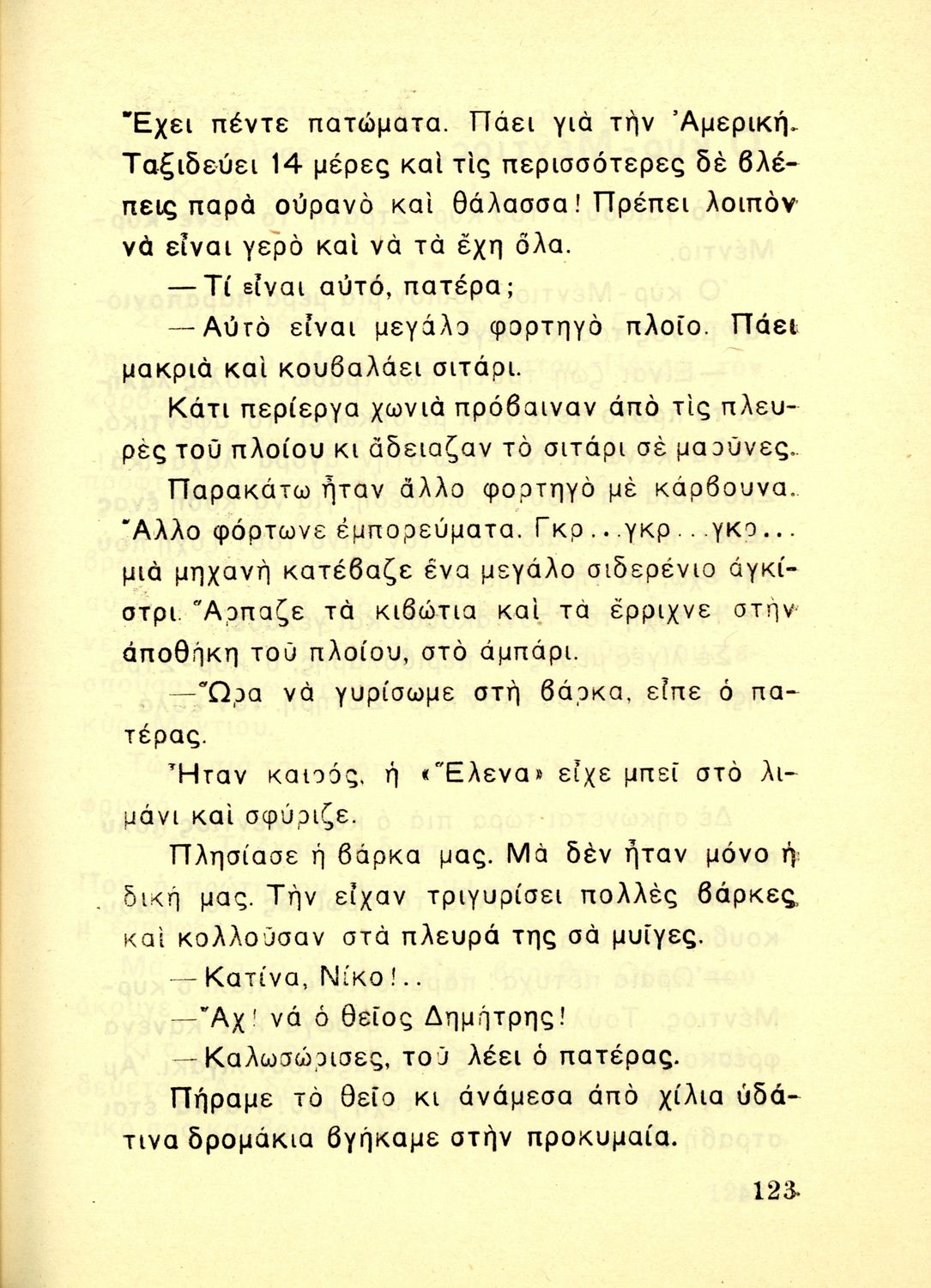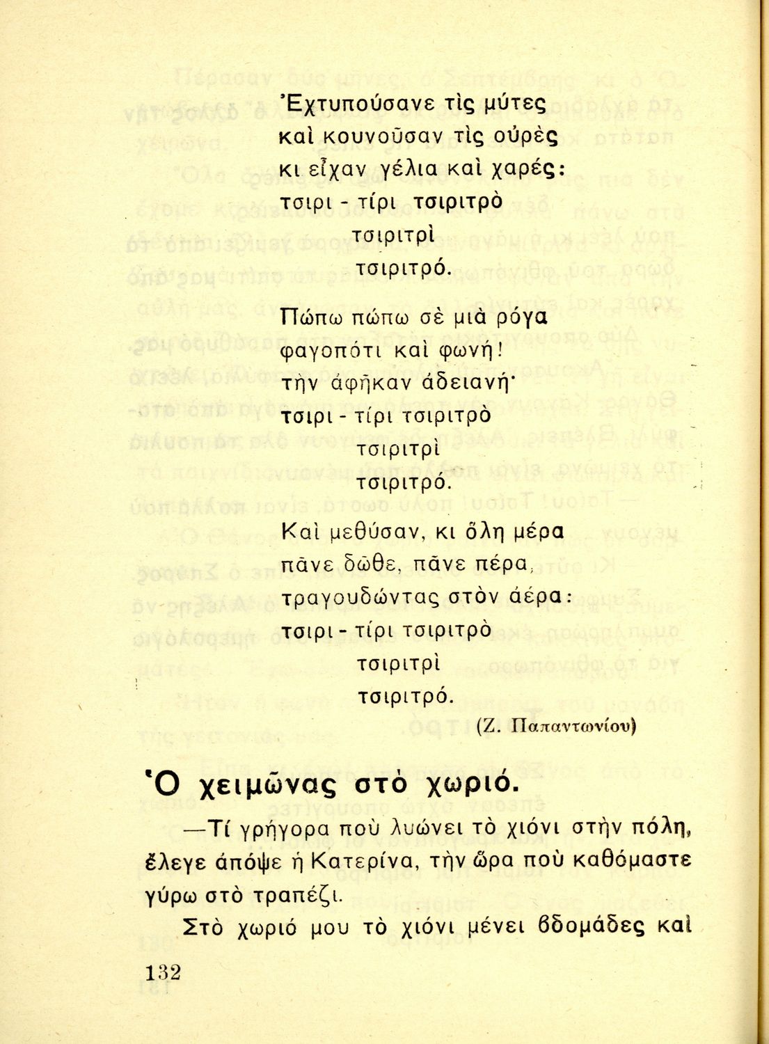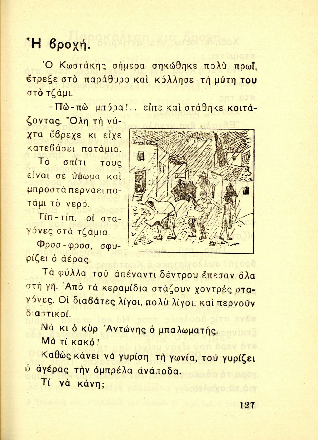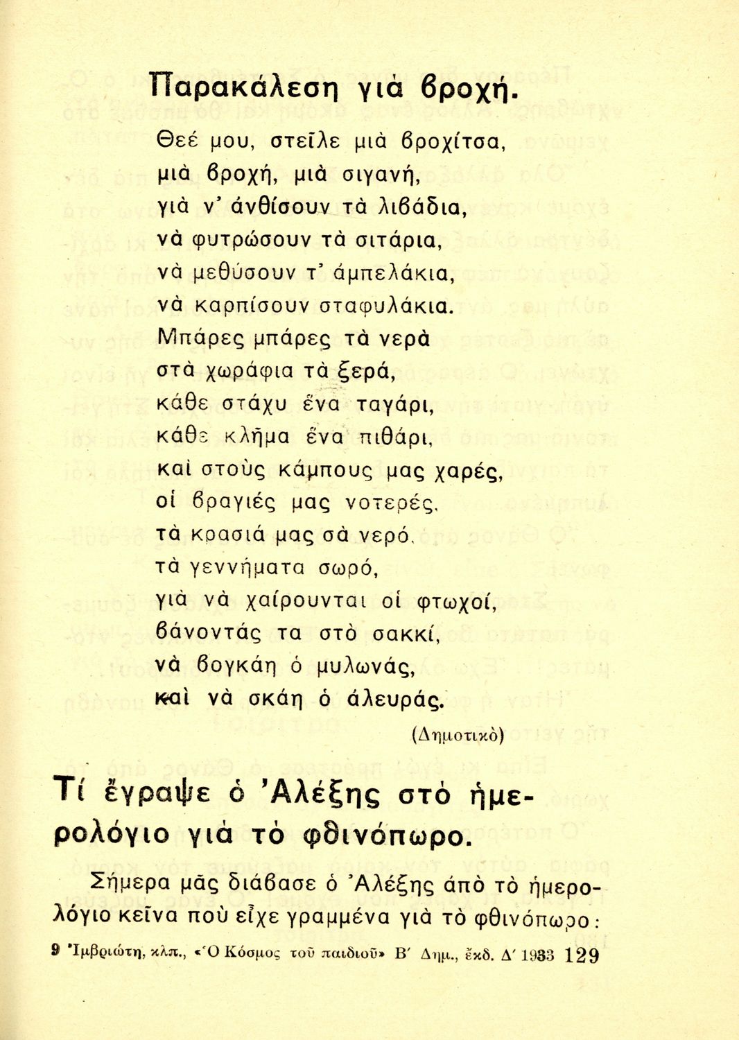 Αναγνωστικό Β΄ Δημοτικού που περιέχει ποιήματα και πεζά που αντλούν τα θέματά τους από τη φύση και την παράδοση της Ελλάδας και την κοινωνική και επαγγελματική ζωή των κατοίκων της.