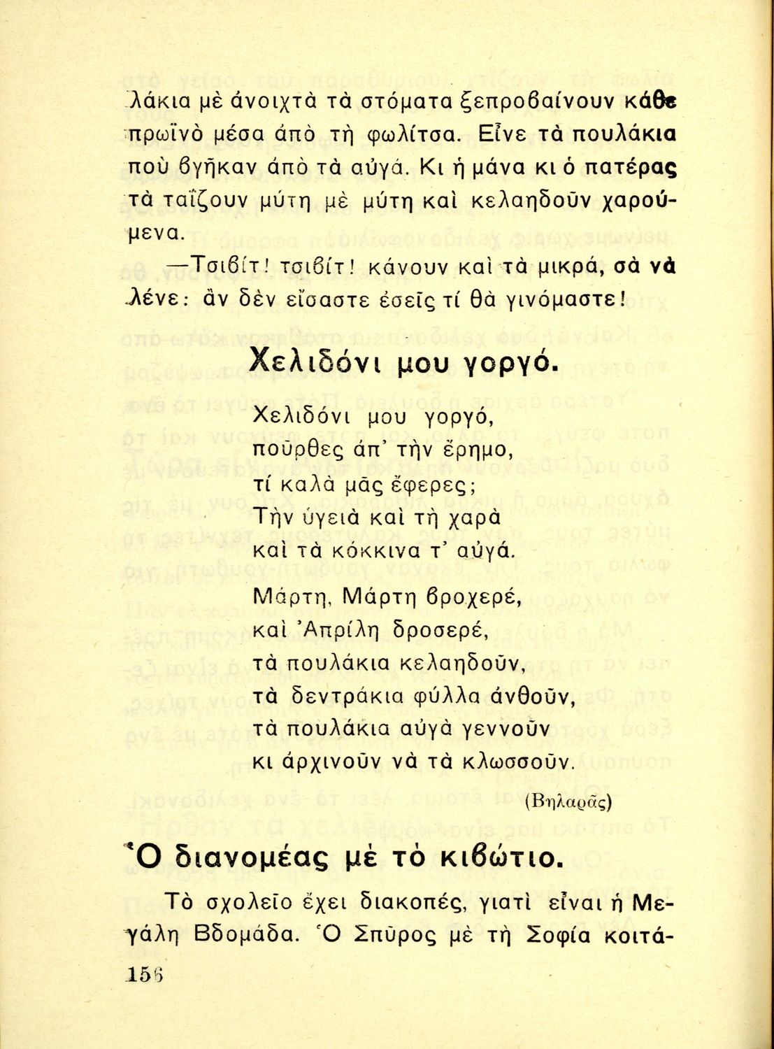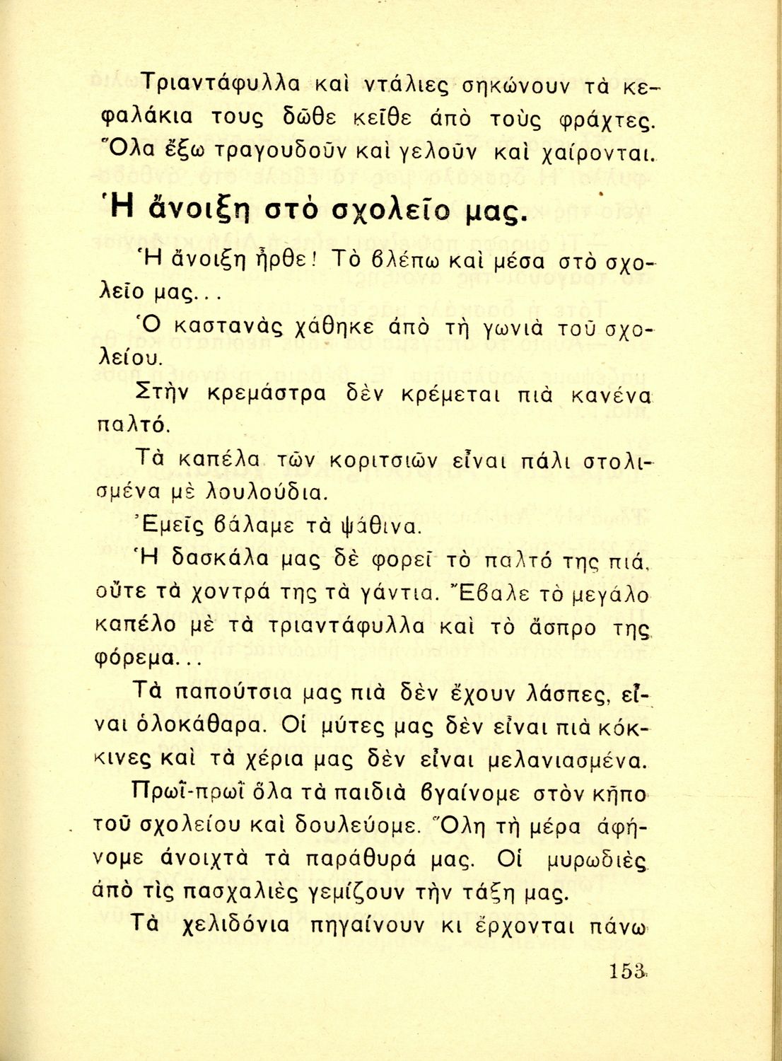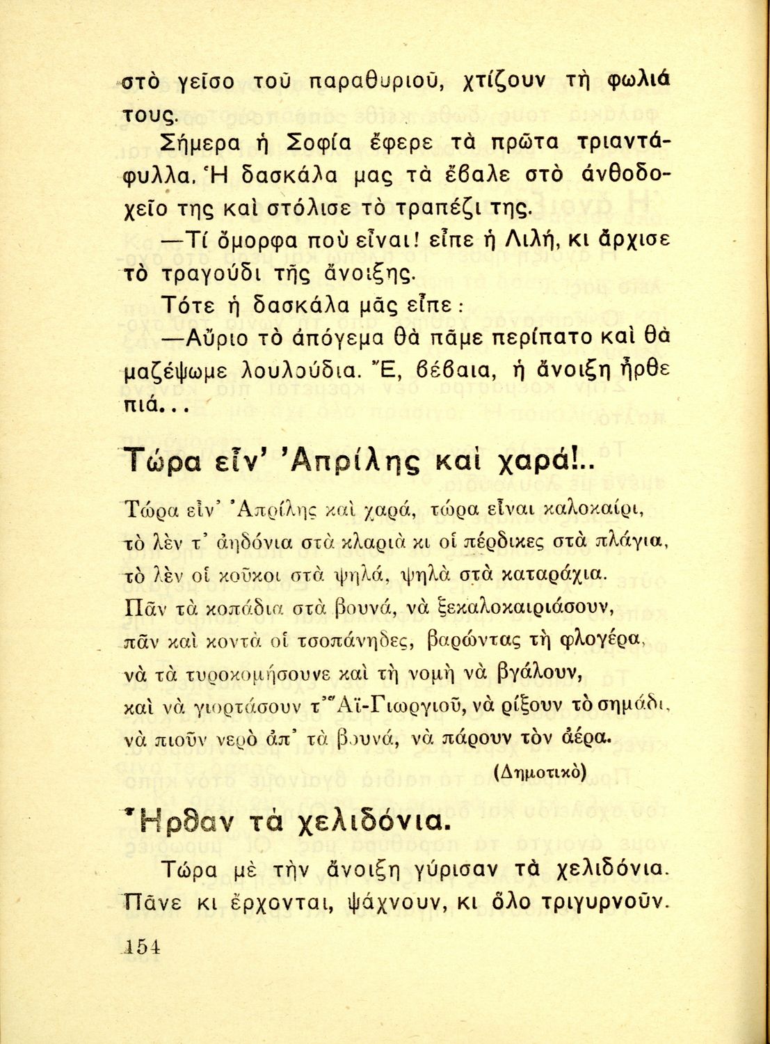 Αναγνωστικό Β΄ Δημοτικού που περιέχει ποιήματα και πεζά που αντλούν τα θέματά τους από τη φύση και την παράδοση της Ελλάδας και την κοινωνική και επαγγελματική ζωή των κατοίκων της.
