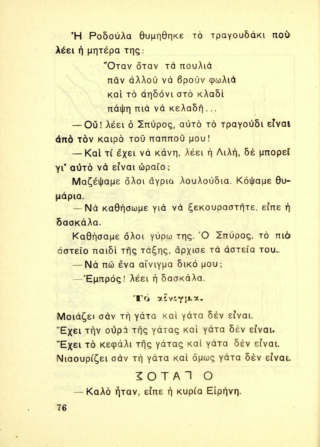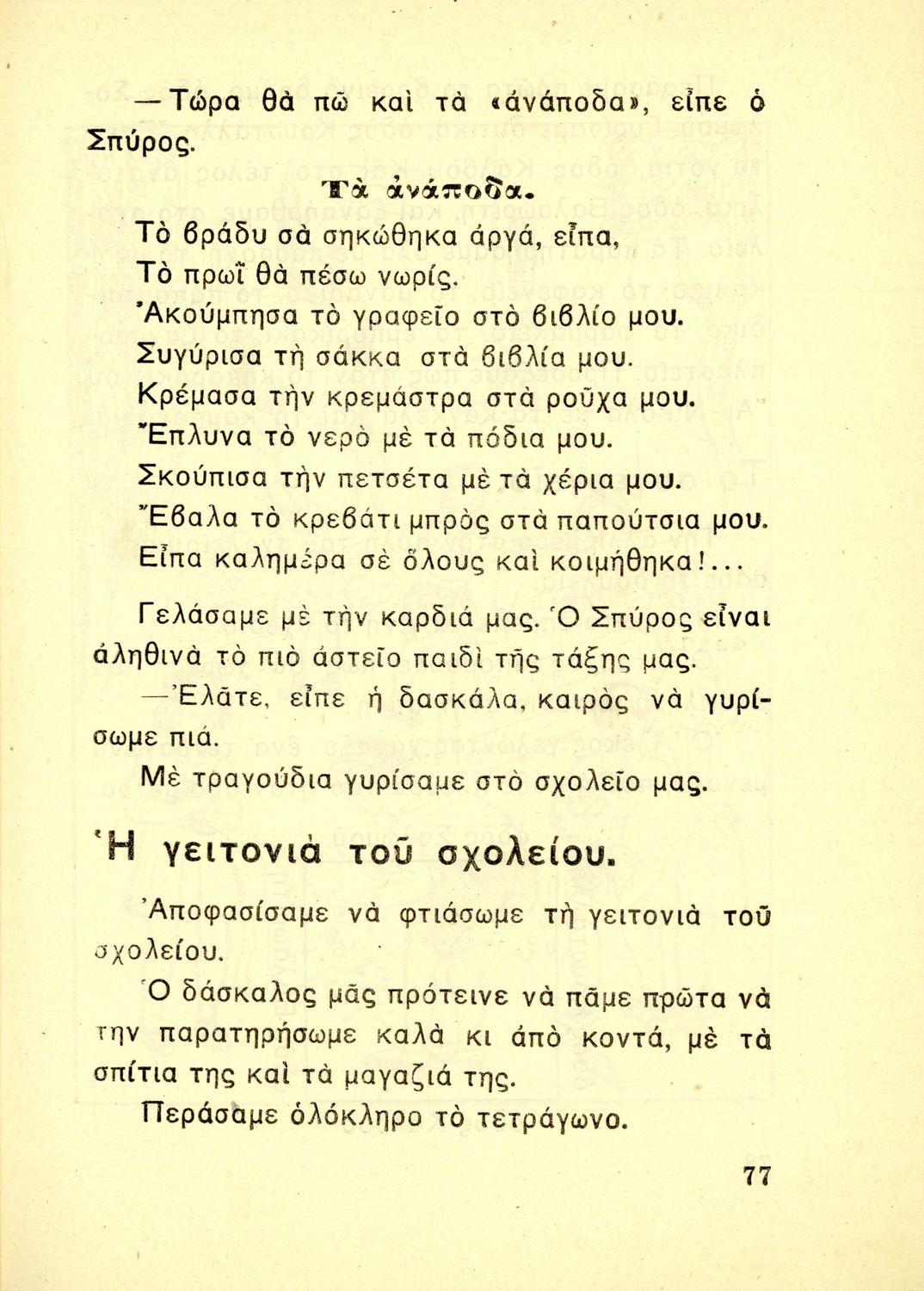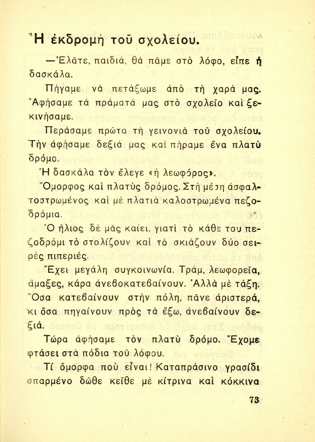 Αναγνωστικό Β΄ Δημοτικού που περιέχει ποιήματα και πεζά που αντλούν τα θέματά τους από τη φύση και την παράδοση της Ελλάδας και την κοινωνική και επαγγελματική ζωή των κατοίκων της.