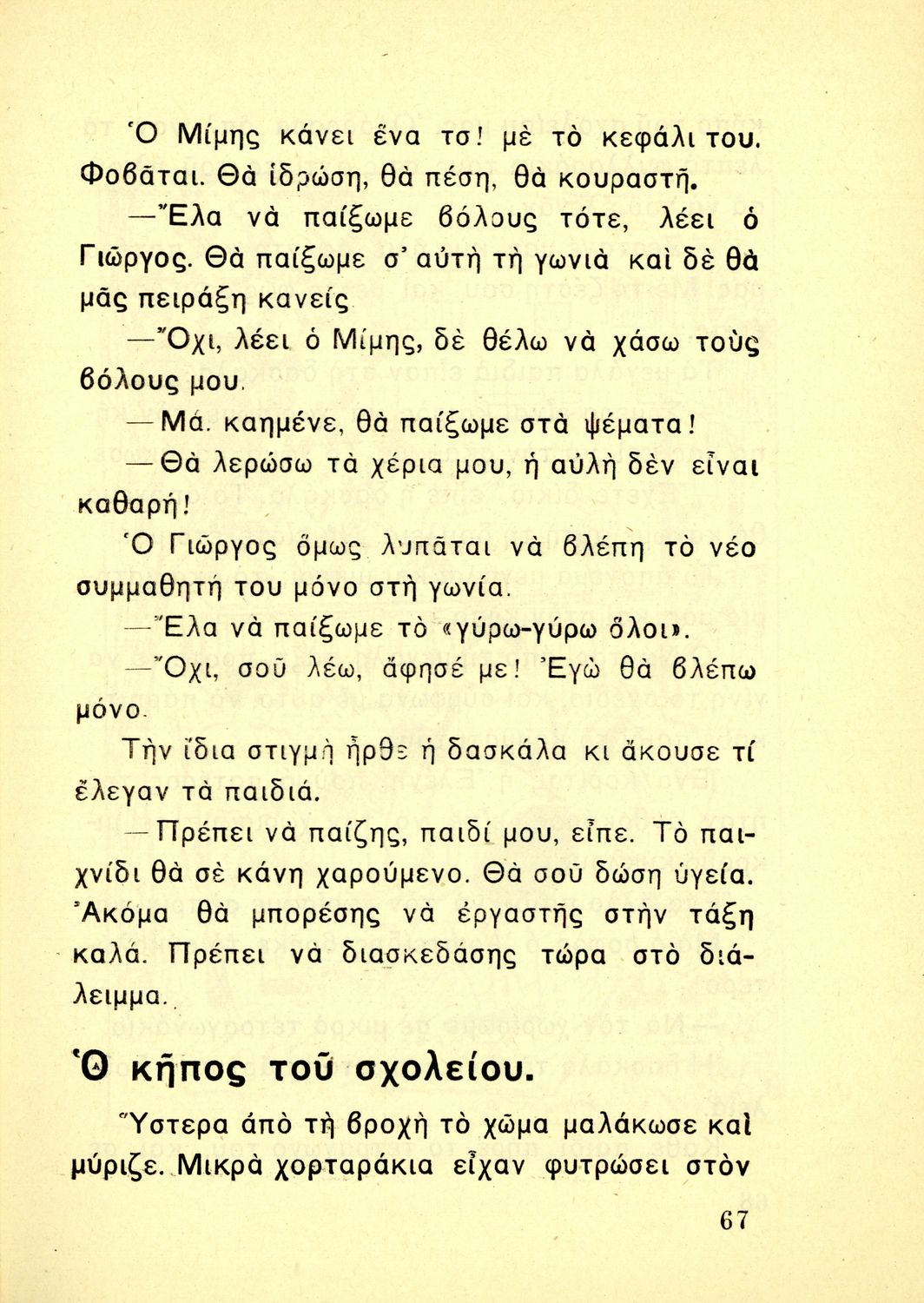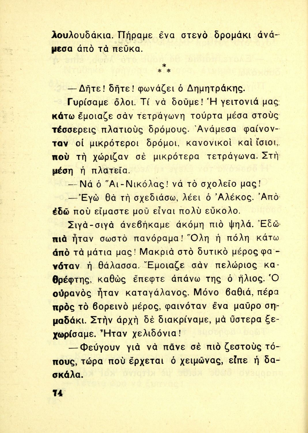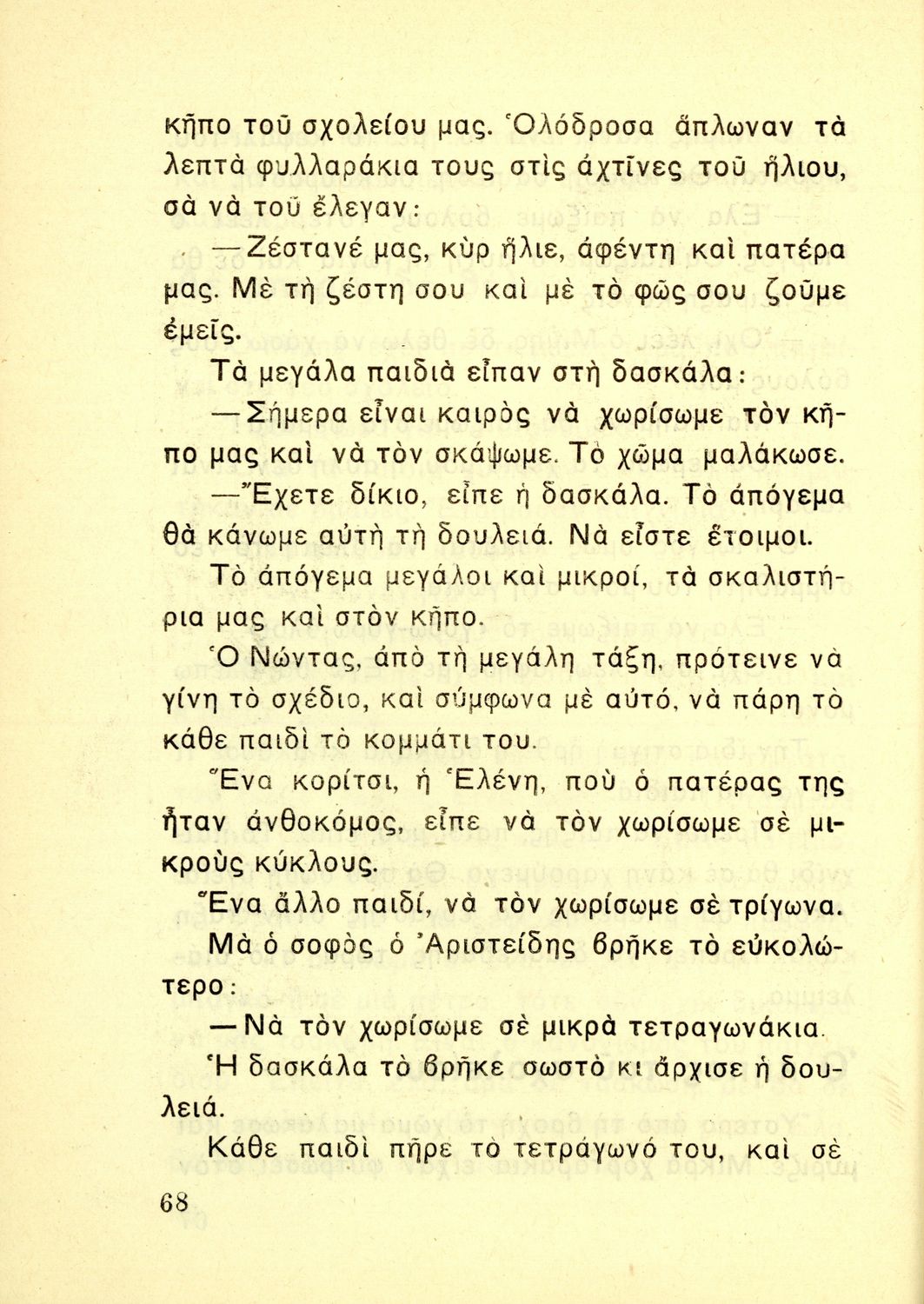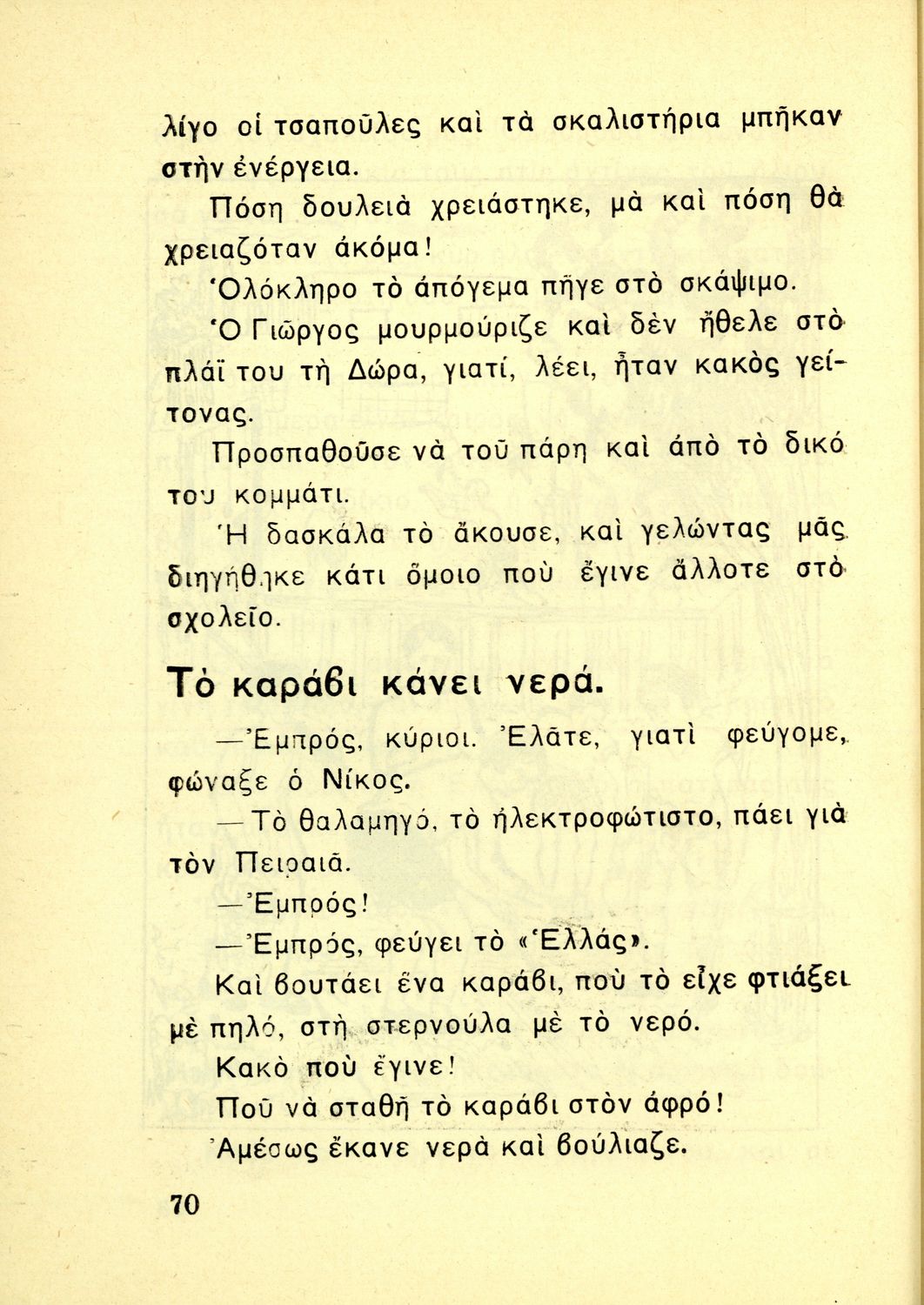 Αναγνωστικό Β΄ Δημοτικού που περιέχει ποιήματα και πεζά που αντλούν τα θέματά τους από τη φύση και την παράδοση της Ελλάδας και την κοινωνική και επαγγελματική ζωή των κατοίκων της.