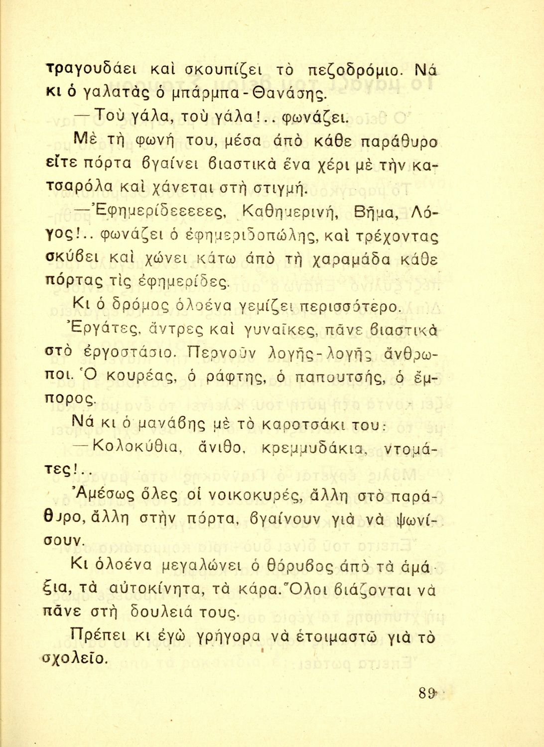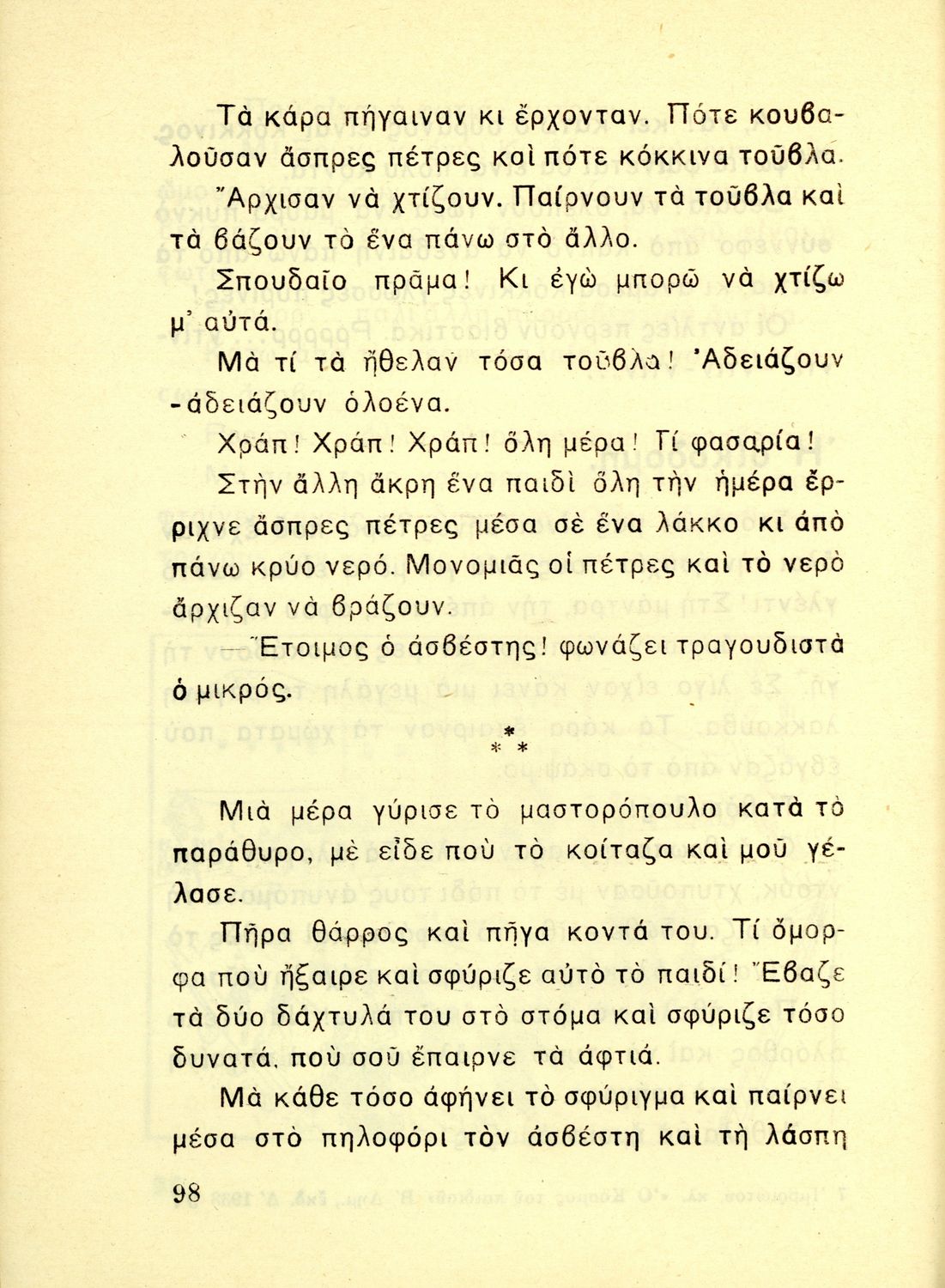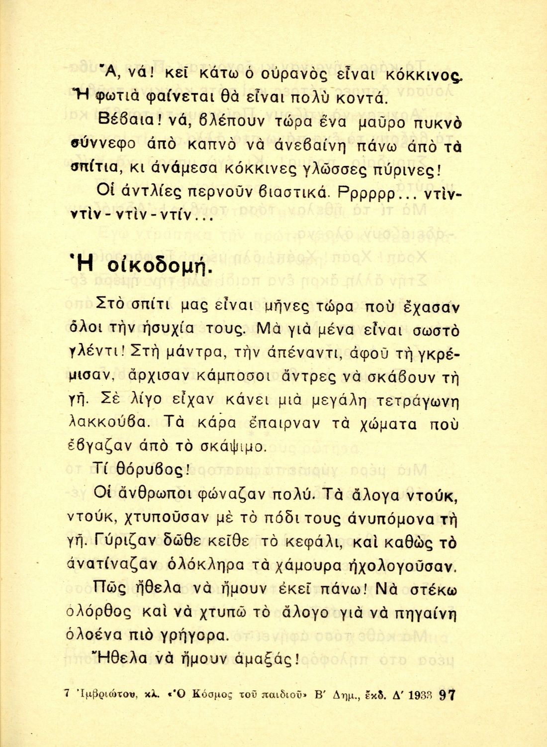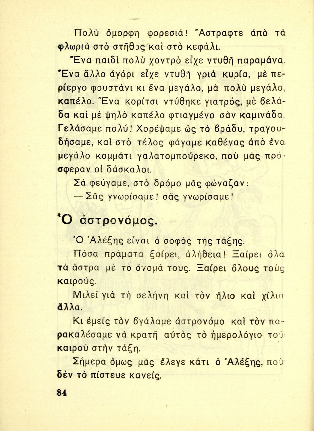 Αναγνωστικό Β΄ Δημοτικού που περιέχει ποιήματα και πεζά που αντλούν τα θέματά τους από τη φύση και την παράδοση της Ελλάδας και την κοινωνική και επαγγελματική ζωή των κατοίκων της.