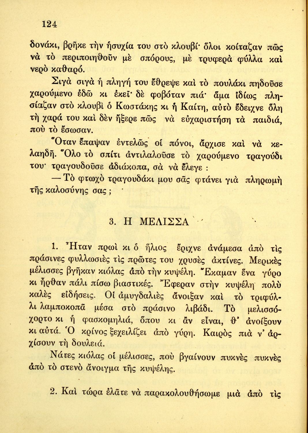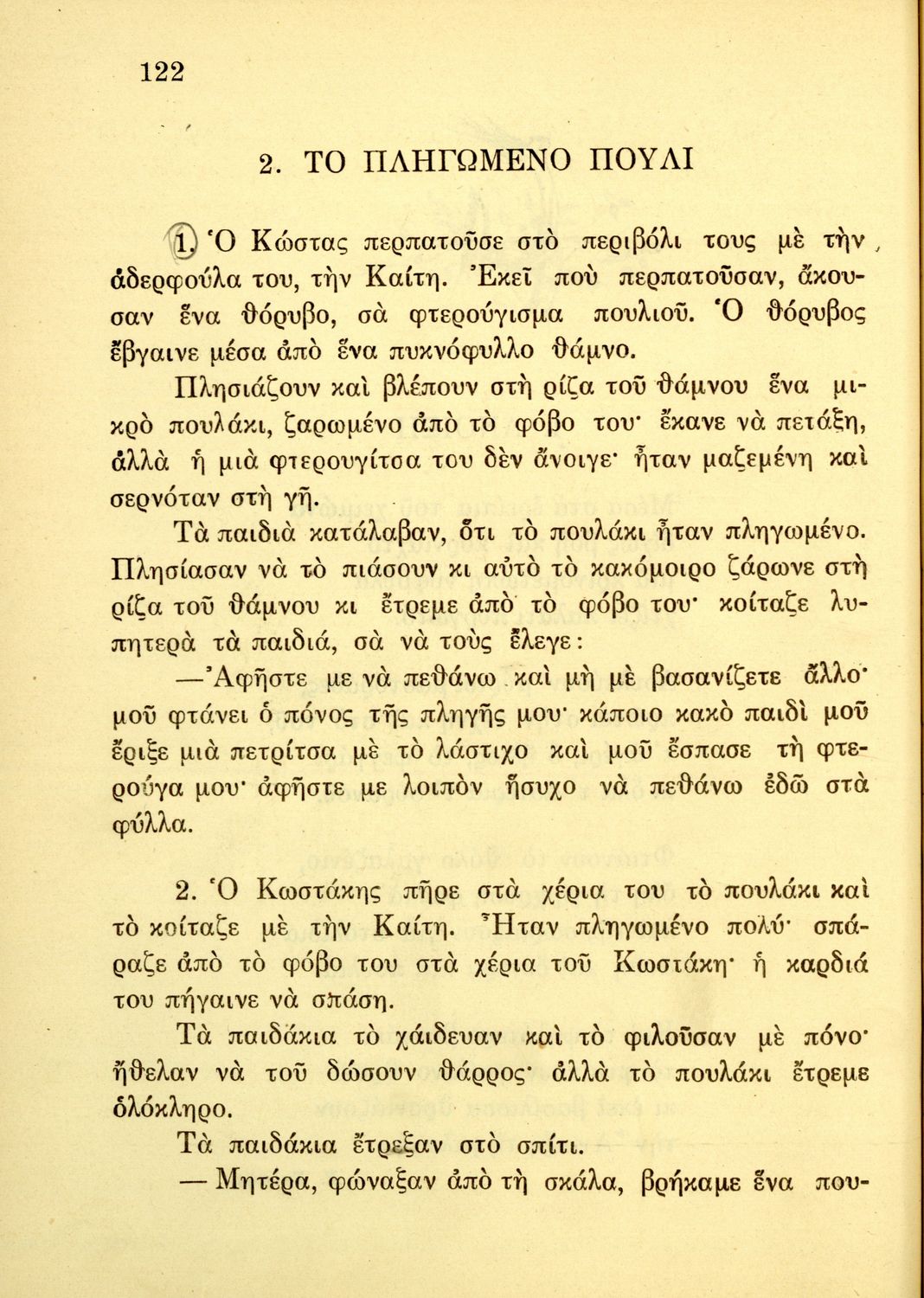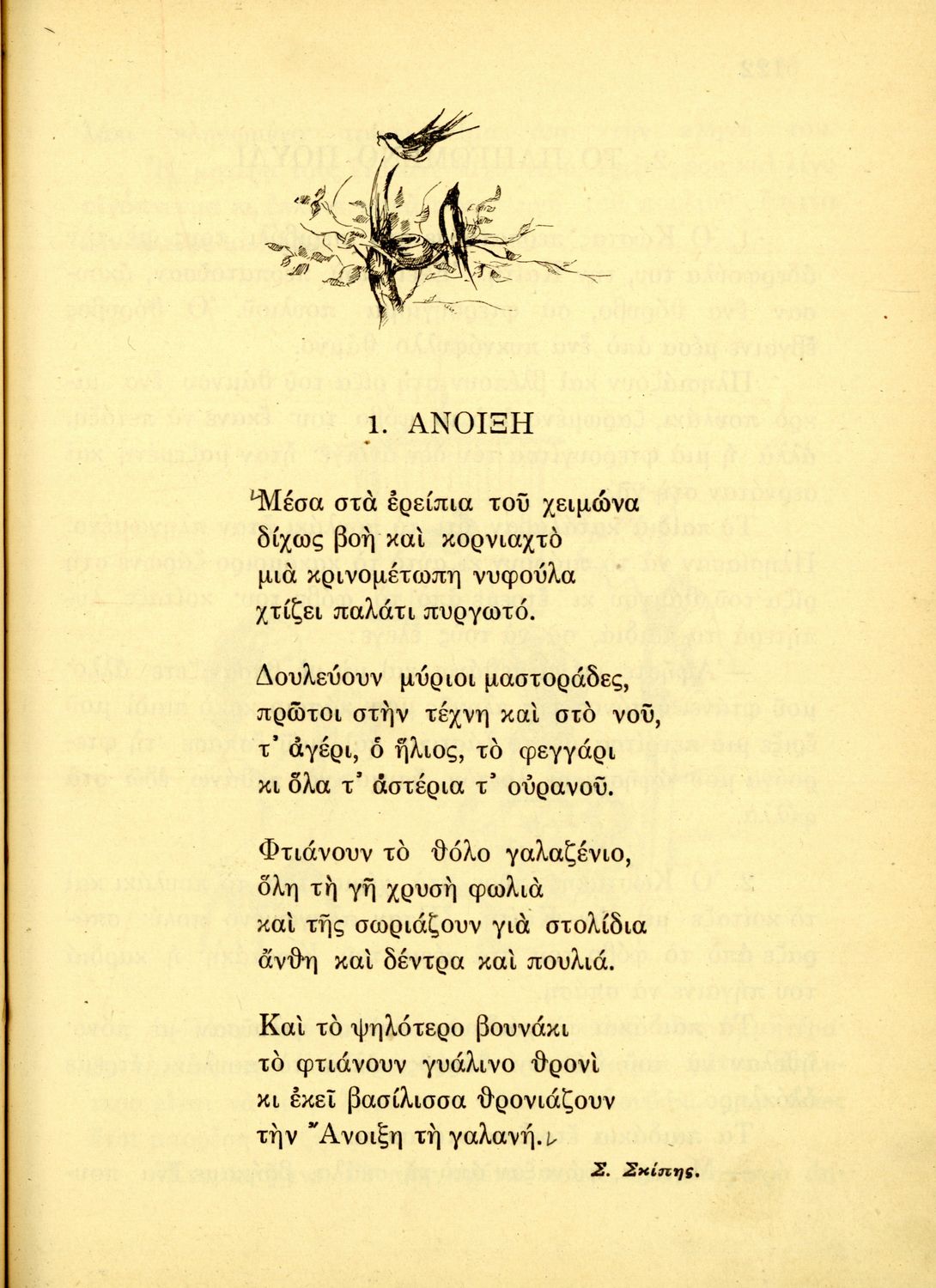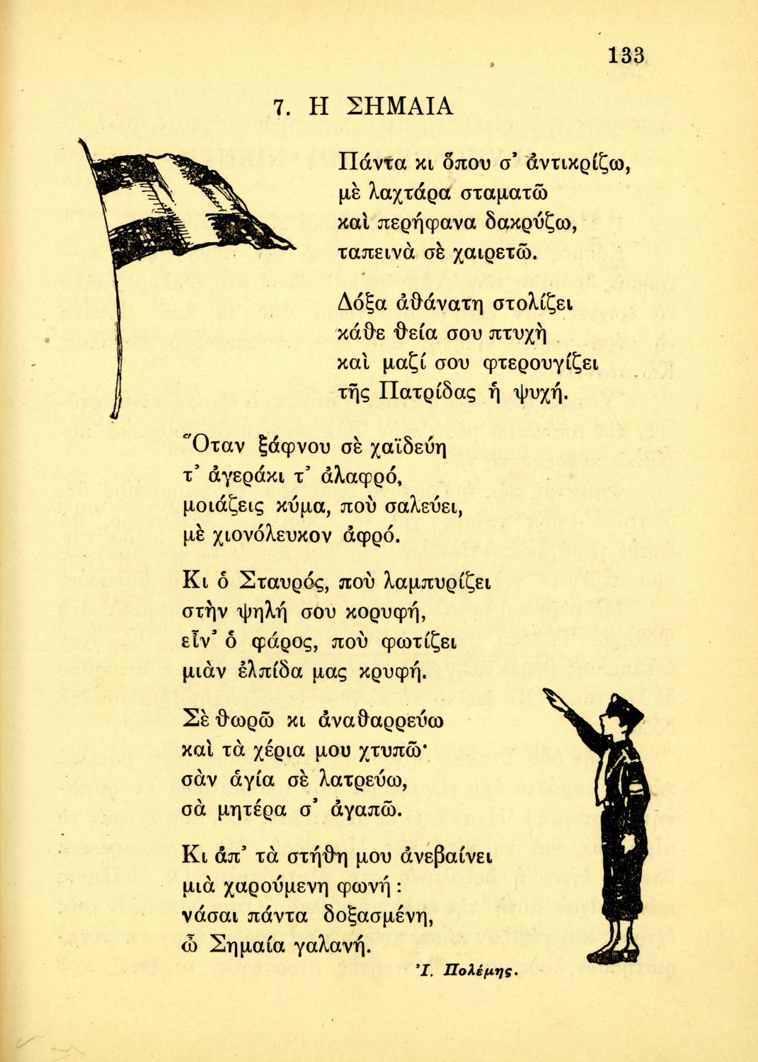 Αναγνωστικό Δ΄ Δημοτικού που περιέχει κείμενα εμπνευσμένα από την ζωή στην ύπαιθρο, την οικογενειακή ζωή, την αγάπη για τα ζώα, τη θρησκευτική παράδοση, την κοινωνική ζωή, την εθνική ζωή και προσήλωση στα εθνικά σύμβολα. 'Όντας σχολικό βιβλίο του μεταξικού καθεστώτος περιέχει χαρακτηριστικά δείγματα της μεταξικής προπαγάνδας και λογικής που παρουσιάζουν τον Ι. Μεταξά, ως μάγο, αρχηγό και κυβερνήτη της Ελλάδας. Όπως όλα τα βιβλία του καθεστώτος φέρει τη ρήση του Μεταξά "Είστε Ελληνόπουλα και είναι μεγάλο πράγμα να είναι κανείς Έλλην".