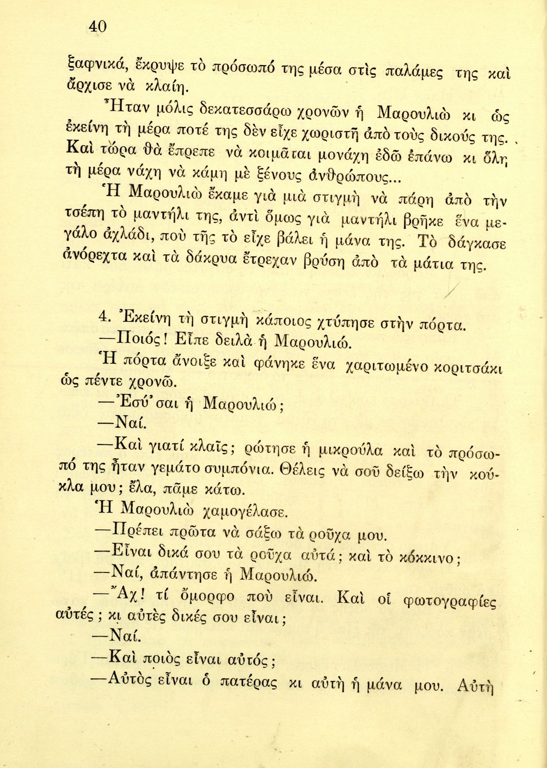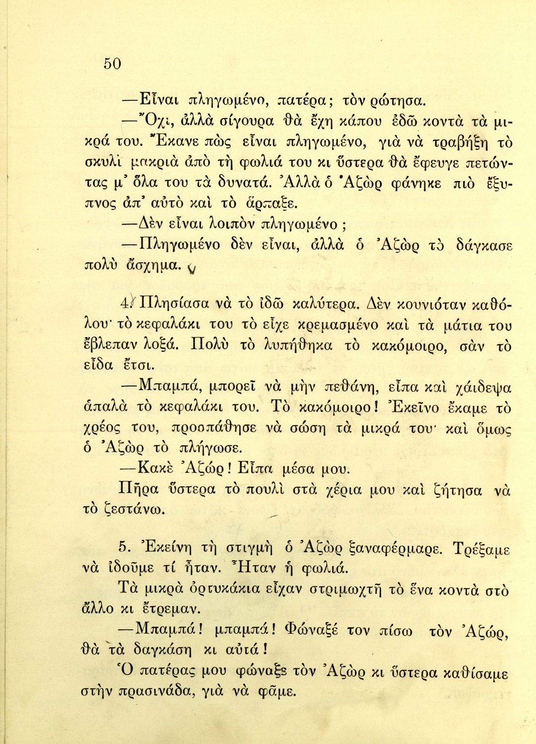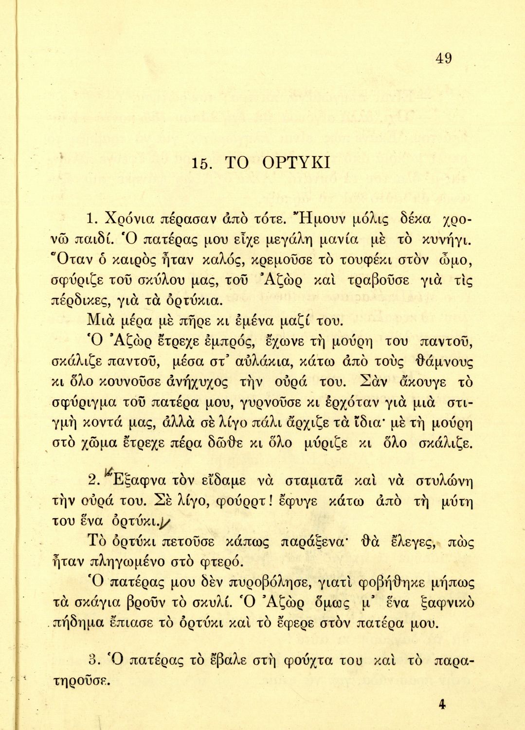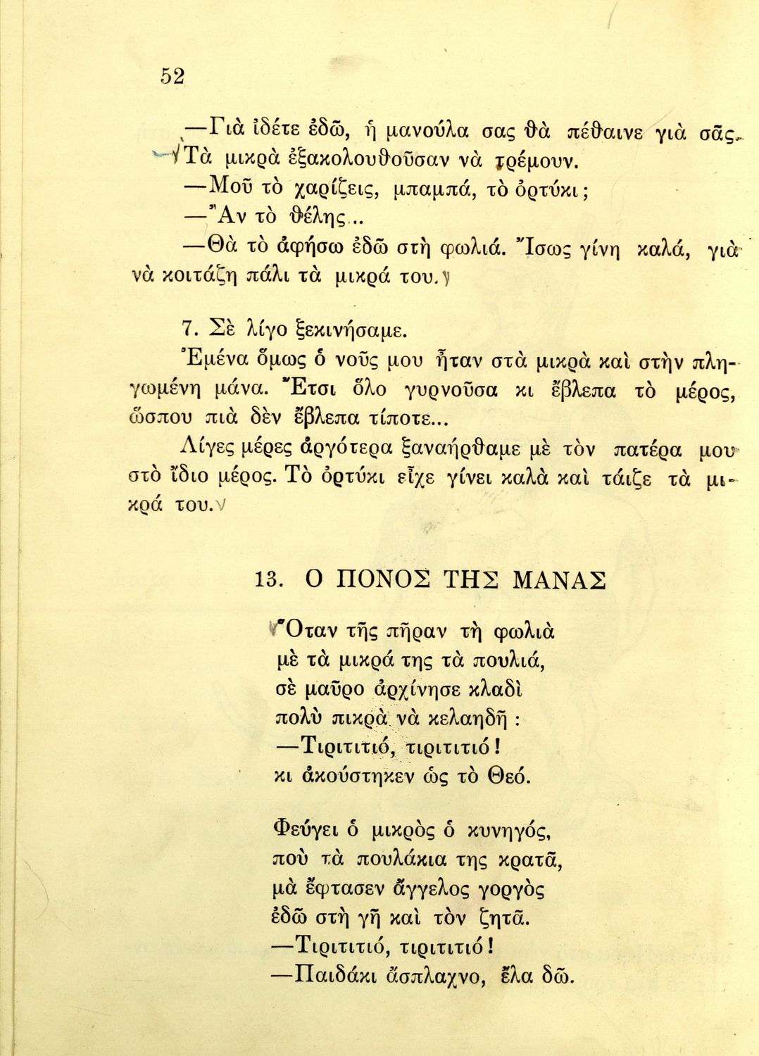 Αναγνωστικό Δ΄ Δημοτικού που περιέχει κείμενα εμπνευσμένα από την ζωή στην ύπαιθρο, την οικογενειακή ζωή, την αγάπη για τα ζώα, τη θρησκευτική παράδοση, την κοινωνική ζωή, την εθνική ζωή και προσήλωση στα εθνικά σύμβολα. 'Όντας σχολικό βιβλίο του μεταξικού καθεστώτος περιέχει χαρακτηριστικά δείγματα της μεταξικής προπαγάνδας και λογικής που παρουσιάζουν τον Ι. Μεταξά, ως μάγο, αρχηγό και κυβερνήτη της Ελλάδας. Όπως όλα τα βιβλία του καθεστώτος φέρει τη ρήση του Μεταξά "Είστε Ελληνόπουλα και είναι μεγάλο πράγμα να είναι κανείς Έλλην".