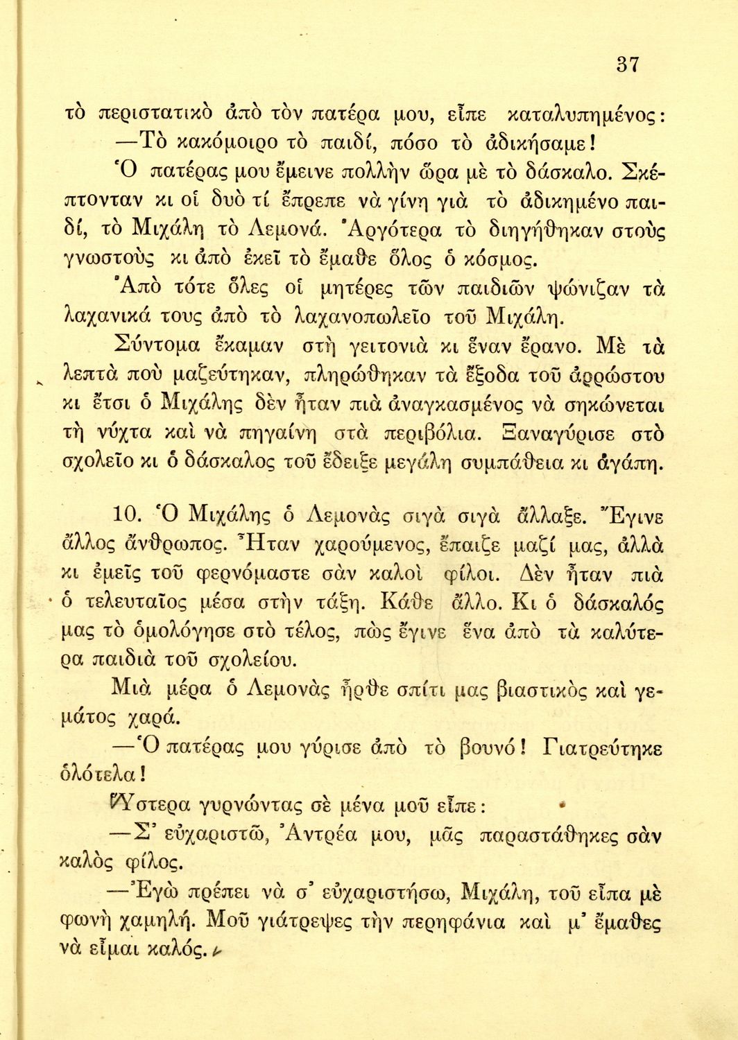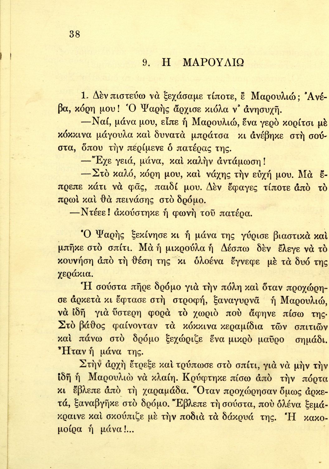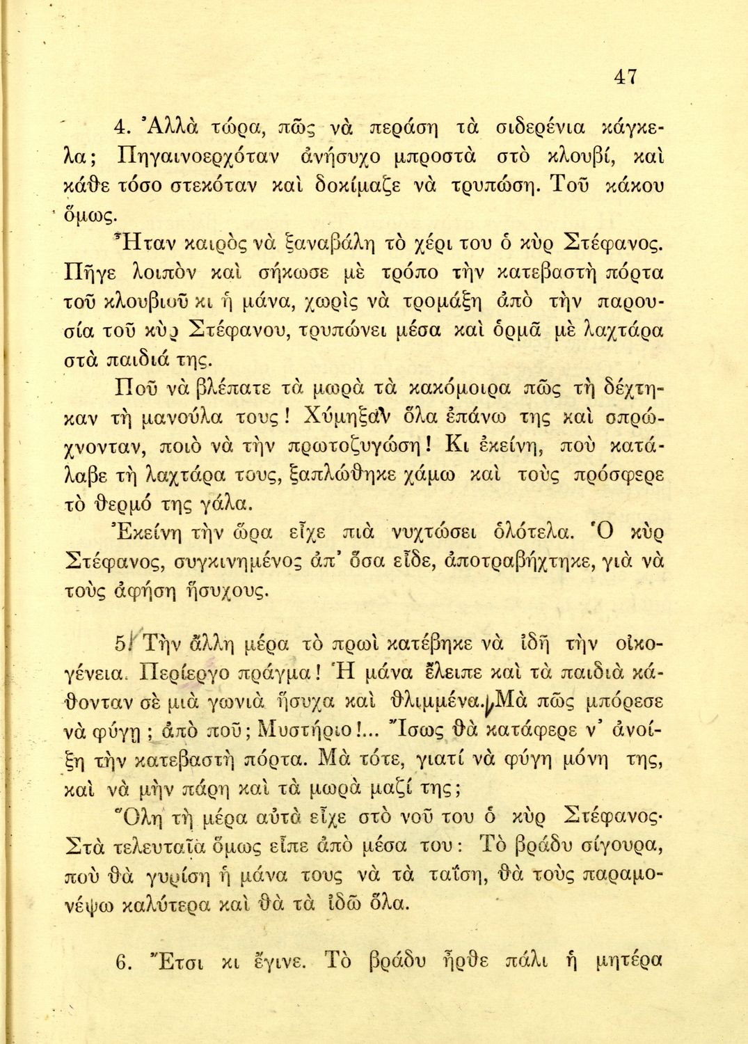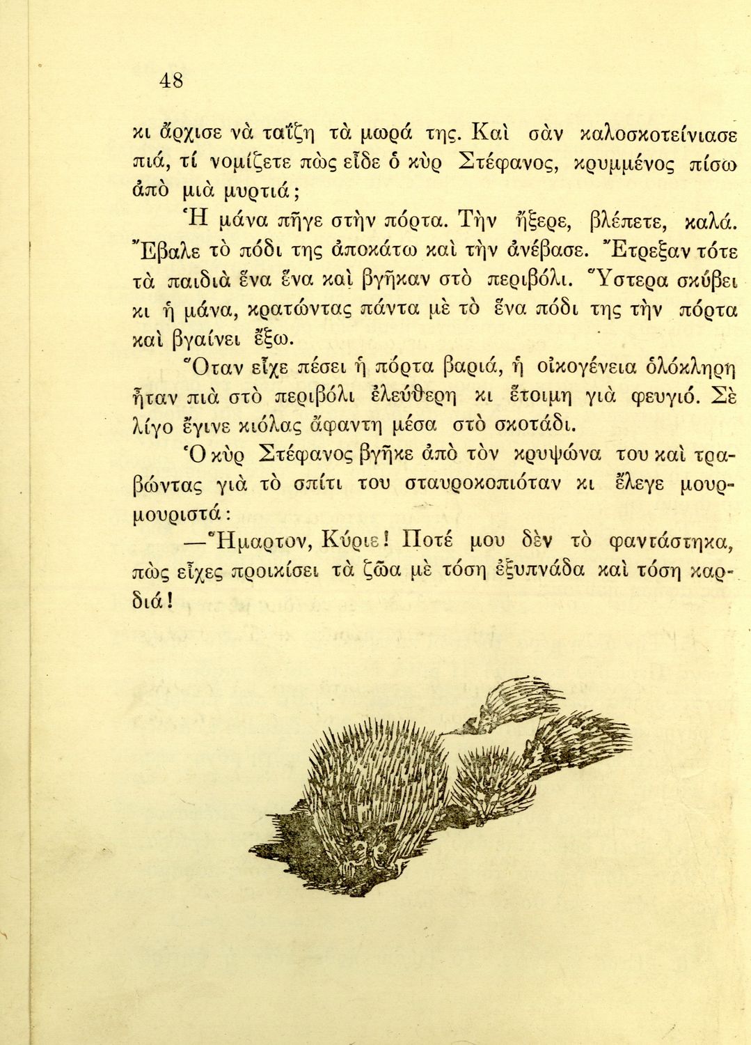 Αναγνωστικό Δ΄ Δημοτικού που περιέχει κείμενα εμπνευσμένα από την ζωή στην ύπαιθρο, την οικογενειακή ζωή, την αγάπη για τα ζώα, τη θρησκευτική παράδοση, την κοινωνική ζωή, την εθνική ζωή και προσήλωση στα εθνικά σύμβολα. 'Όντας σχολικό βιβλίο του μεταξικού καθεστώτος περιέχει χαρακτηριστικά δείγματα της μεταξικής προπαγάνδας και λογικής που παρουσιάζουν τον Ι. Μεταξά, ως μάγο, αρχηγό και κυβερνήτη της Ελλάδας. Όπως όλα τα βιβλία του καθεστώτος φέρει τη ρήση του Μεταξά "Είστε Ελληνόπουλα και είναι μεγάλο πράγμα να είναι κανείς Έλλην".