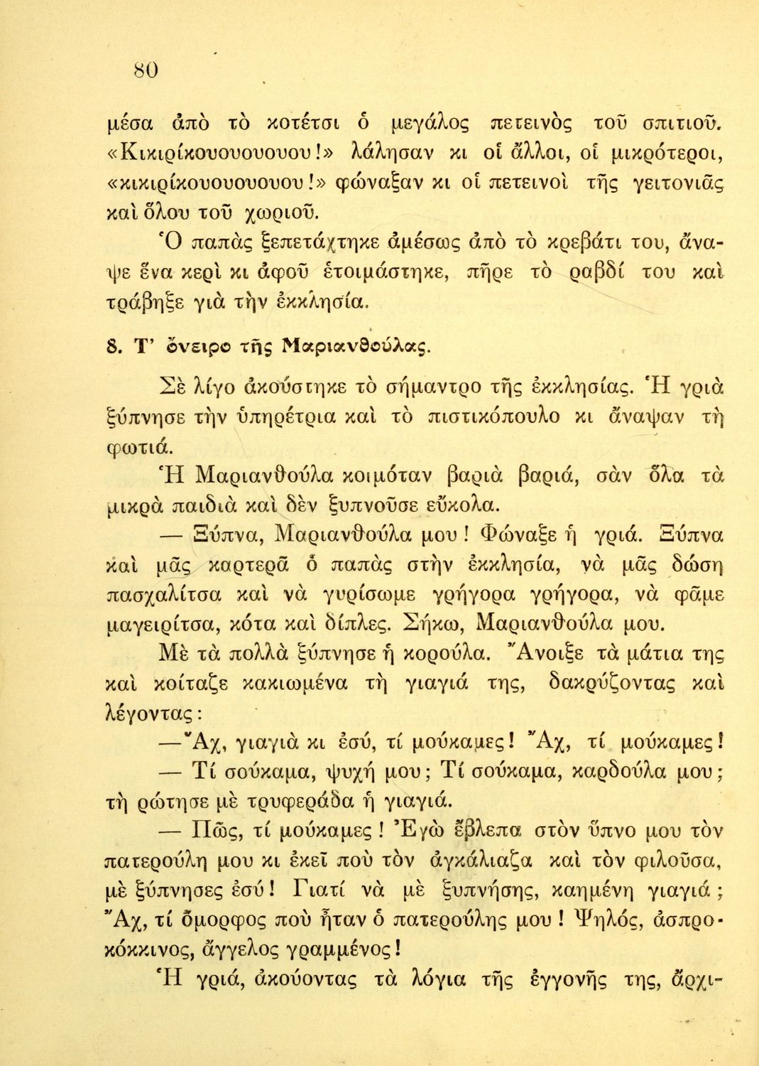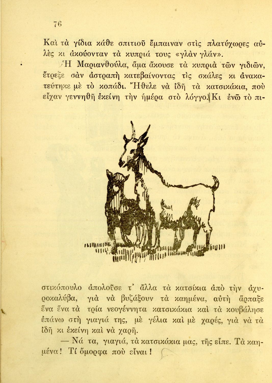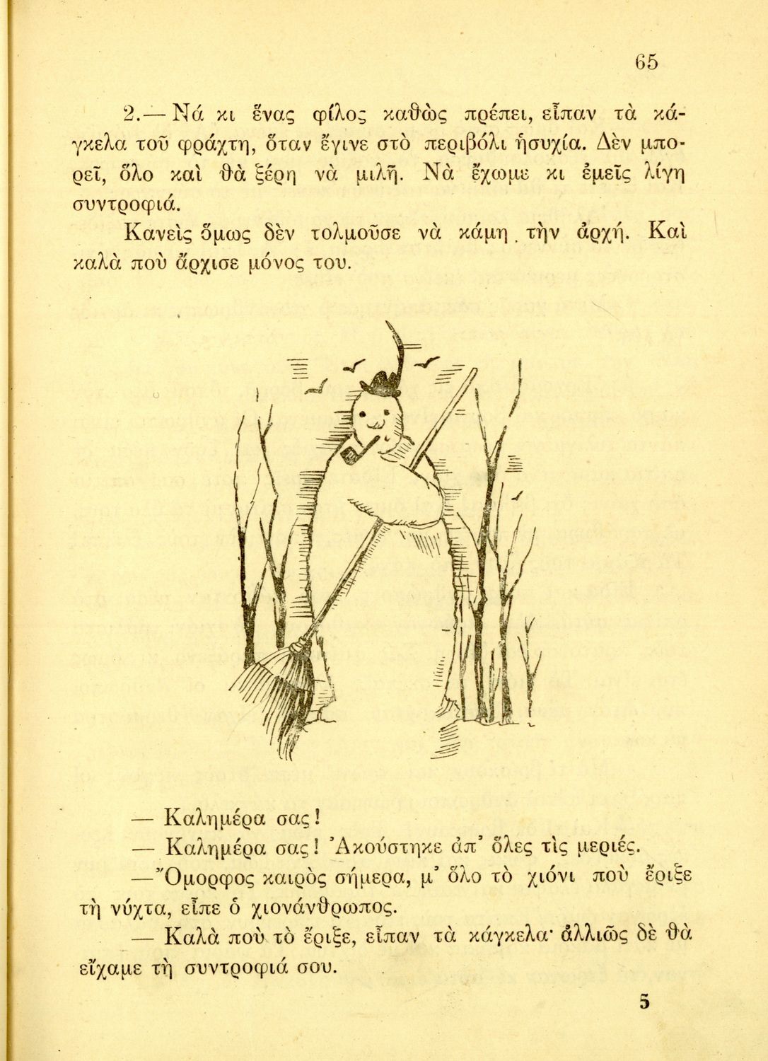 Αναγνωστικό Δ΄ Δημοτικού που περιέχει κείμενα εμπνευσμένα από την ζωή στην ύπαιθρο, την οικογενειακή ζωή, την αγάπη για τα ζώα, τη θρησκευτική παράδοση, την κοινωνική ζωή, την εθνική ζωή και προσήλωση στα εθνικά σύμβολα. 'Όντας σχολικό βιβλίο του μεταξικού καθεστώτος περιέχει χαρακτηριστικά δείγματα της μεταξικής προπαγάνδας και λογικής που παρουσιάζουν τον Ι. Μεταξά, ως μάγο, αρχηγό και κυβερνήτη της Ελλάδας. Όπως όλα τα βιβλία του καθεστώτος φέρει τη ρήση του Μεταξά "Είστε Ελληνόπουλα και είναι μεγάλο πράγμα να είναι κανείς Έλλην".