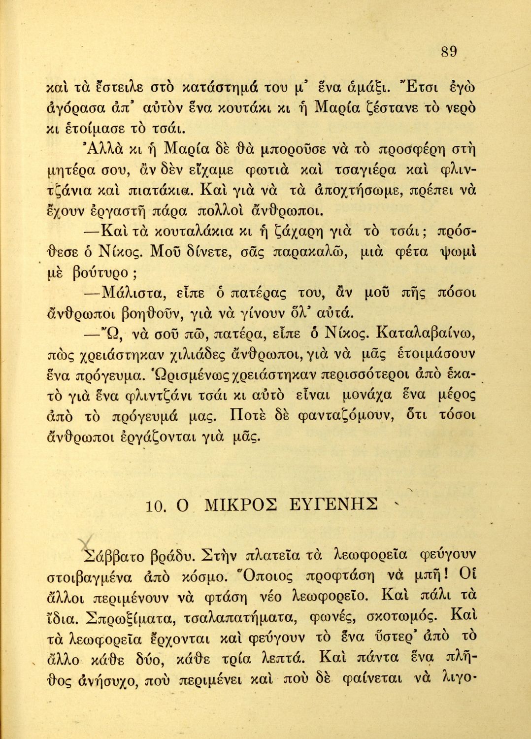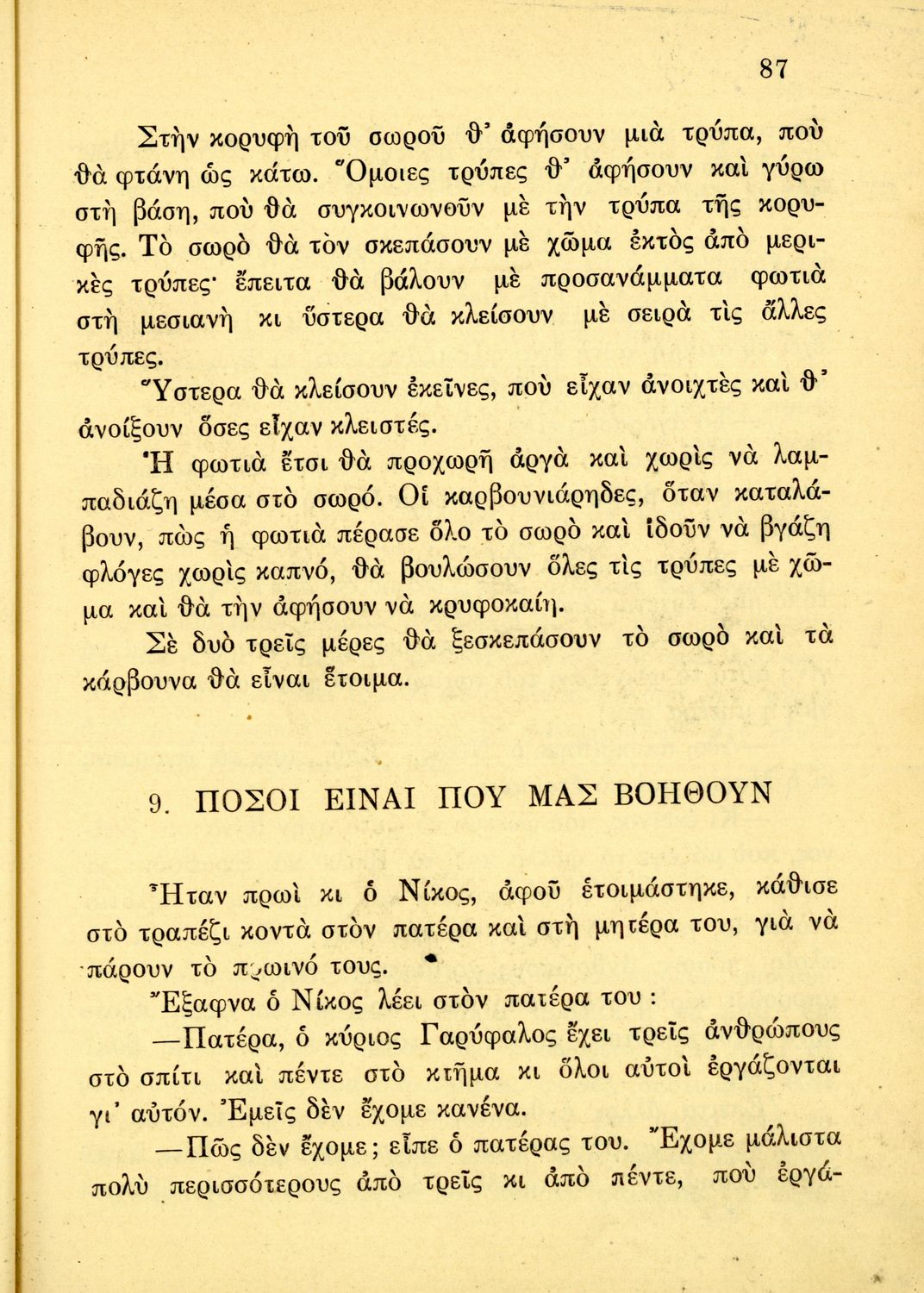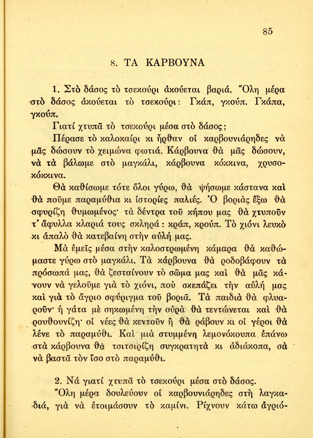 Αναγνωστικό Δ΄ Δημοτικού που περιέχει κείμενα εμπνευσμένα από την ζωή στην ύπαιθρο, την οικογενειακή ζωή, την αγάπη για τα ζώα, τη θρησκευτική παράδοση, την κοινωνική ζωή, την εθνική ζωή και προσήλωση στα εθνικά σύμβολα. 'Όντας σχολικό βιβλίο του μεταξικού καθεστώτος περιέχει χαρακτηριστικά δείγματα της μεταξικής προπαγάνδας και λογικής που παρουσιάζουν τον Ι. Μεταξά, ως μάγο, αρχηγό και κυβερνήτη της Ελλάδας. Όπως όλα τα βιβλία του καθεστώτος φέρει τη ρήση του Μεταξά "Είστε Ελληνόπουλα και είναι μεγάλο πράγμα να είναι κανείς Έλλην".