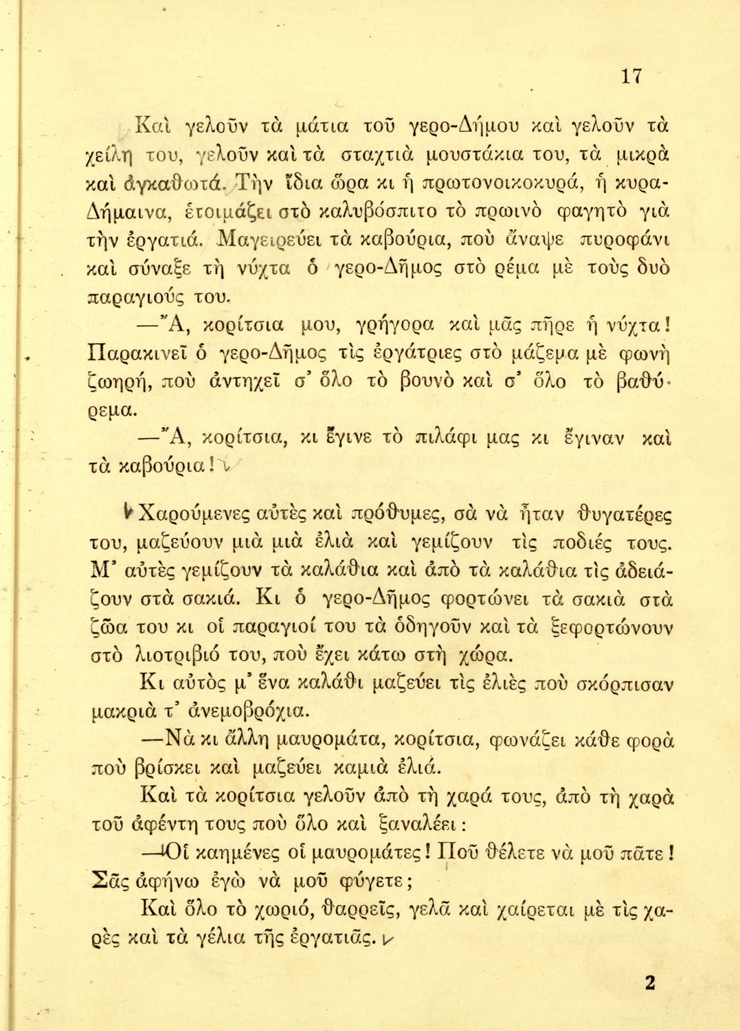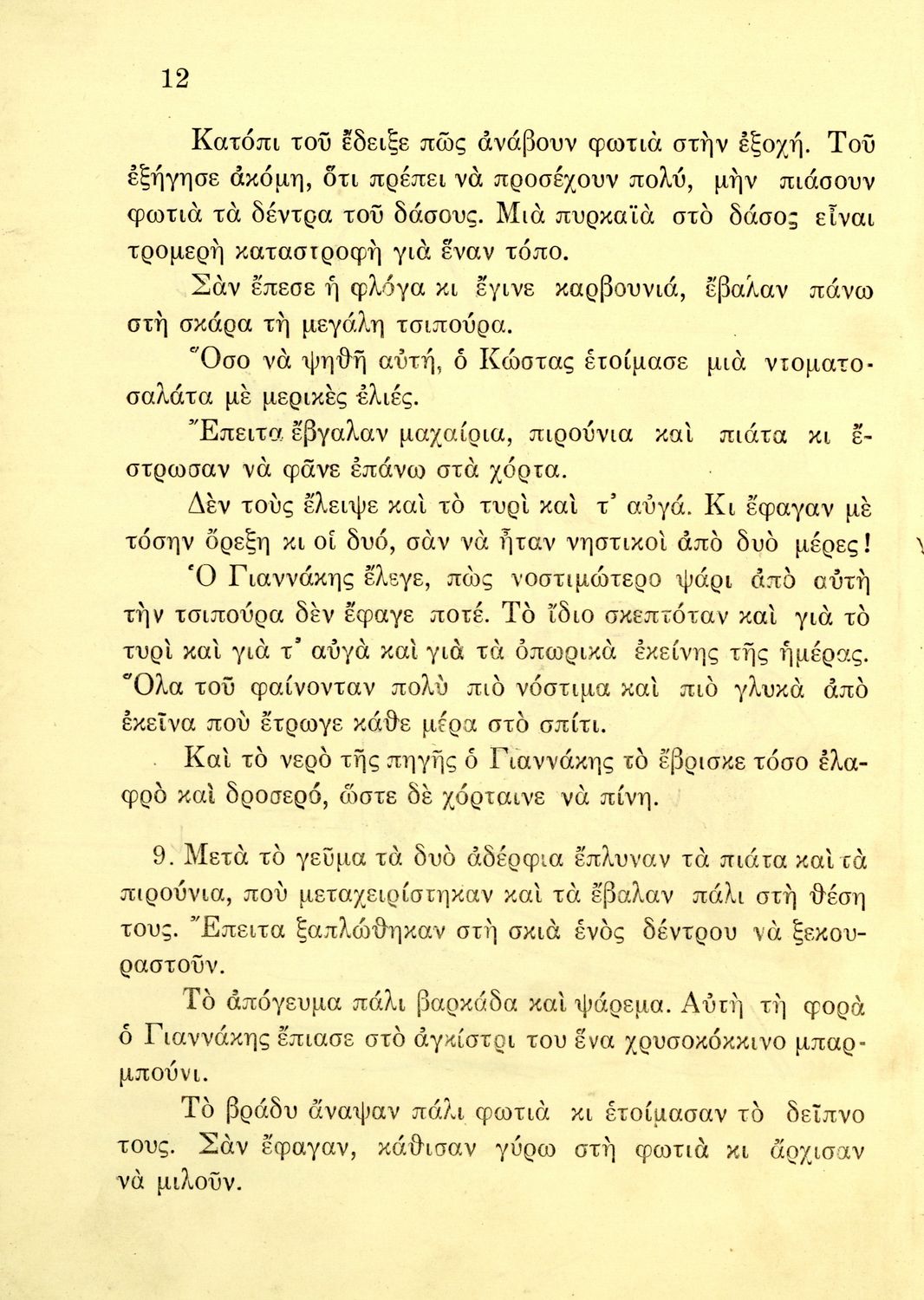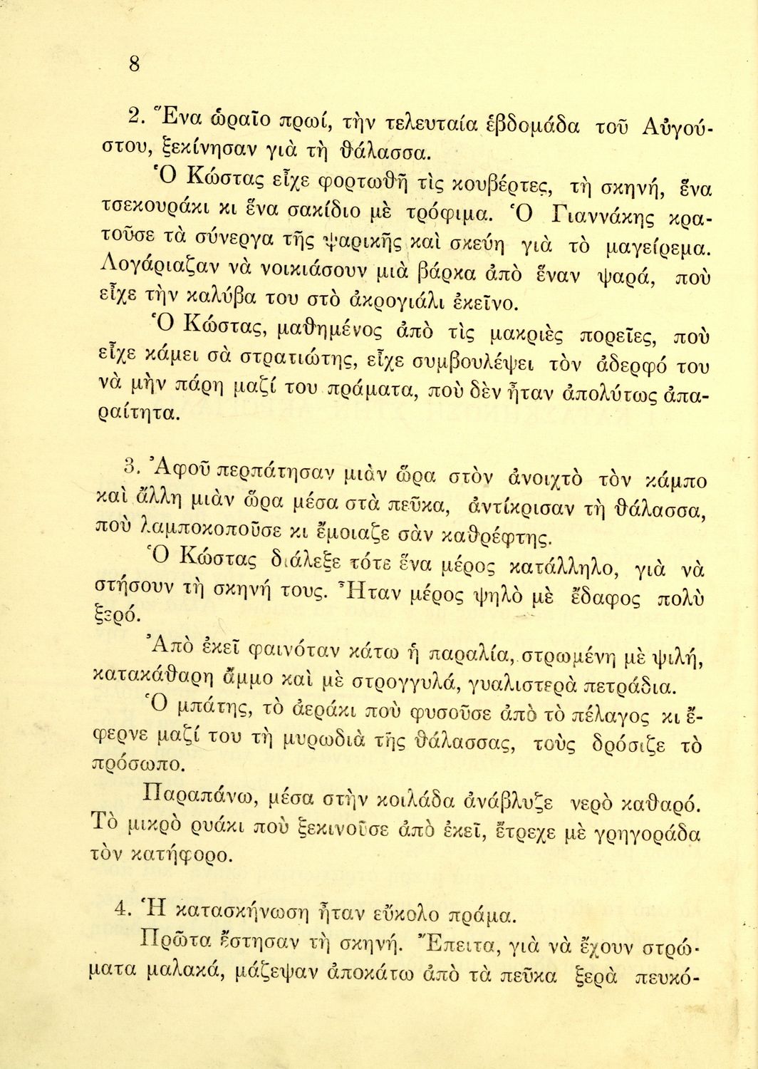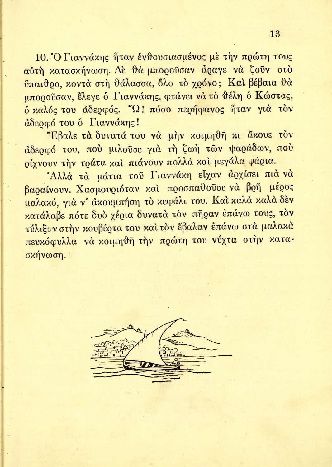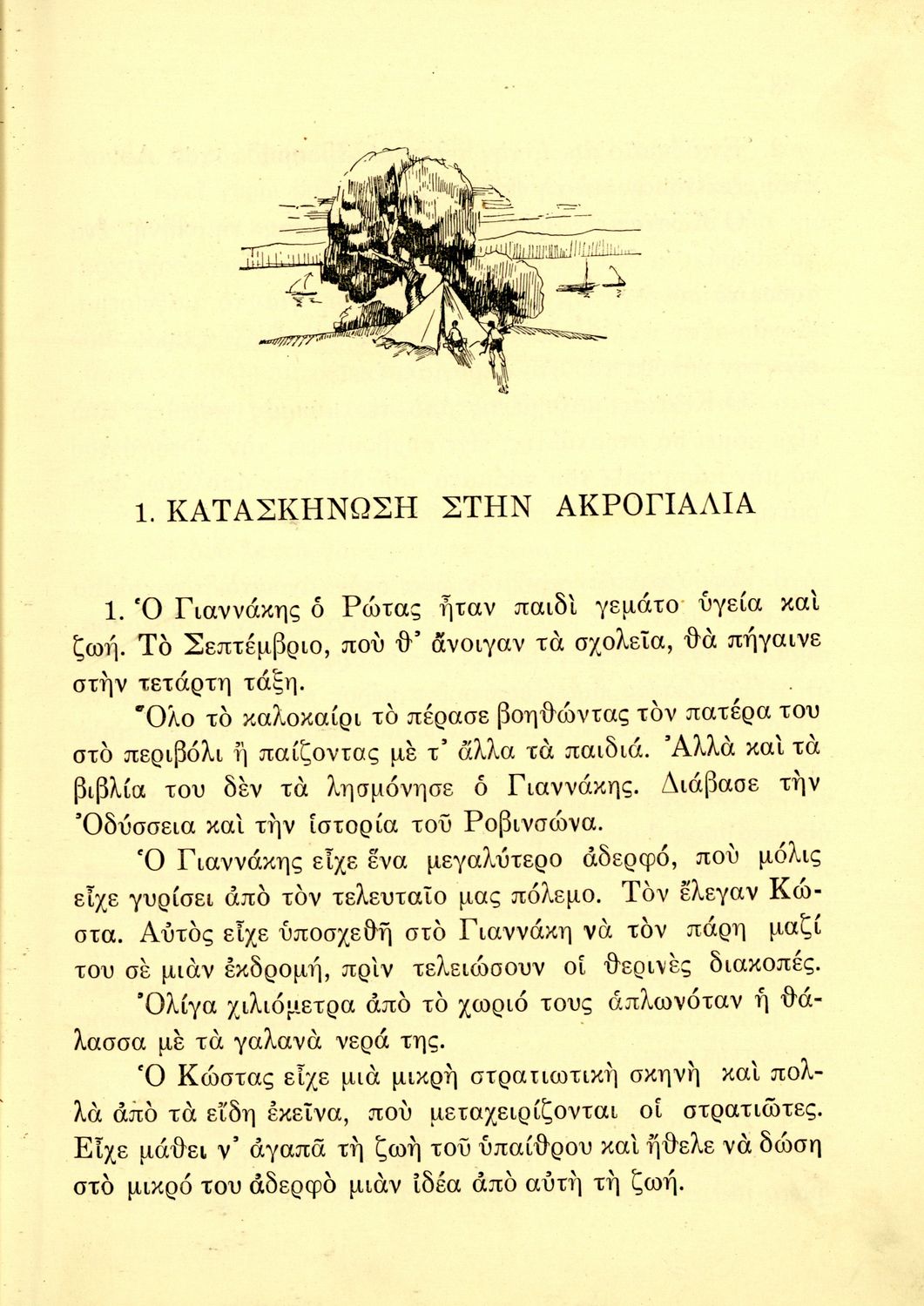 Αναγνωστικό Δ΄ Δημοτικού που περιέχει κείμενα εμπνευσμένα από την ζωή στην ύπαιθρο, την οικογενειακή ζωή, την αγάπη για τα ζώα, τη θρησκευτική παράδοση, την κοινωνική ζωή, την εθνική ζωή και προσήλωση στα εθνικά σύμβολα. 'Όντας σχολικό βιβλίο του μεταξικού καθεστώτος περιέχει χαρακτηριστικά δείγματα της μεταξικής προπαγάνδας και λογικής που παρουσιάζουν τον Ι. Μεταξά, ως μάγο, αρχηγό και κυβερνήτη της Ελλάδας. Όπως όλα τα βιβλία του καθεστώτος φέρει τη ρήση του Μεταξά "Είστε Ελληνόπουλα και είναι μεγάλο πράγμα να είναι κανείς Έλλην".