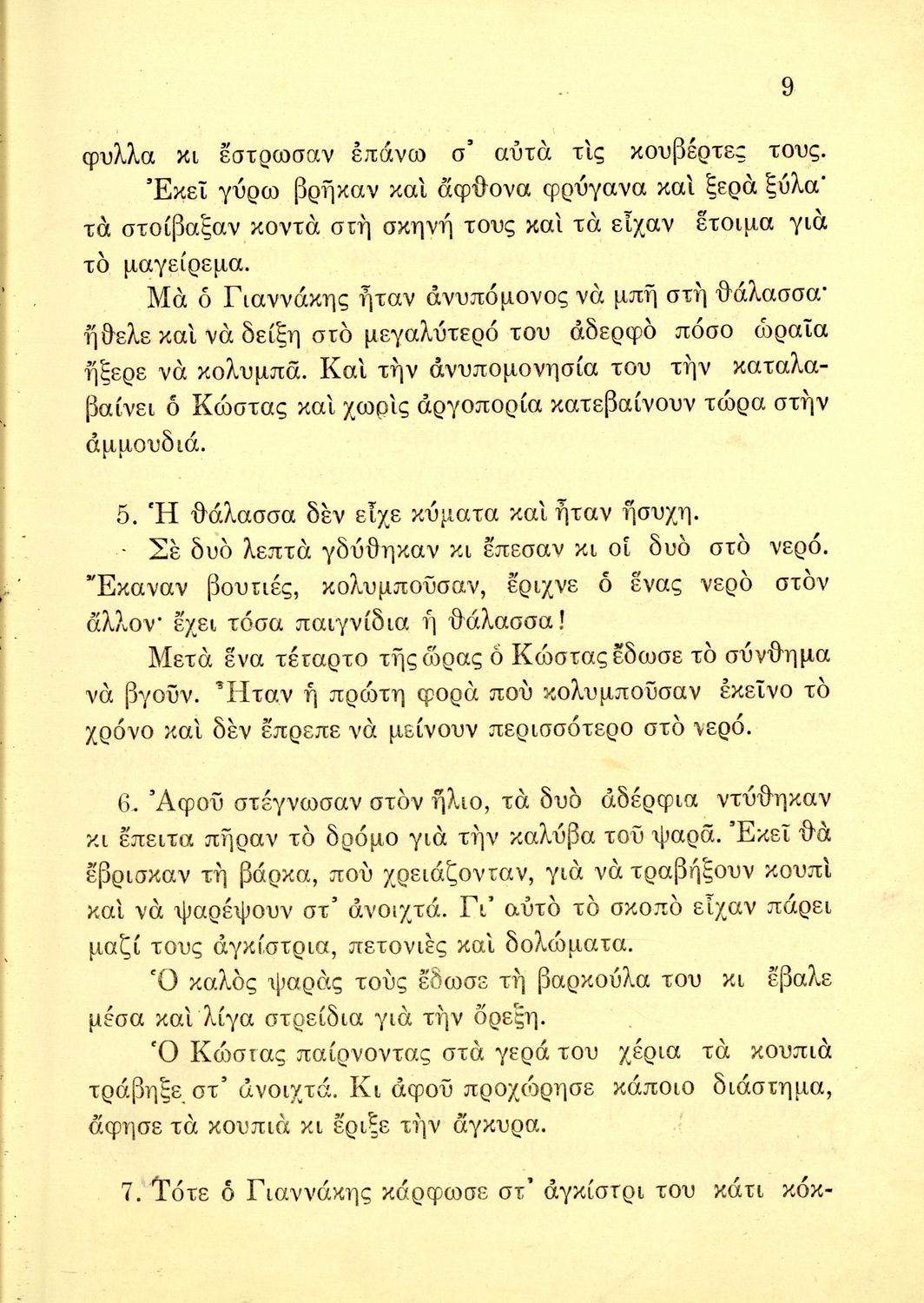 Αναγνωστικό Δ΄ Δημοτικού που περιλαμβάνει θέματα από την θρησκευτική, οικογενειακή και σχολική ζωή του παιδιού, την ελληνική μυθολογία και ιστορία και τη ζωή των ζώων.