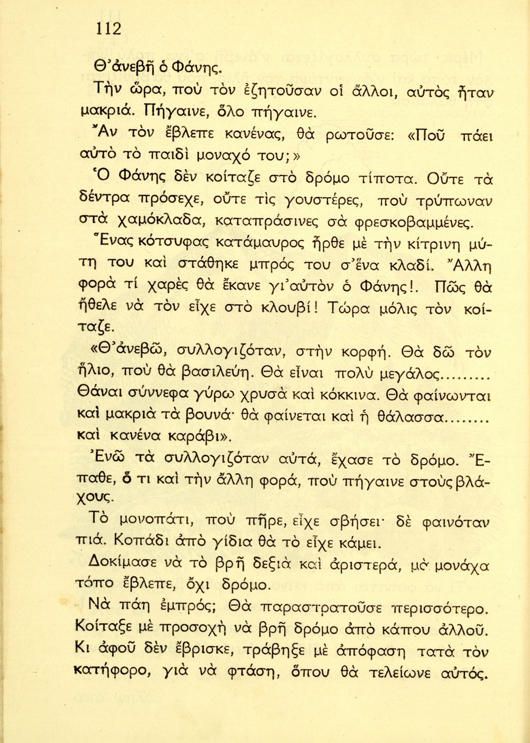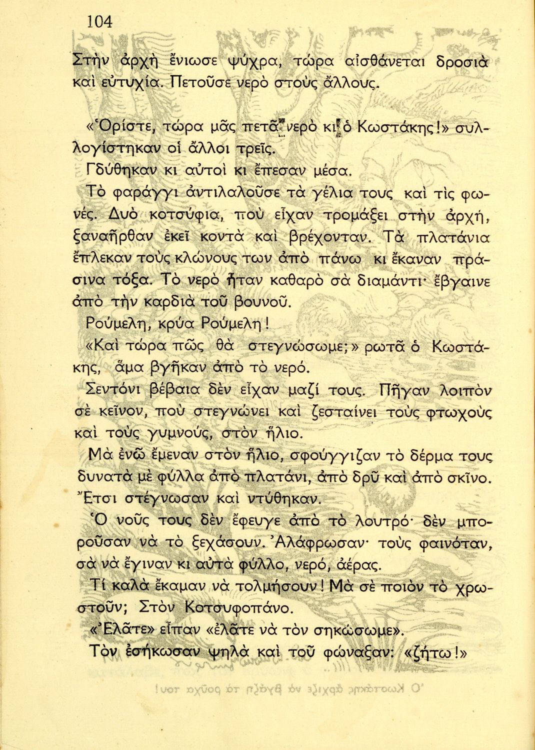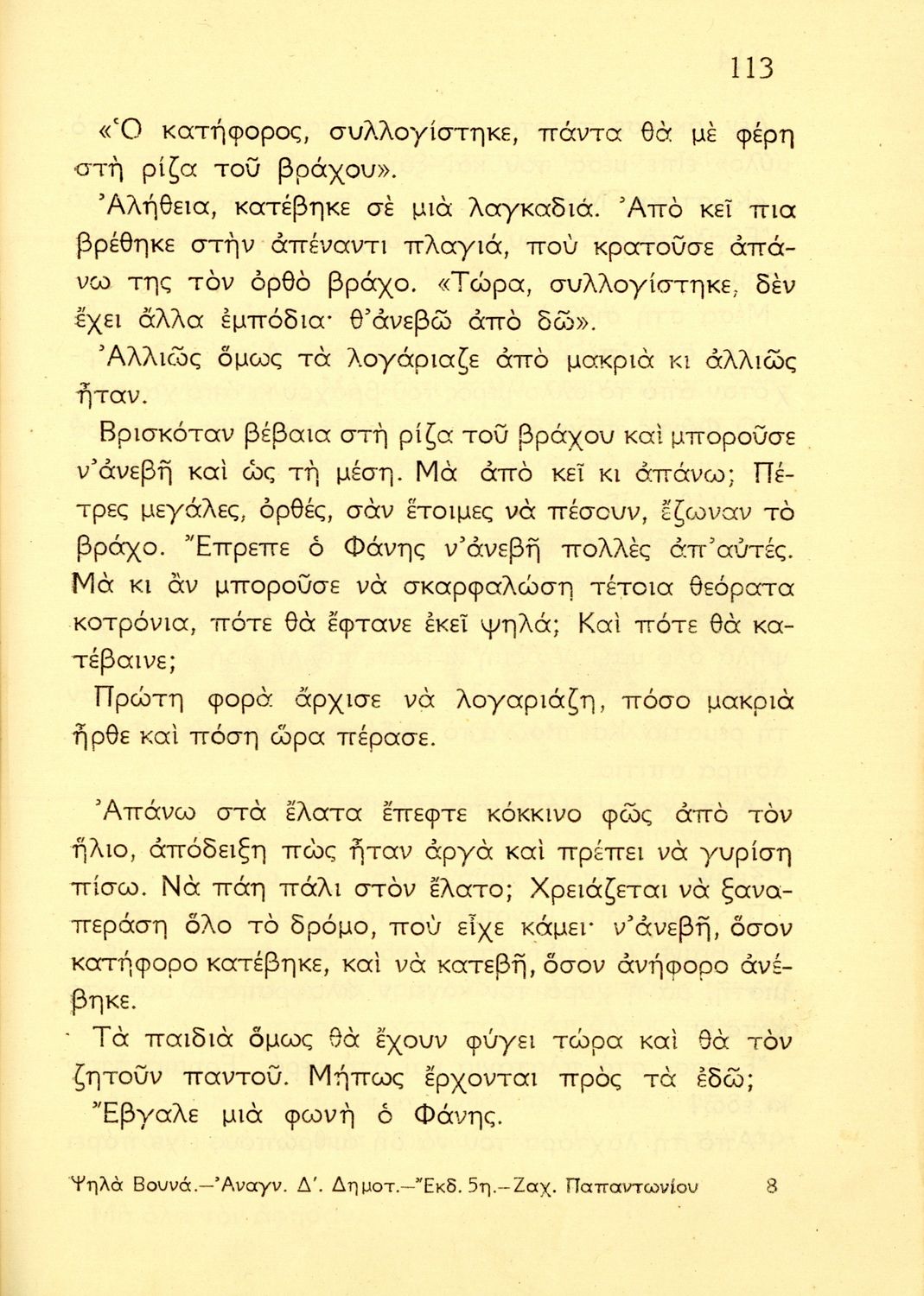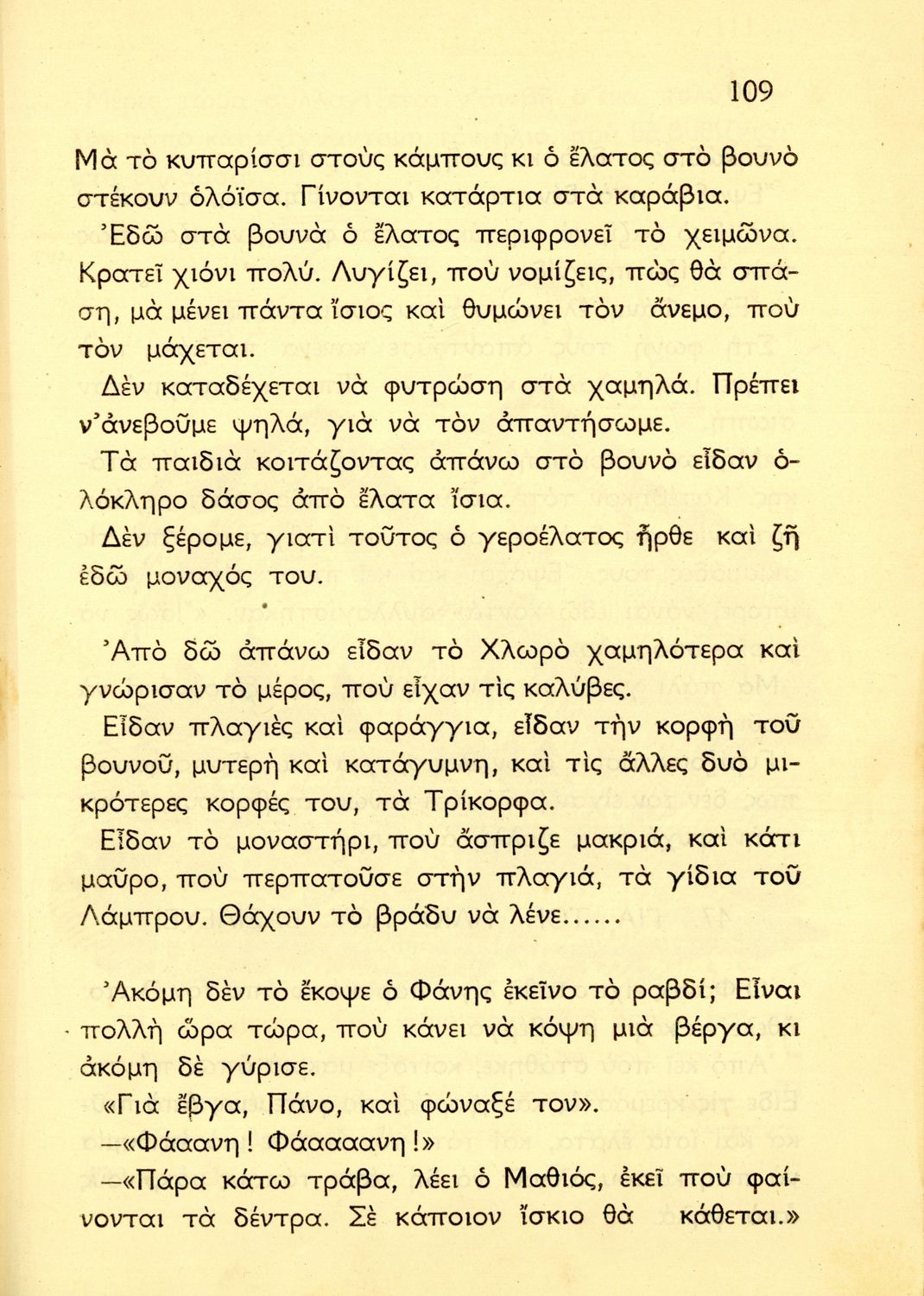 Αναγνωστικό Δ΄ Δημοτικού που περιέχει πεζά και ποιήματα με περιεχόμενο διδακτικό και ηθικοπλαστικό εμπνευσμένα από την ελληνική ιστορία και μυθολογία, και την αγροτική και κοινωνική ζωή.