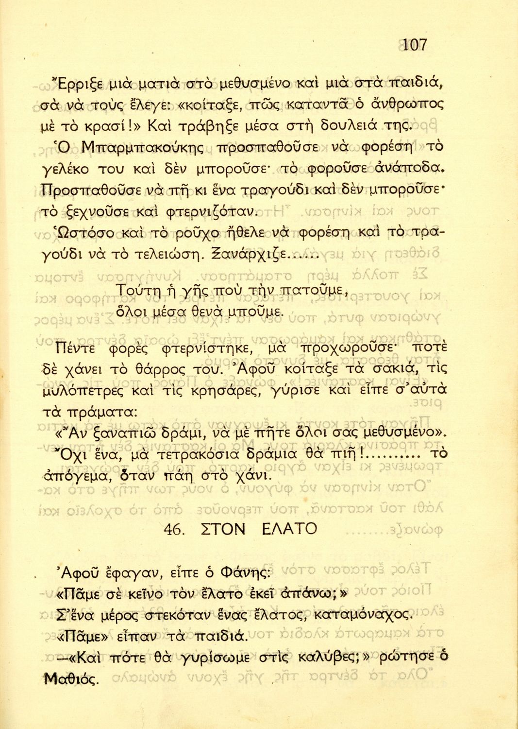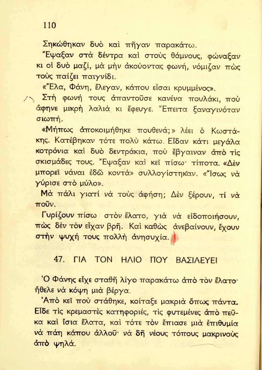 Αναγνωστικό για την Δ΄ τάξη του Δημοτικού. Περιλαμβάνει ένα κείμενο στο οποίο παρεμβάλλονται ποιήματα δημοτικά και Ελλήνων ποιητών.