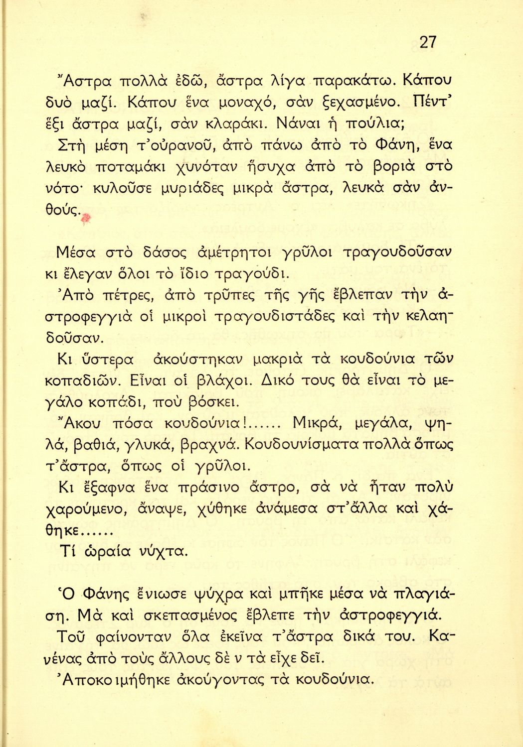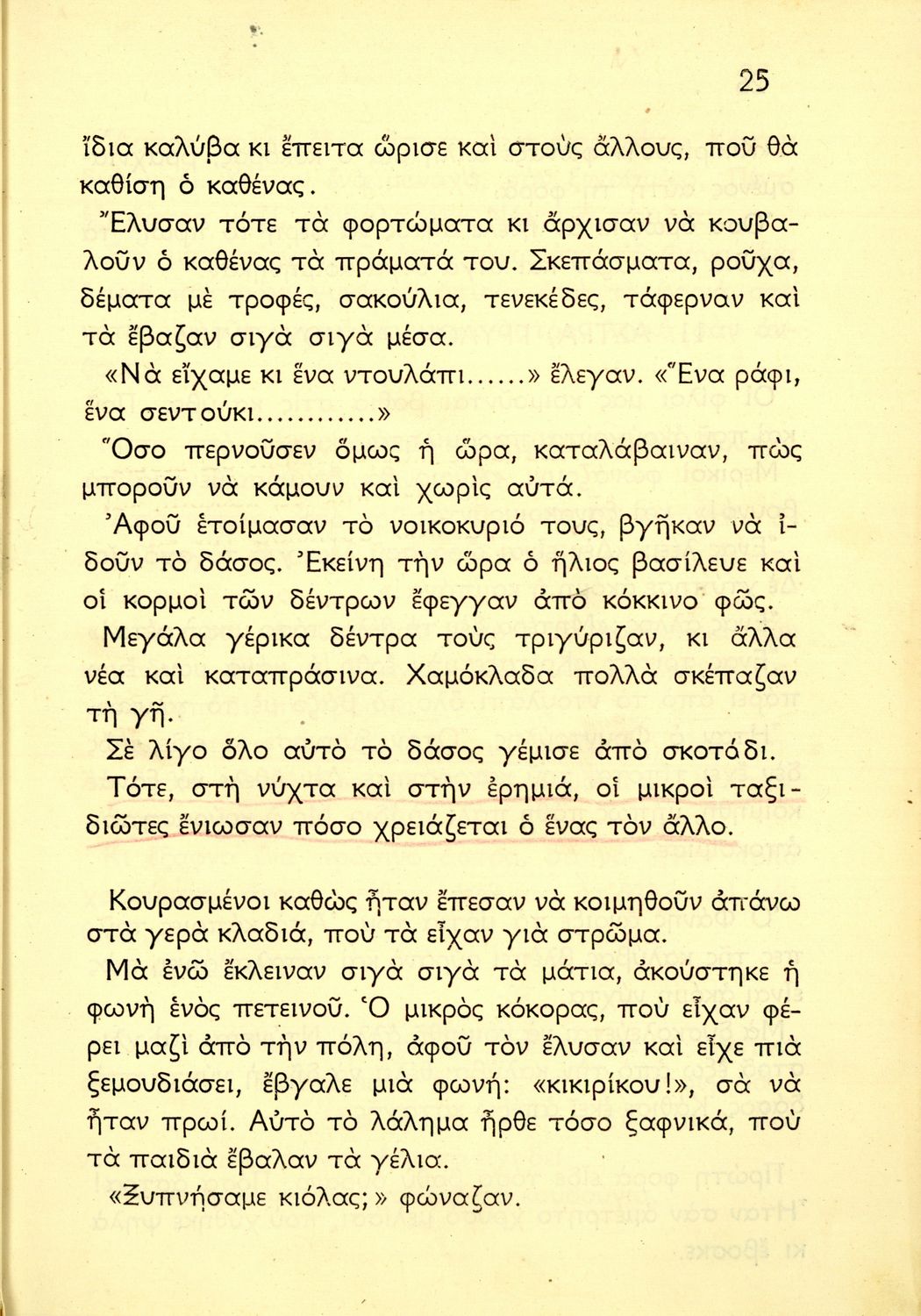 Αναγνωστικό για την Δ΄ τάξη του Δημοτικού. Περιλαμβάνει ένα κείμενο στο οποίο παρεμβάλλονται ποιήματα δημοτικά και Ελλήνων ποιητών.